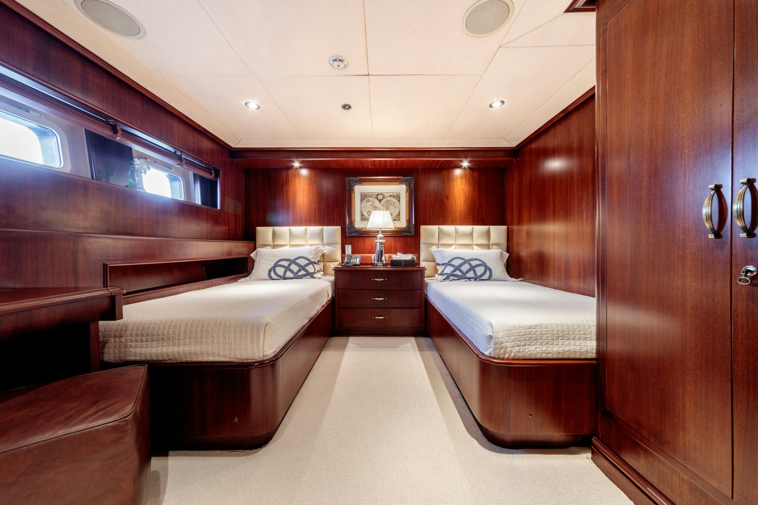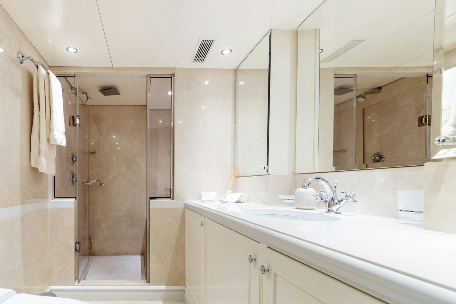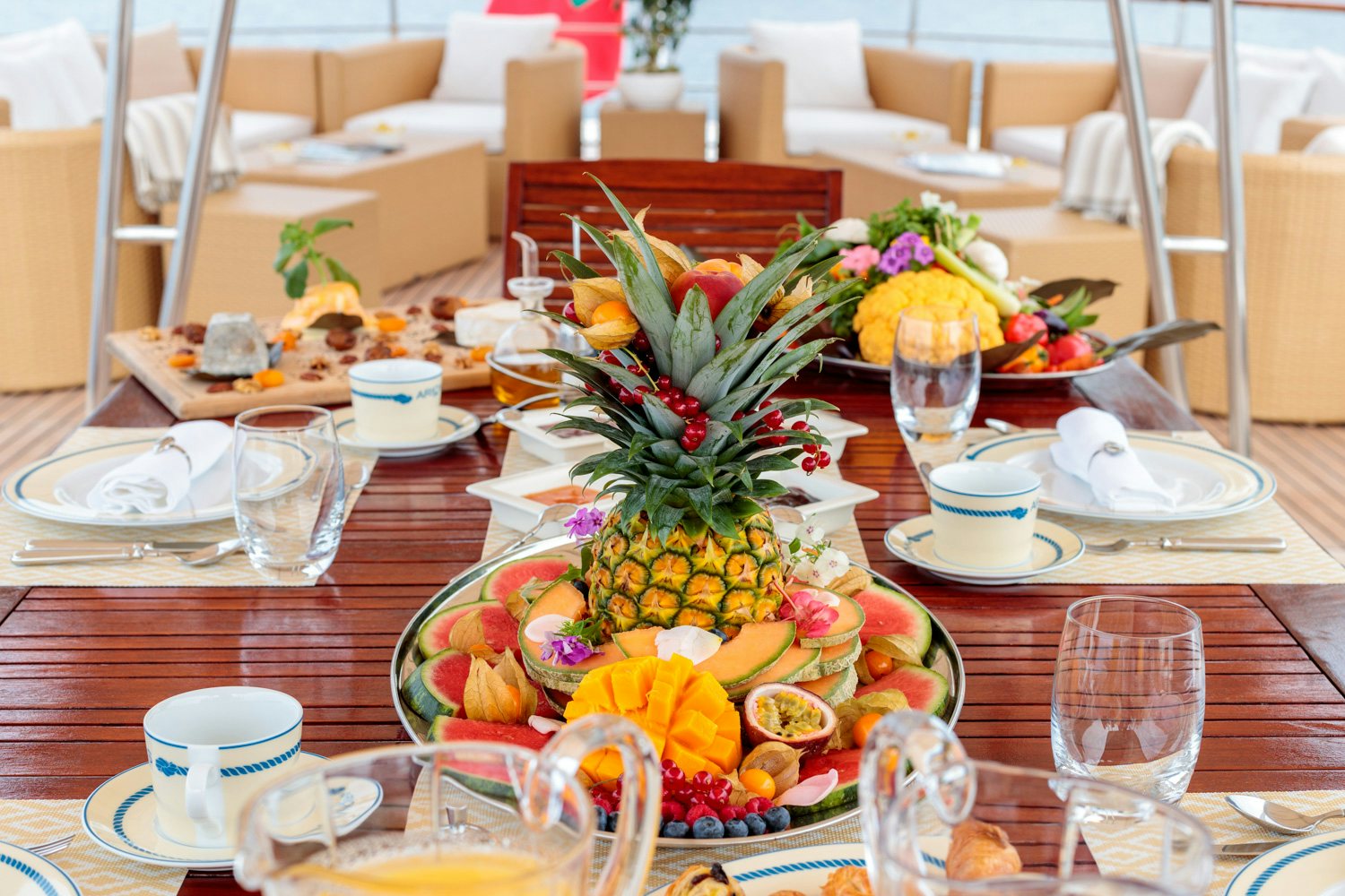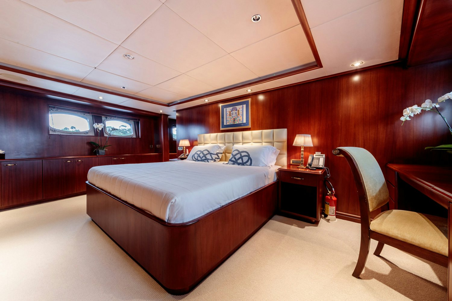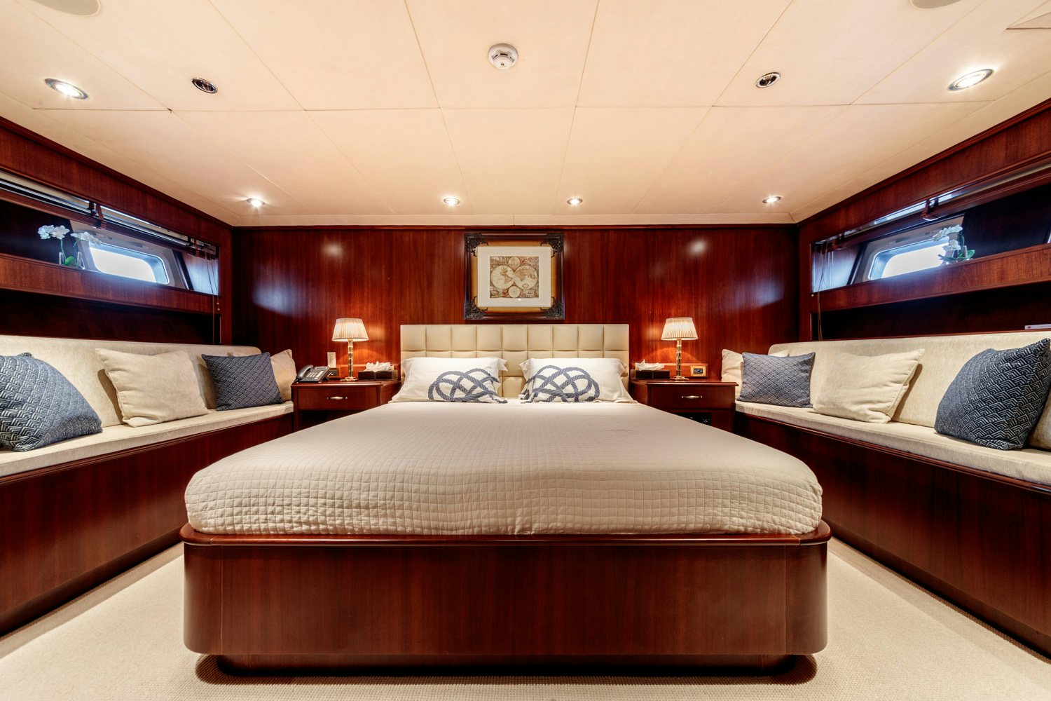 Charter yacht ARIONAS welcomes up to 10 guests in her five beautifully appointed staterooms. Giving guests added privacy, the staterooms are located across the yacht’s three levels. The charter yacht’s full-beam master suite is located forward on the main deck. Providing a haven, the suite features a centerline queen bed, a walk-in closet and a large en-suite bath. On the upper deck, is an inviting VIP with a queen-sized bed and en-suite bath. The additional three staterooms aboard ARIONAS are located on the lower deck. They include a full-beam VIP queen stateroom and two twin-bed staterooms. Each is complete with an en-suite bath.