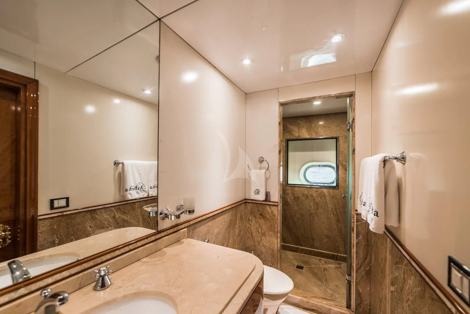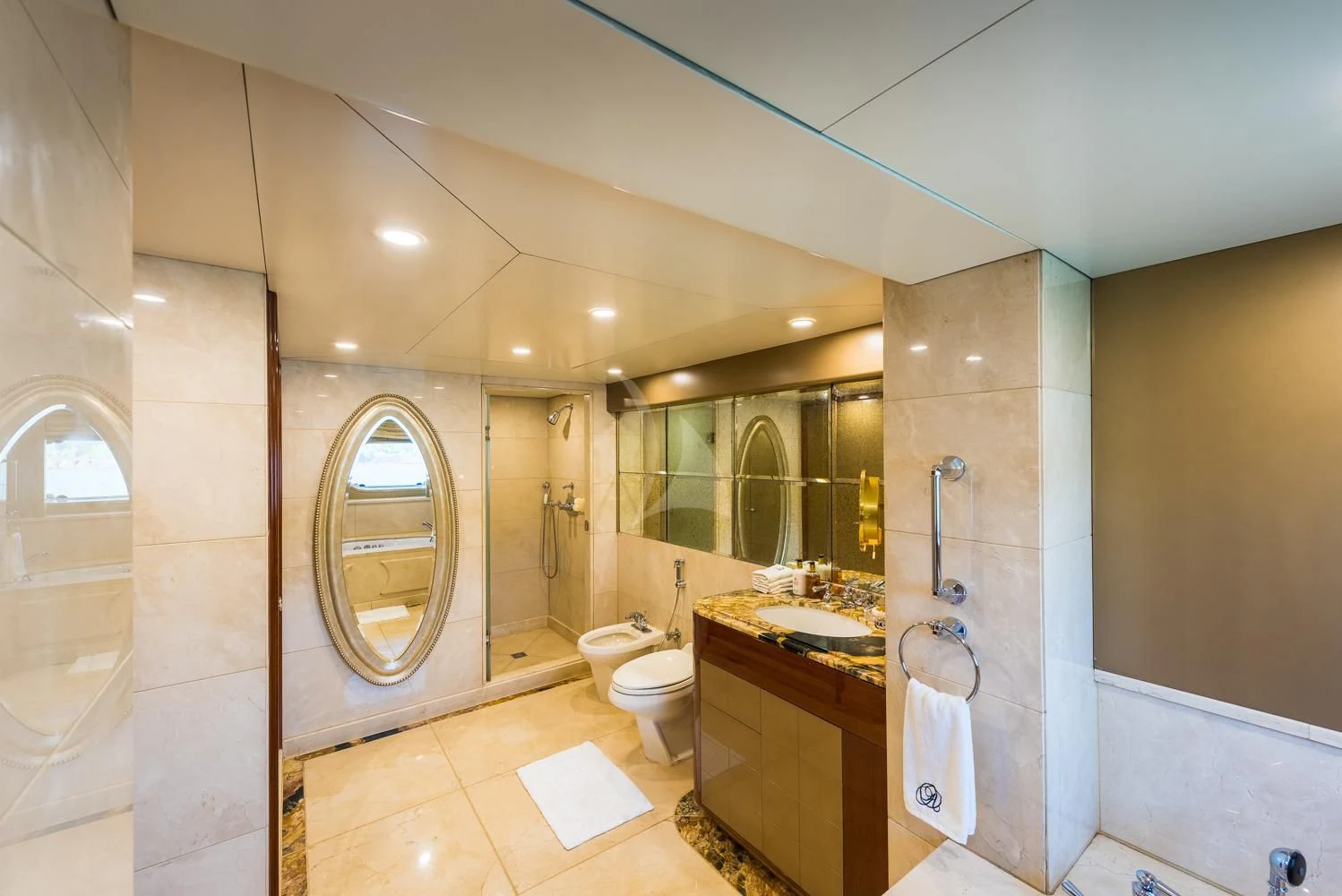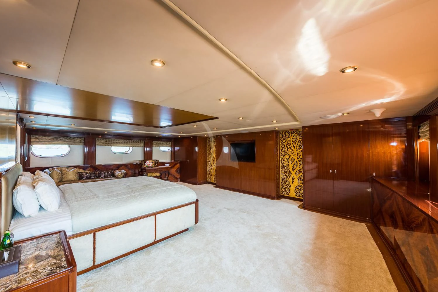 Flexible accommodations provide a welcoming retreat for up to 12 guests in six spacious staterooms. The spectacular owner’s stateroom spans the entire width of the main deck and features his-and-hers ensuite bathrooms and private Jacuzzi. Two VIP staterooms and two twin cabins with additional Pullman bunks can be found on the lower deck, while the lounge on the bridge deck can be converted into a comfortable double with queen size bed and ensuite bathroom.