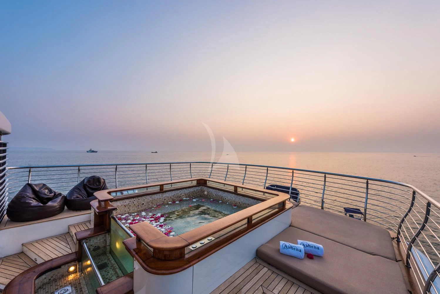 ASHENA’s beautifully styled outdoor living spaces are just as exquisite as her interiors. Her sun deck is the perfect place to spend the day relaxing in the 10-person Jacuzzi or topping up your tan on the sun loungers. Enjoy a cooling cocktail at the stunning mosaic bar on the sun deck before enjoying an alfresco dinner on the main deck below.