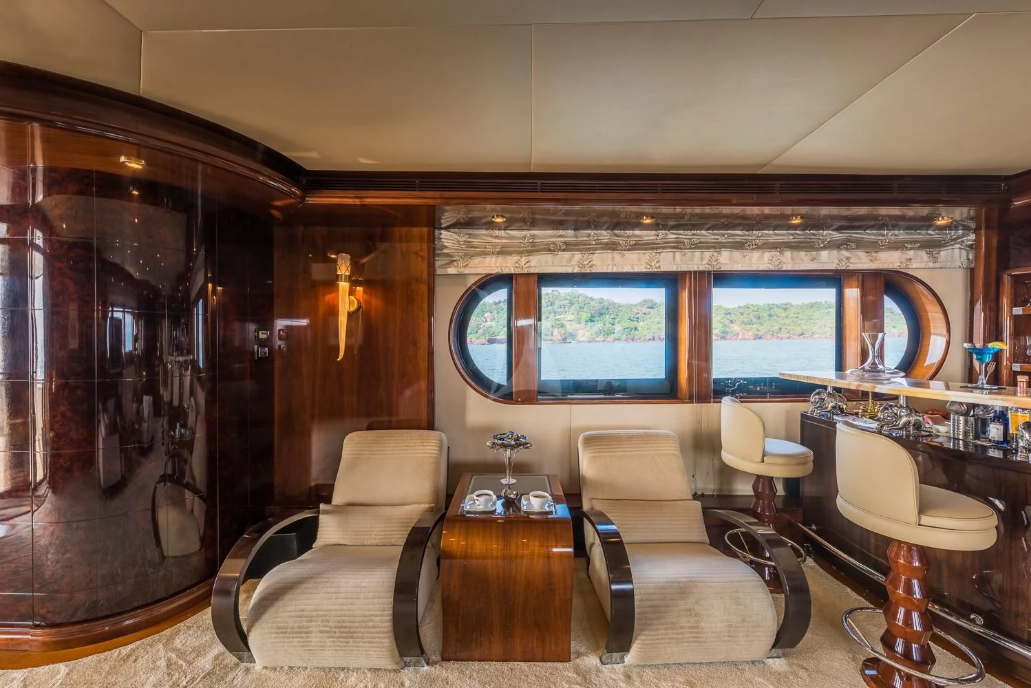 Neutral tones and decadent high gloss wood paneling dominate the interiors which are traditional in their styling but supremely comfortable. The main salon has an elaborate wooden bar and comfy cream furnishings as well as a beautiful round formal dining table and bespoke circular light fitting with decorative etched glass. The sky lounge is equally spacious and has room to host 24 for cocktails in port or family popcorn and film nights.