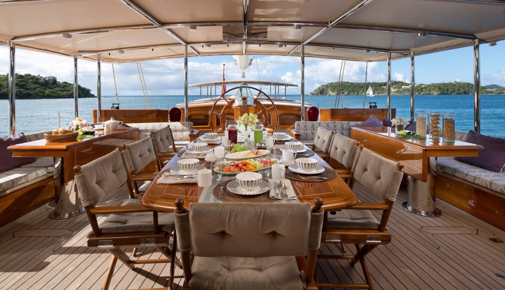 Outdoors, the cockpit dining space offers spectacular views during an alfresco meal. The master cockpit can be turned into secluded massage table.