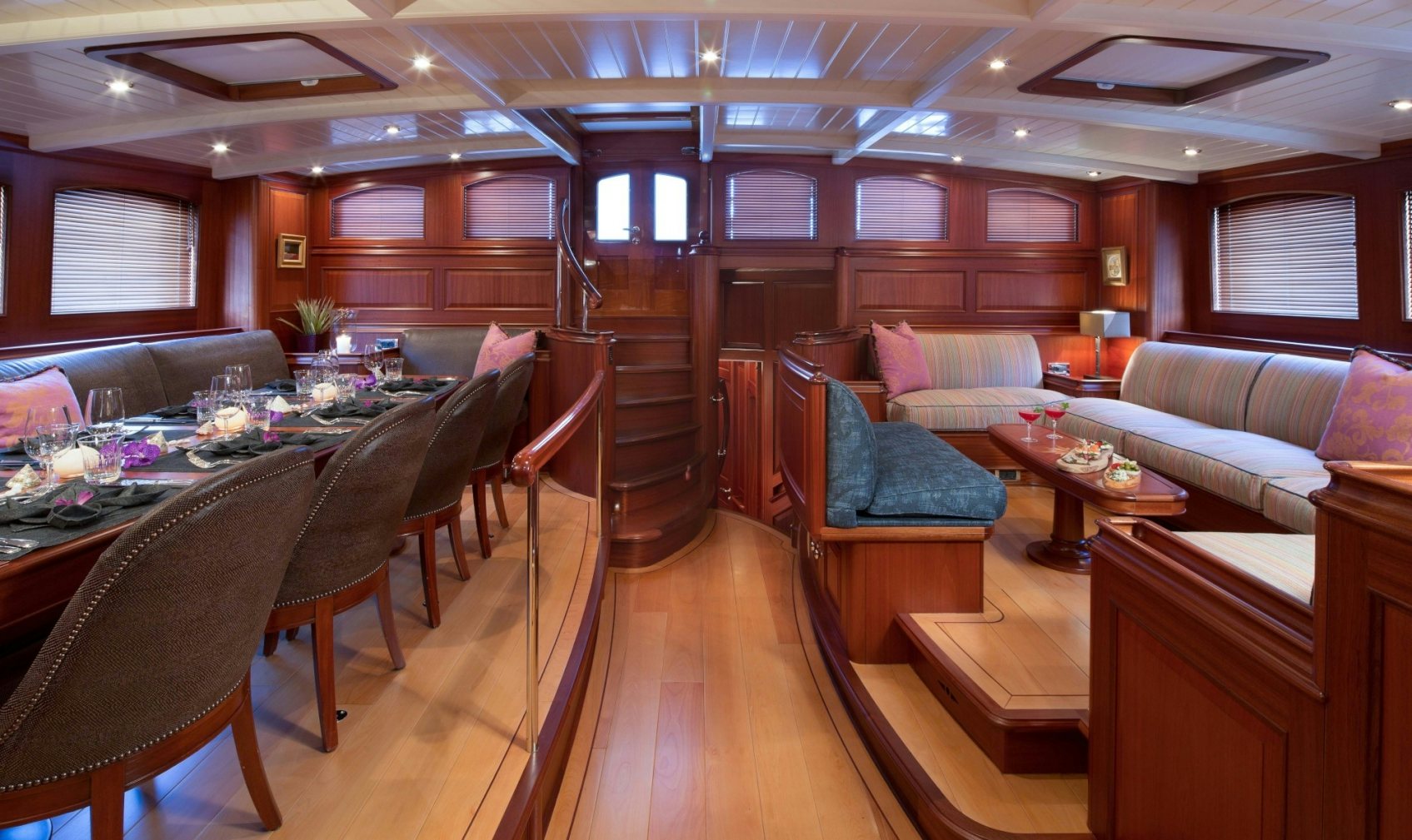 The main salon feels like home with a fireplace and comfortable seating. Starboard, the deckhouse has a large dining table to accommodate up to 12 guests. To port a coffee table and cozy seating area is a sublime spot for morning coffees and teas. A bar forward is a favorite guest space.