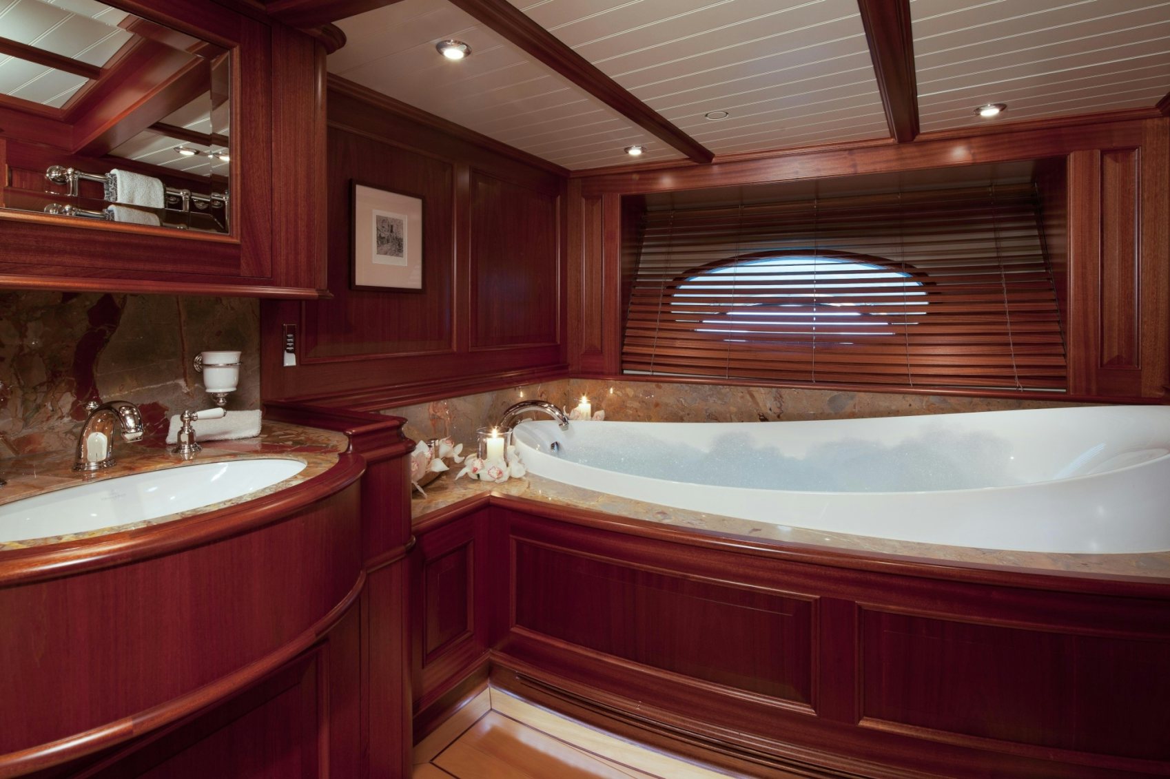 ATHOS can accommodate up to 10 guests in five exceptionally appointed cabins. Her master suite is finished in sumptuous mahogany and offers a king-size double bed, a desk, daybed for lounging and a settee. Her en-suite bath has a shower/steam room and his-and-hers sinks. The master is connected to a private aft deckhouse with secluded seating space and daybed. It also has a private office. This space opens to a sheltered cockpit with adjustable table. Four additional guest cabins are finished in various woods, giving each a unique ambience and flair. Each also has an en-suite bath.