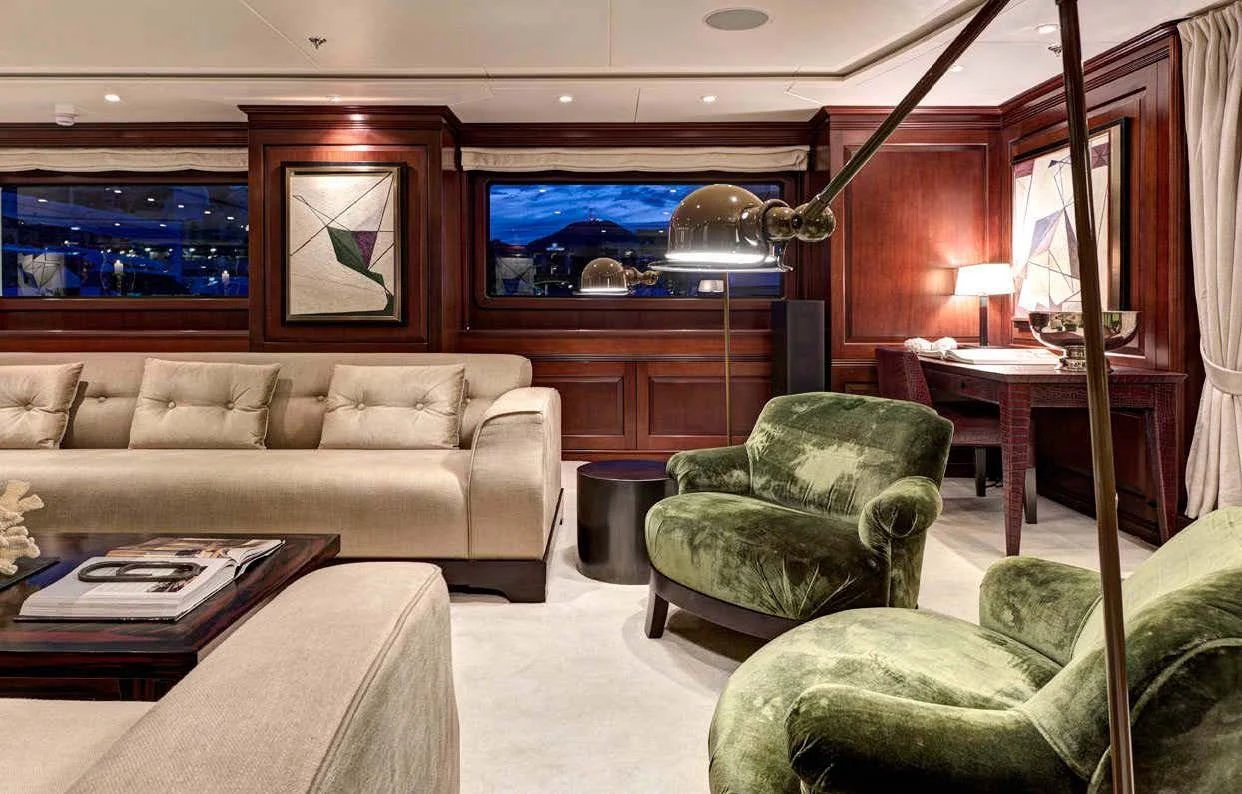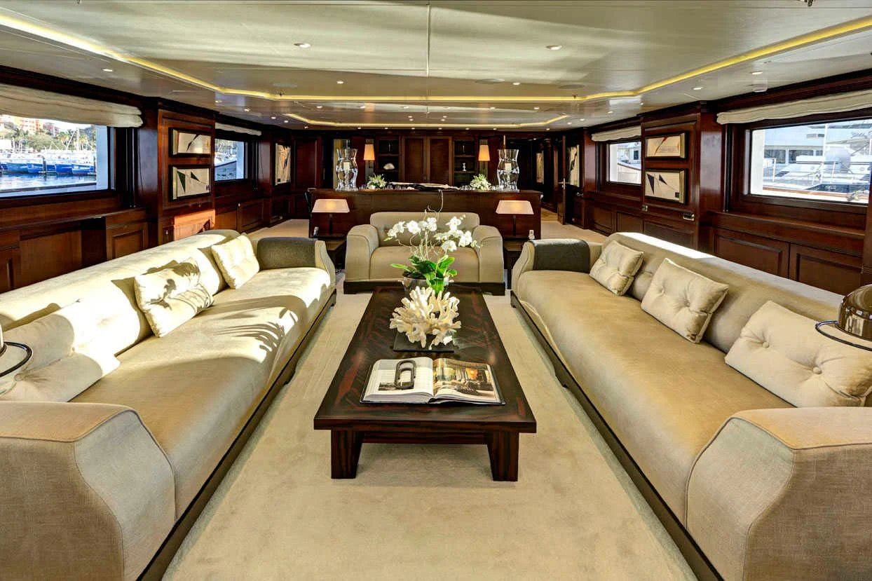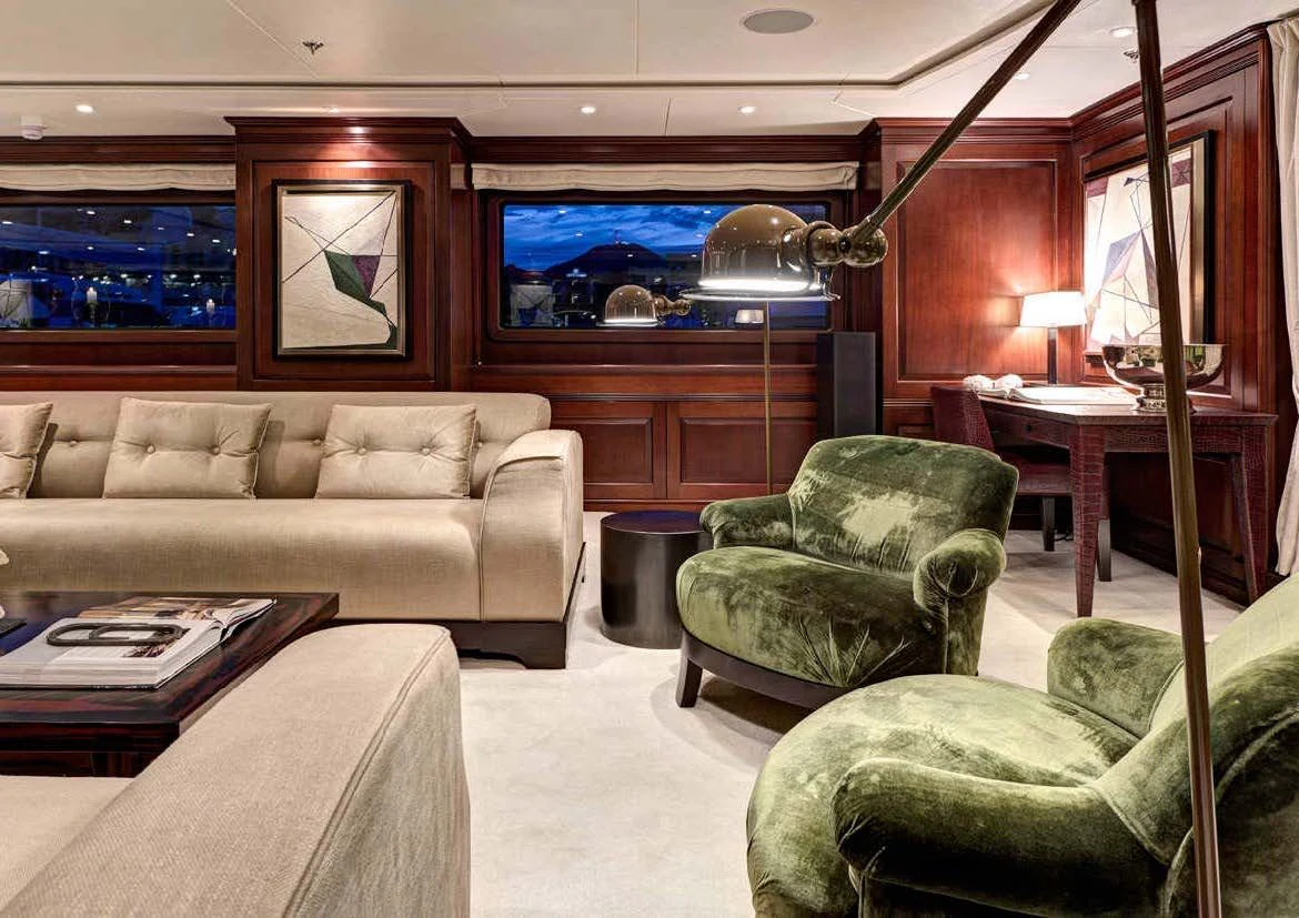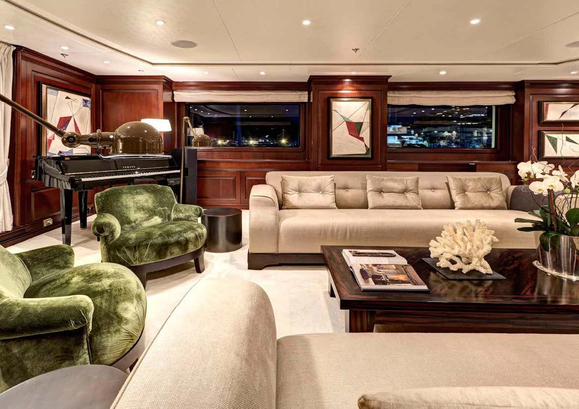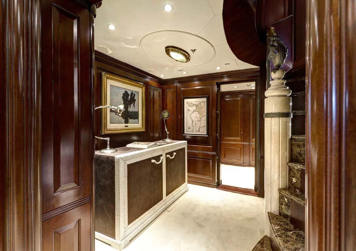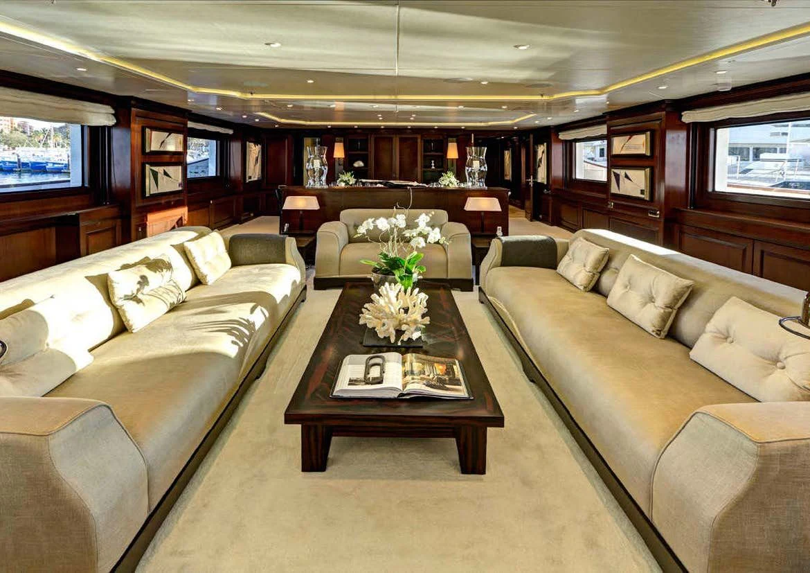 The slightly contemporary lines of AZTECA II’s exterior styling are mirrored by her beautiful interior design, which is classically stylish with subtle incorporation of modern aspects. Plush cream carpets are paired with dark woods and highlighted with olive and metallic furnishings to create an atmosphere of timeless decadence. Striking art pieces and hints of her Turkish origins add a touch of exotic modernity to her AZTECA II’s unique style.