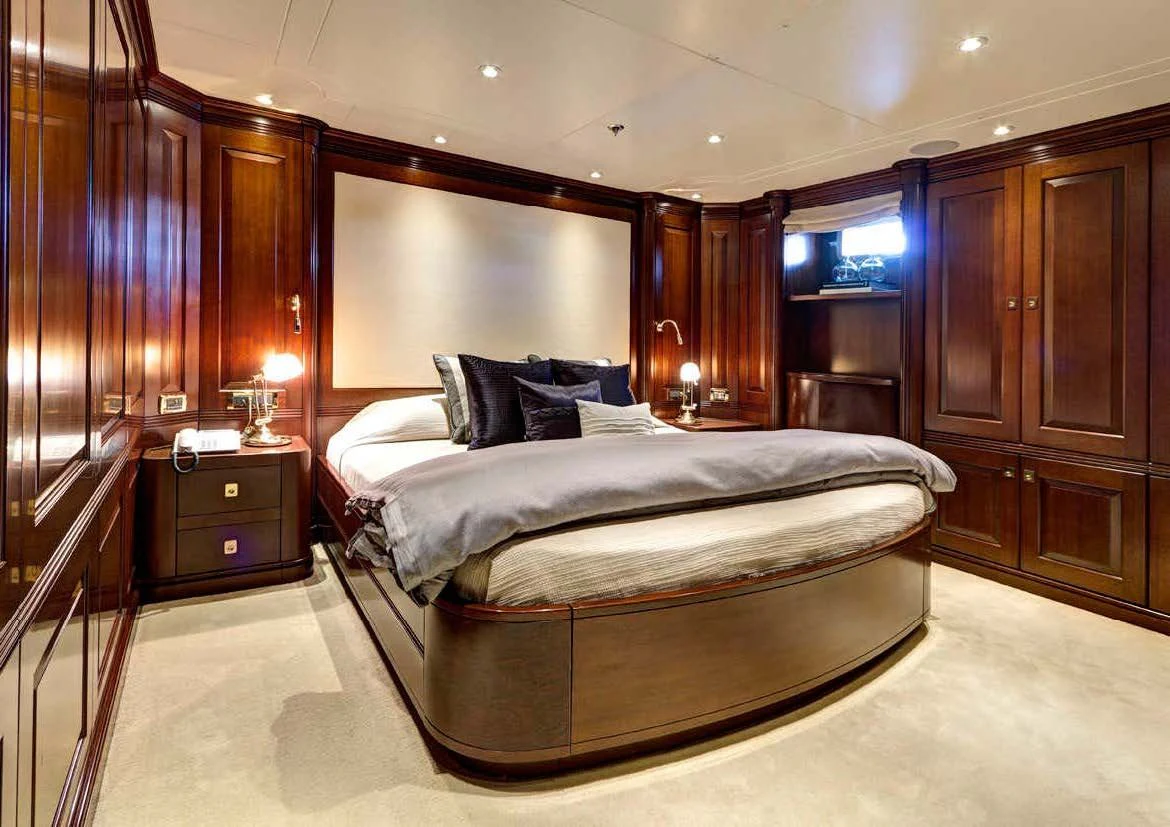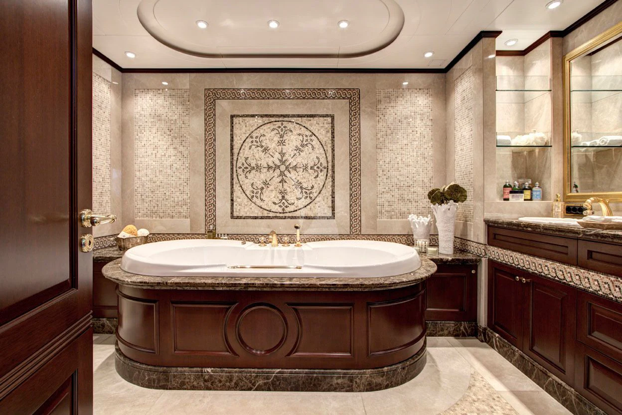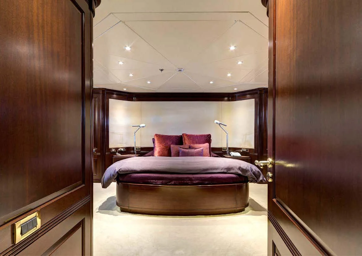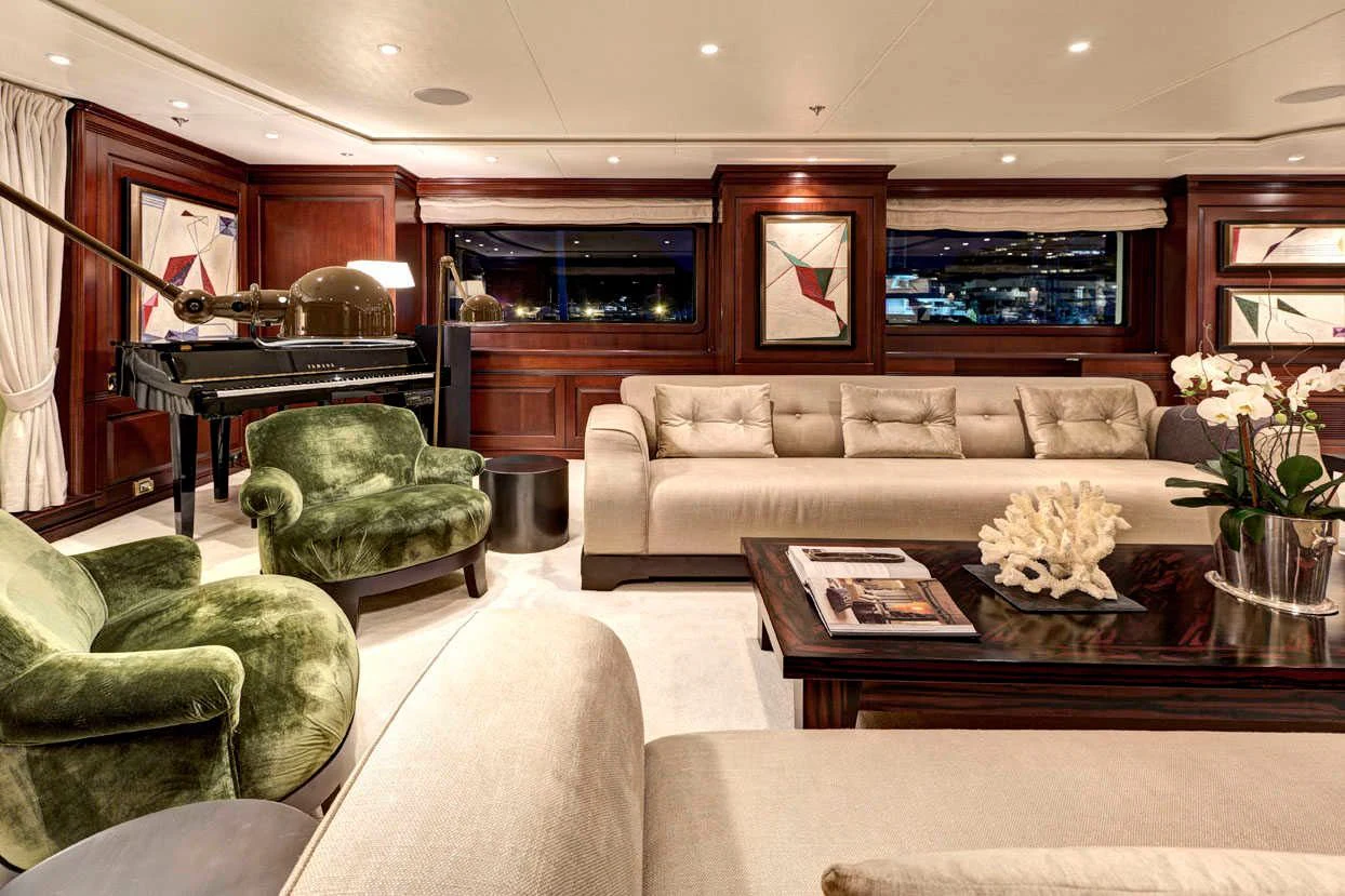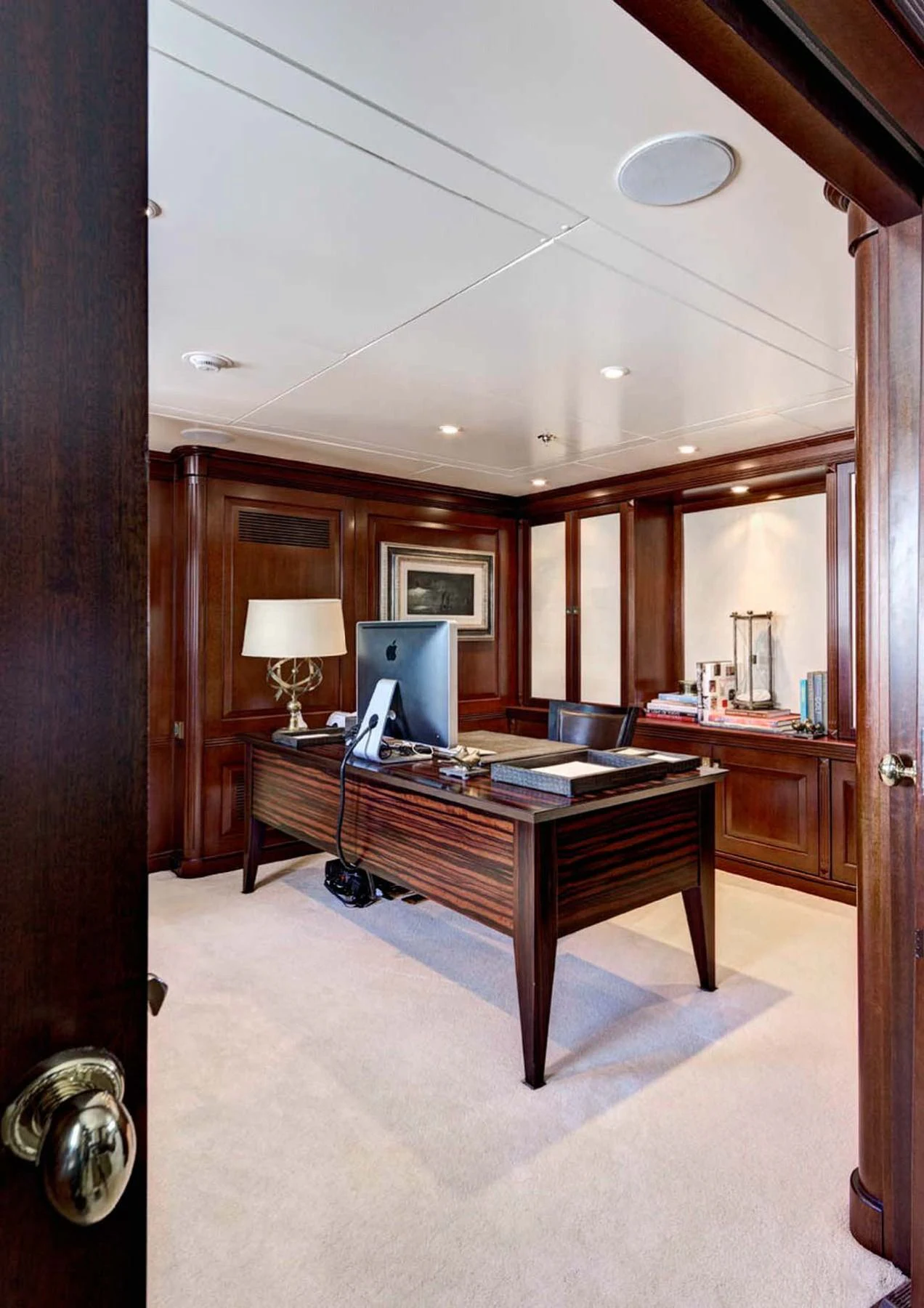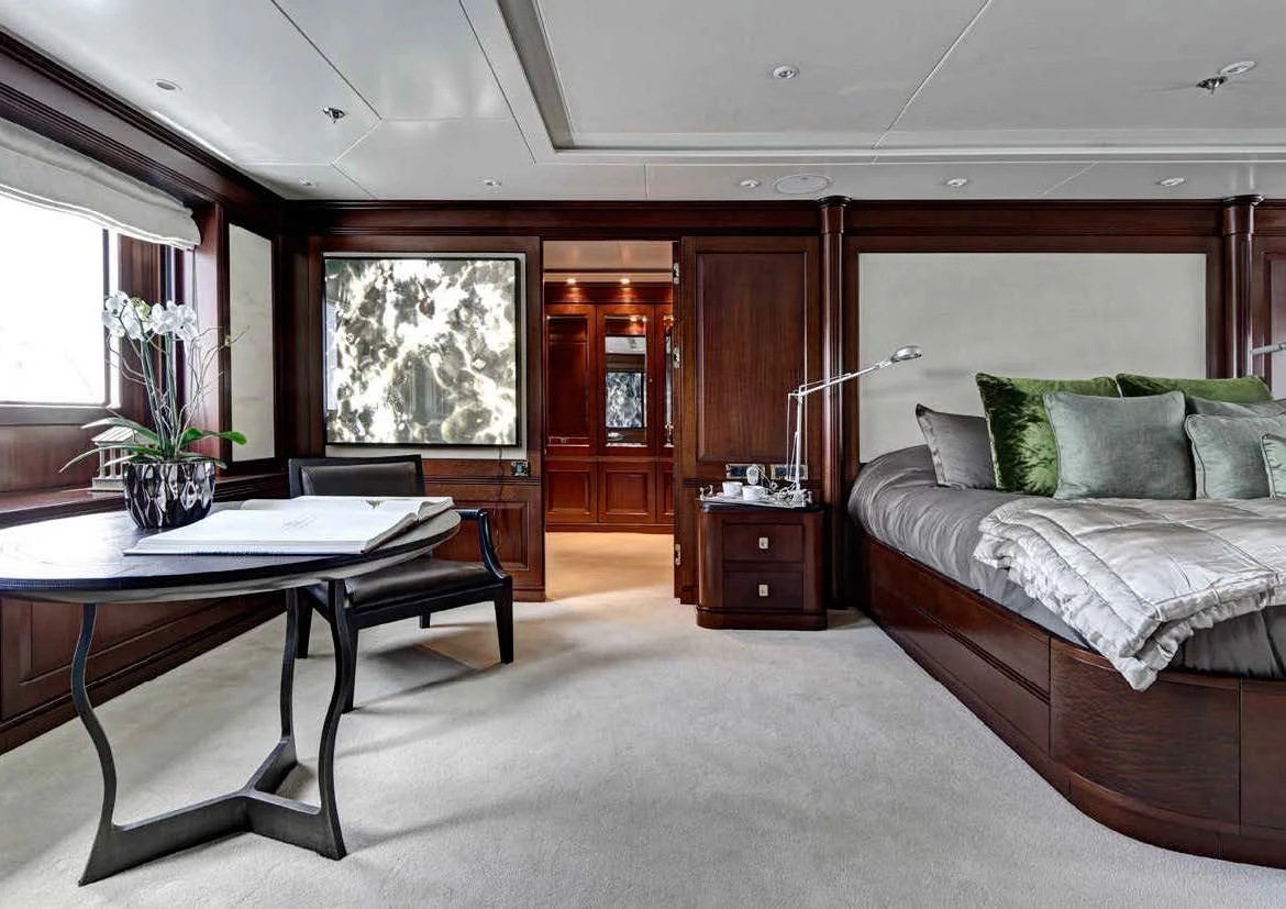 The slightly contemporary lines of AZTECA II’s exterior styling are mirrored by her beautiful interior design, which is classically stylish with subtle incorporation of modern aspects. Plush cream carpets are paired with dark woods and highlighted with olive and metallic furnishings to create an atmosphere of timeless decadence. Striking art pieces and hints of her Turkish origins add a touch of exotic modernity to her AZTECA II’s unique style.