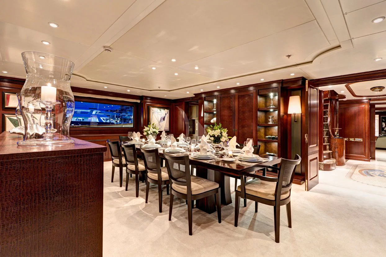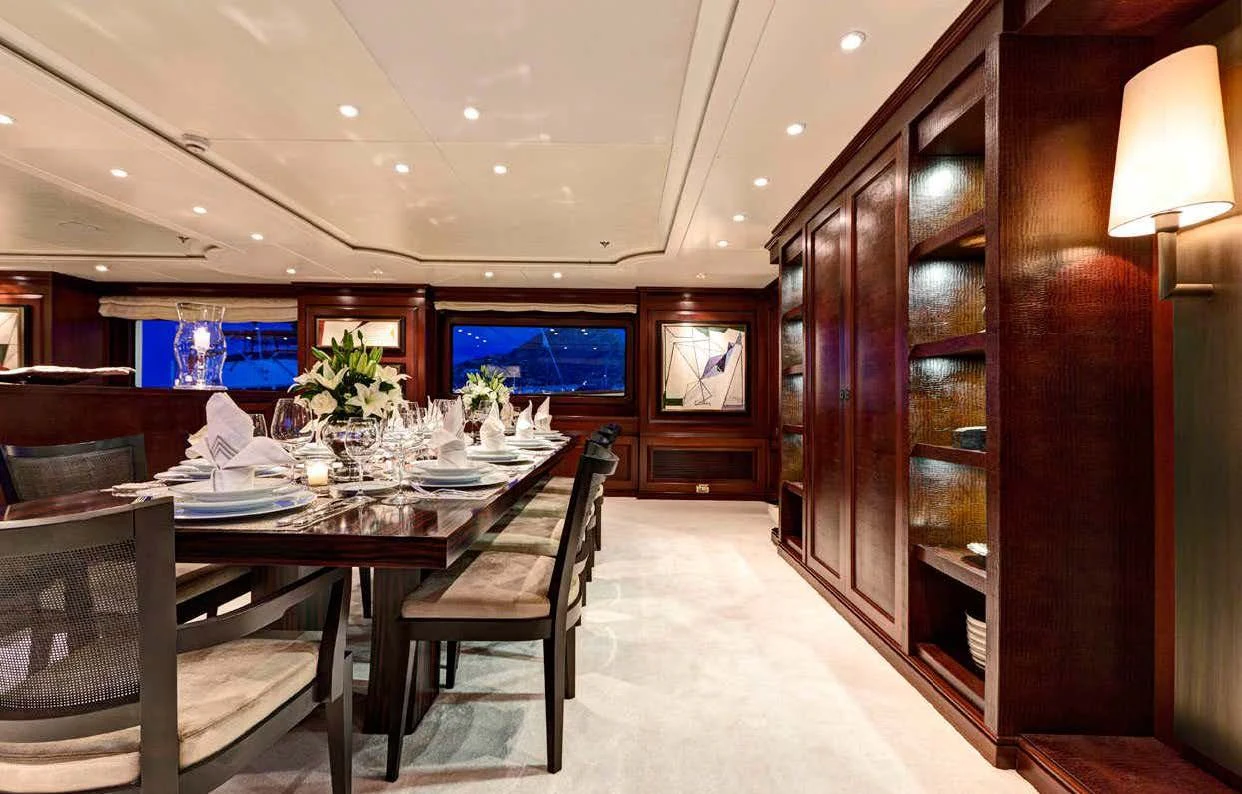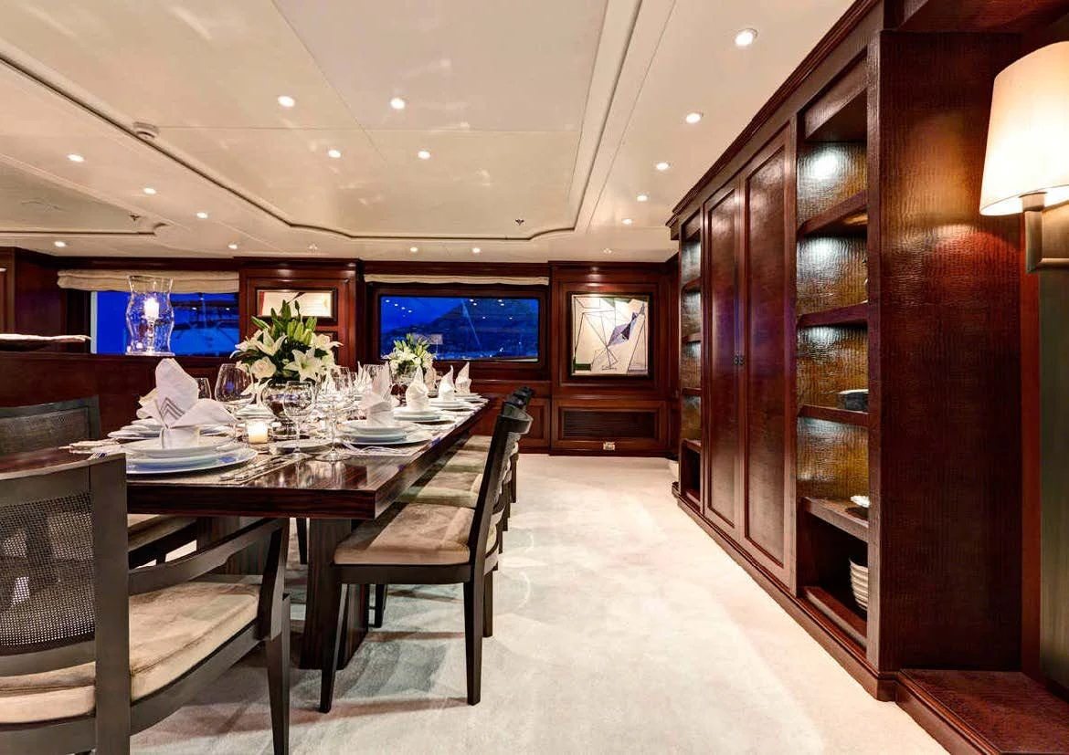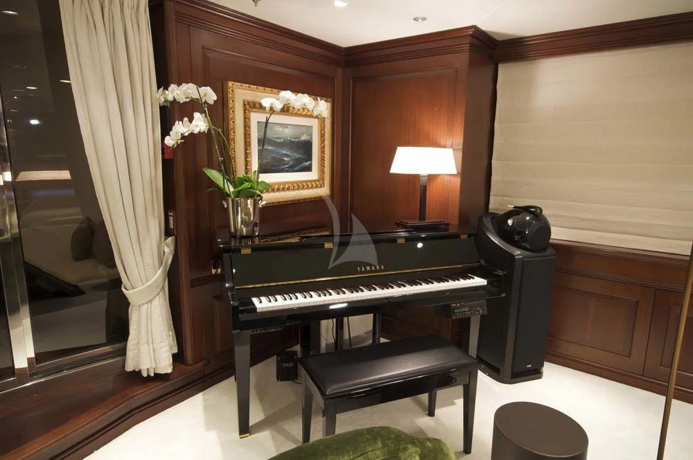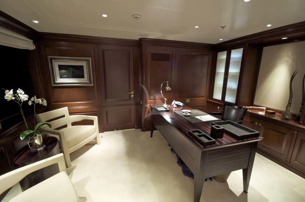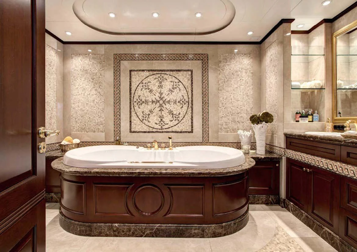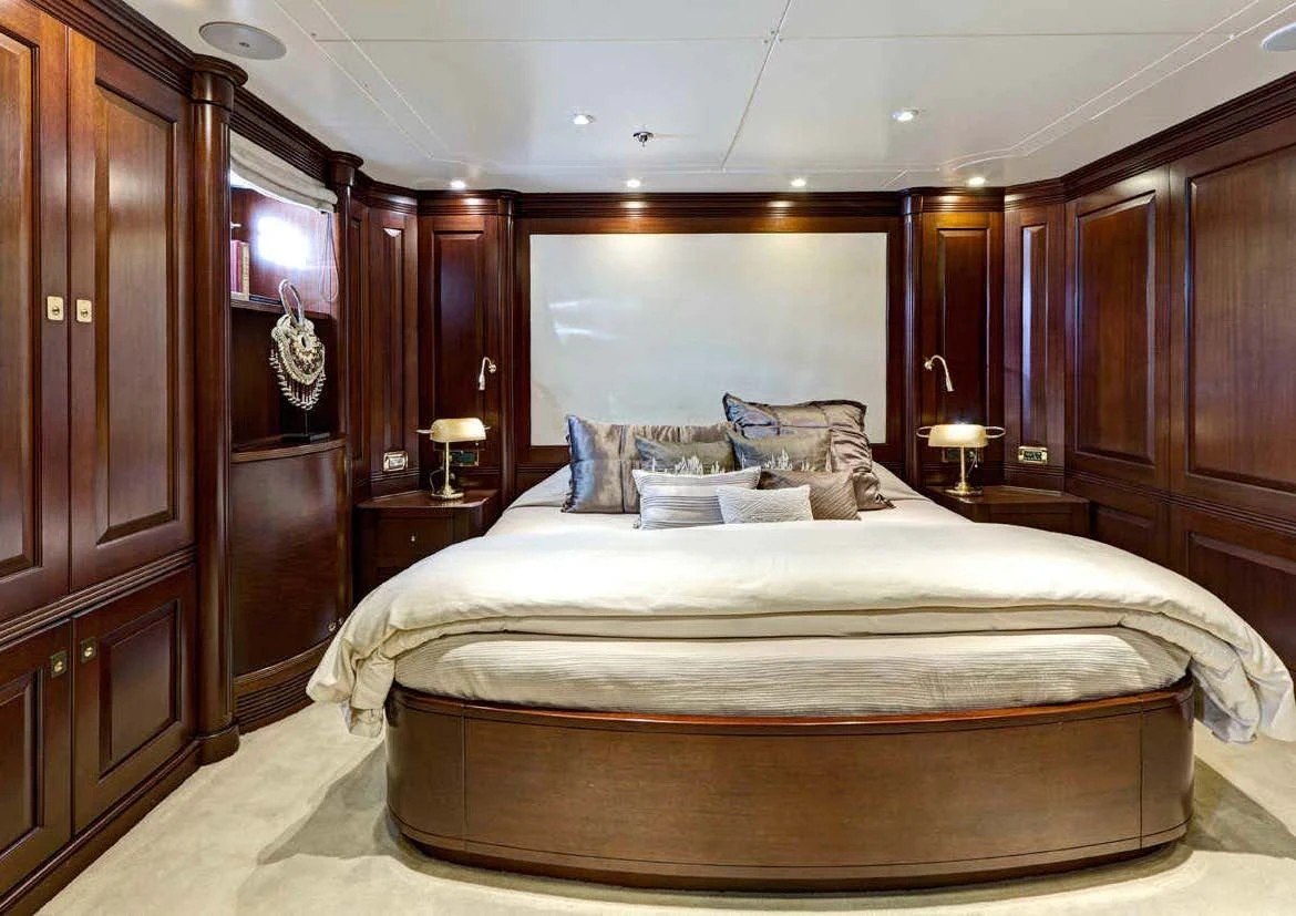 The slightly contemporary lines of AZTECA II’s exterior styling are mirrored by her beautiful interior design, which is classically stylish with subtle incorporation of modern aspects. Plush cream carpets are paired with dark woods and highlighted with olive and metallic furnishings to create an atmosphere of timeless decadence. Striking art pieces and hints of her Turkish origins add a touch of exotic modernity to her AZTECA II’s unique style.