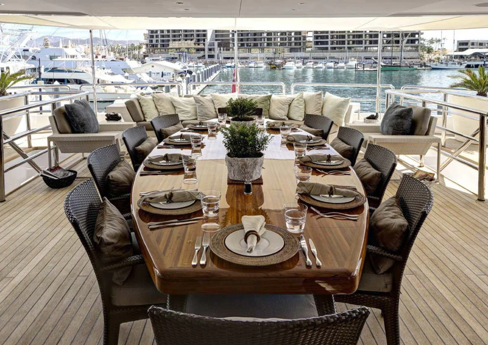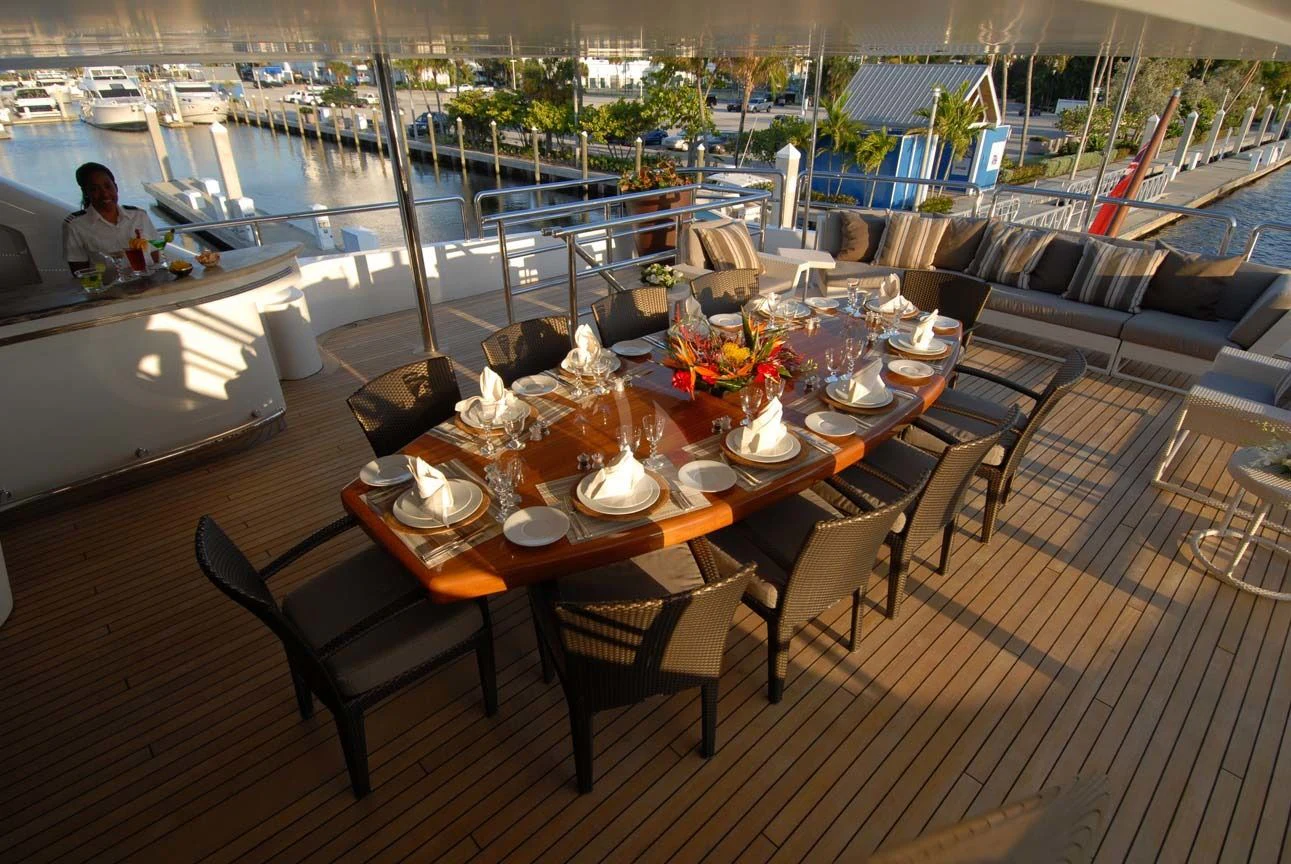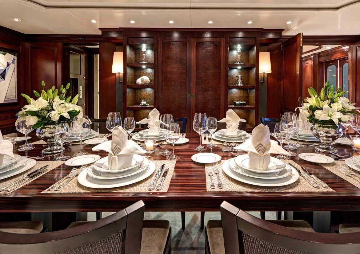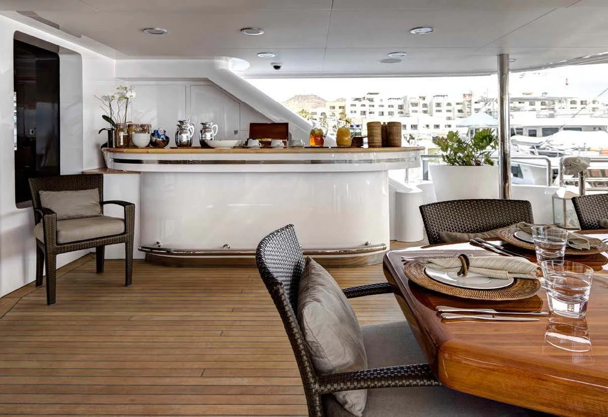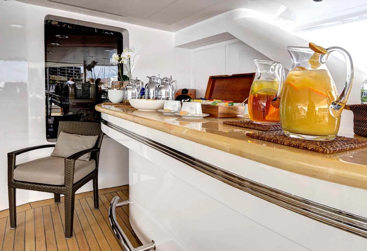 The many dining options aboard make AZTECA II an ideal choice of charter yacht for those who enjoy fine dining, lingering over alfresco meals, or delectable fresh breakfasts in the tropical sunshine. The main deck is arranged to invite guests to flow and mingle over evenings of entertaining. An outside area includes sheltered loungers for enjoying the fresh air with a little protection from stronger breezes, as well as stylish sofas with coffee tables, ideal for canapes or aperitifs. Forward of this, the formal dining area seats 12 for elegant meals prepared by AZTECA II’s experienced and talented chef. The alfresco dining area on the upper deck aft can be set up for formal or more casual occasions, backed by a well-stocked bar. As the evening settles in, guests can move to the bridge deck to enjoy the panoramic sky lounge or gather in the upper deck salon for a nightcap with an impressive view.