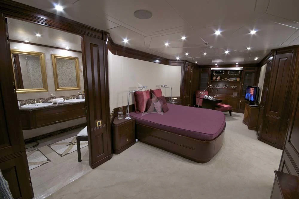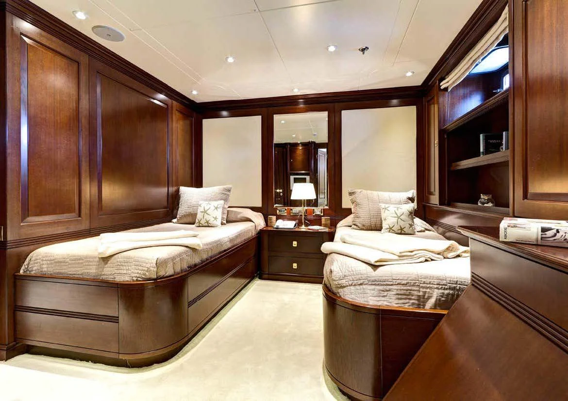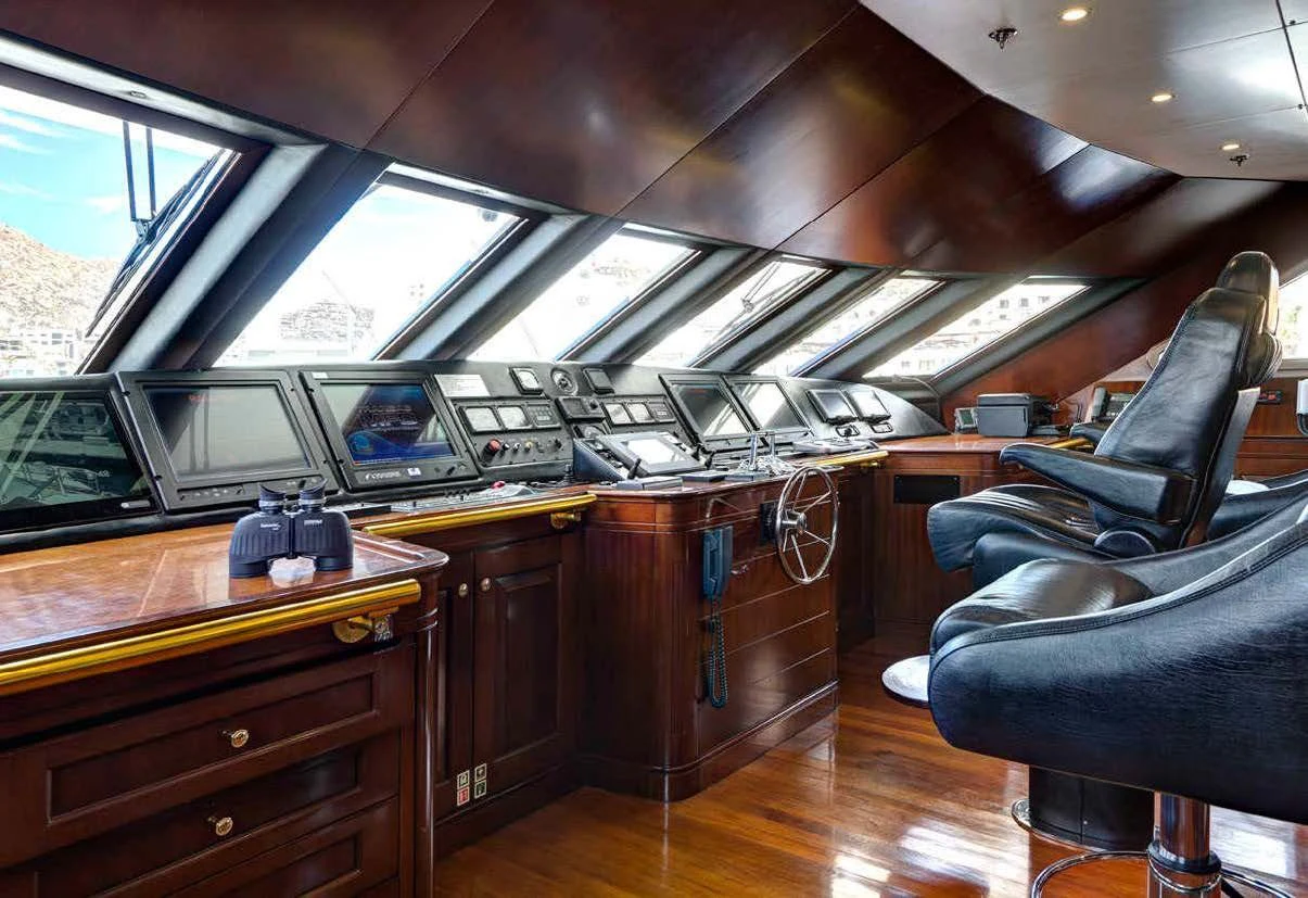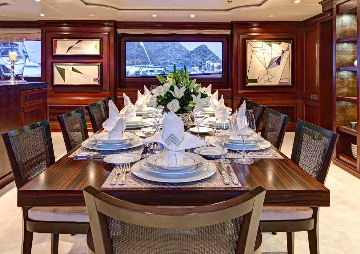 Her six spacious and well-appointed staterooms accommodate up to 12 guests in style. The full-beam, completely customized, main deck master features a beautiful his-and-hers en-suite with stunning wood-encased bathtub and striking mosaic, as well as a huge dressing area, desk, and audio-visual system. The full-beam VIP stateroom, two queens, and two twins are all furnished with glossy dark woods and luxurious fabric, in keeping with the opulent décor of AZTECA II, and boast generous en-suites. With her crew of 12, a cruise aboard this luxury yacht will guarantee that guests can relax and enjoy the special ambiance on board AZTECA II.