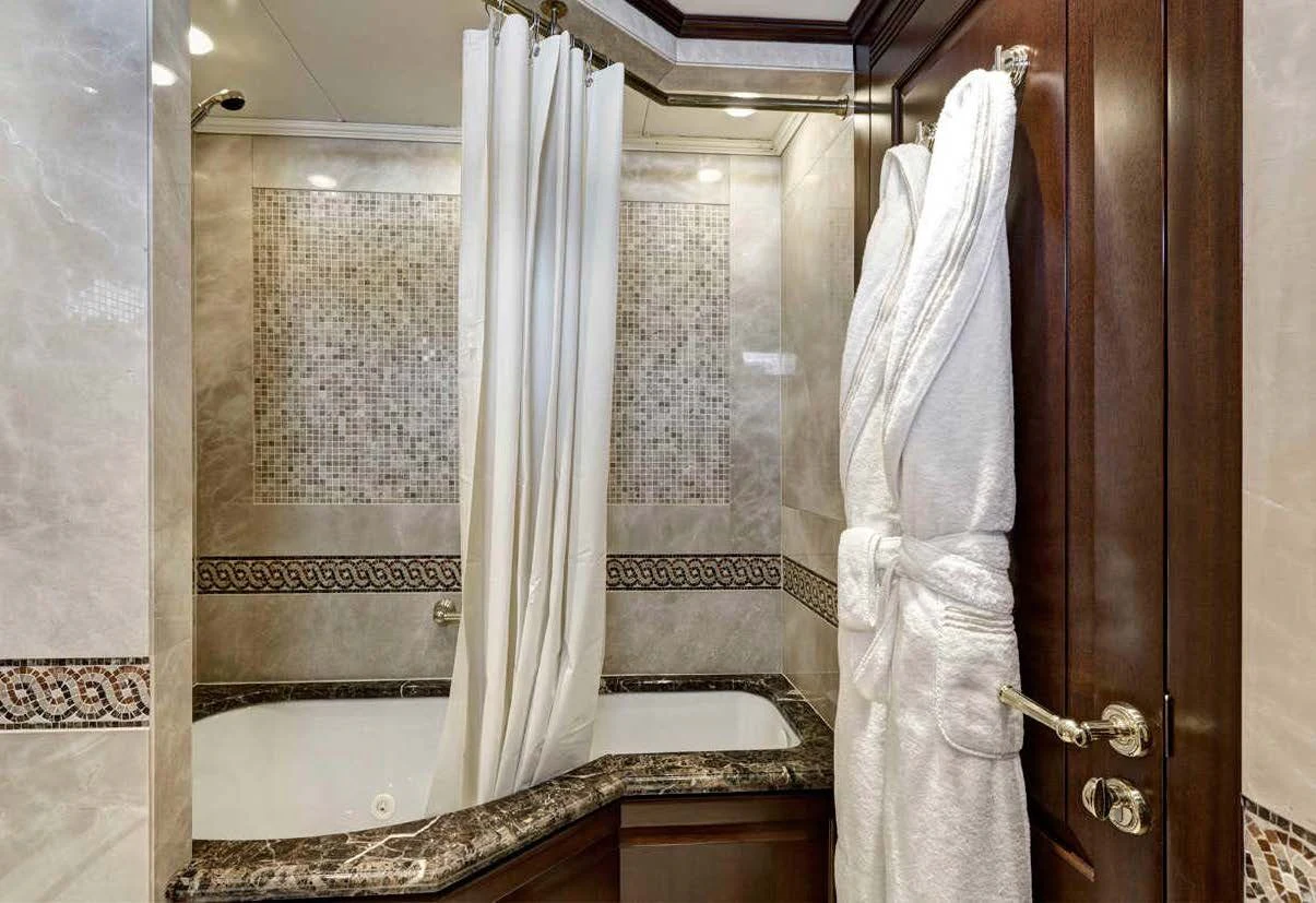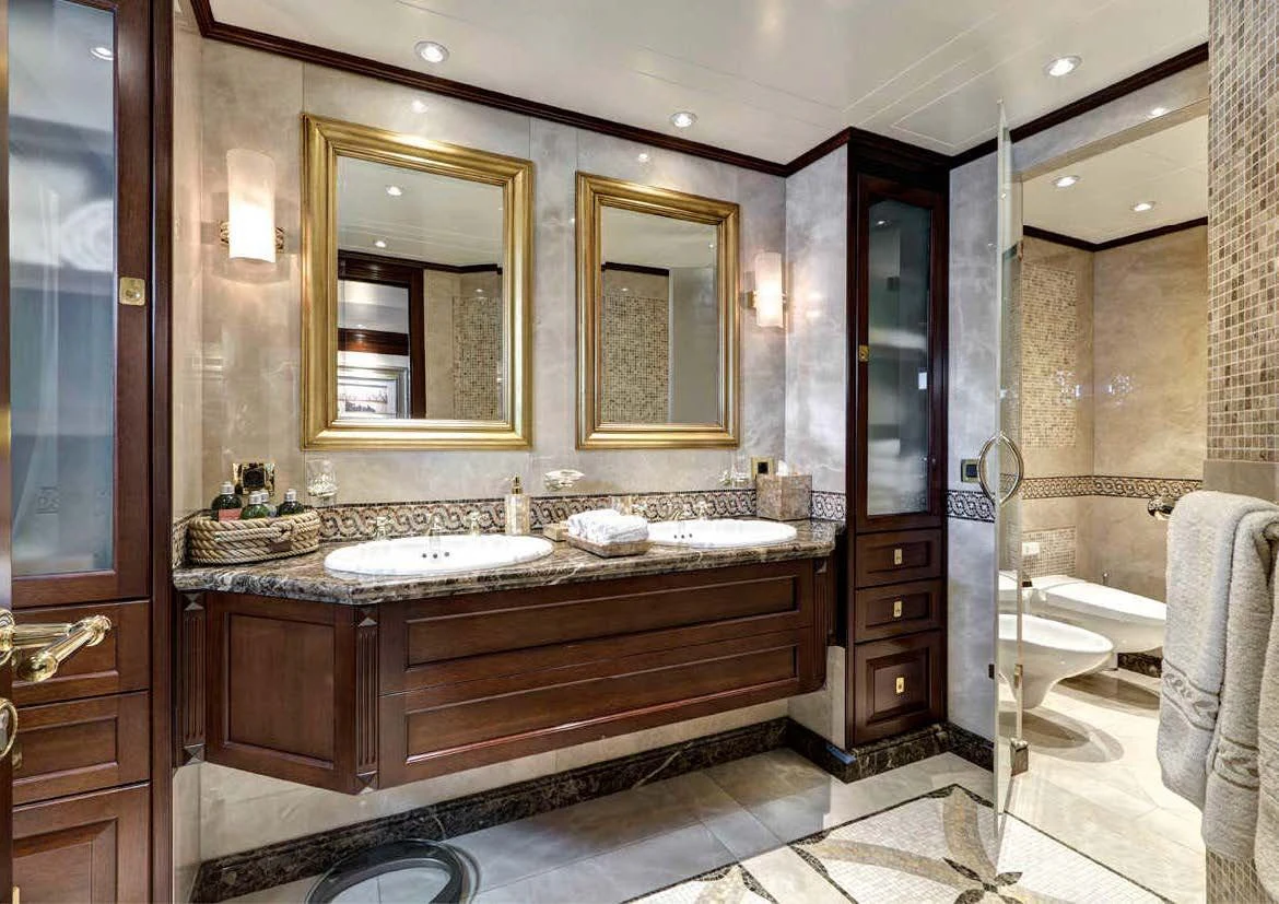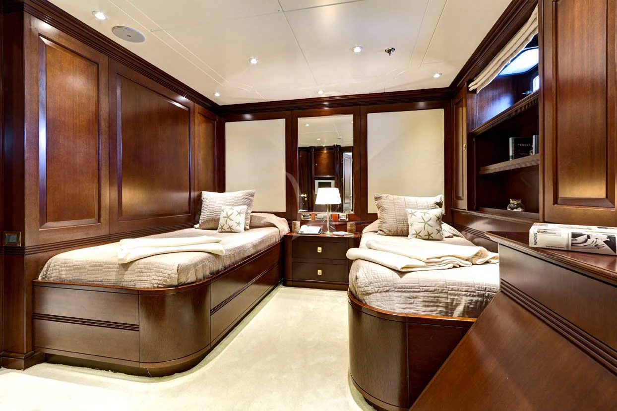 Her six spacious and well-appointed staterooms accommodate up to 12 guests in style. The full-beam, completely customized, main deck master features a beautiful his-and-hers en-suite with stunning wood-encased bathtub and striking mosaic, as well as a huge dressing area, desk, and audio-visual system. The full-beam VIP stateroom, two queens, and two twins are all furnished with glossy dark woods and luxurious fabric, in keeping with the opulent décor of AZTECA II, and boast generous en-suites. With her crew of 12, a cruise aboard this luxury yacht will guarantee that guests can relax and enjoy the special ambiance on board AZTECA II.