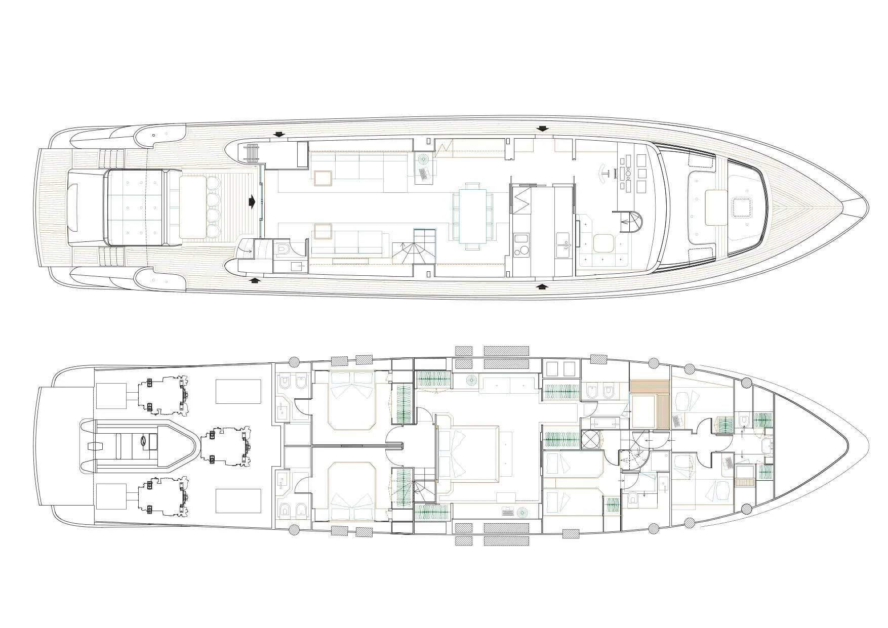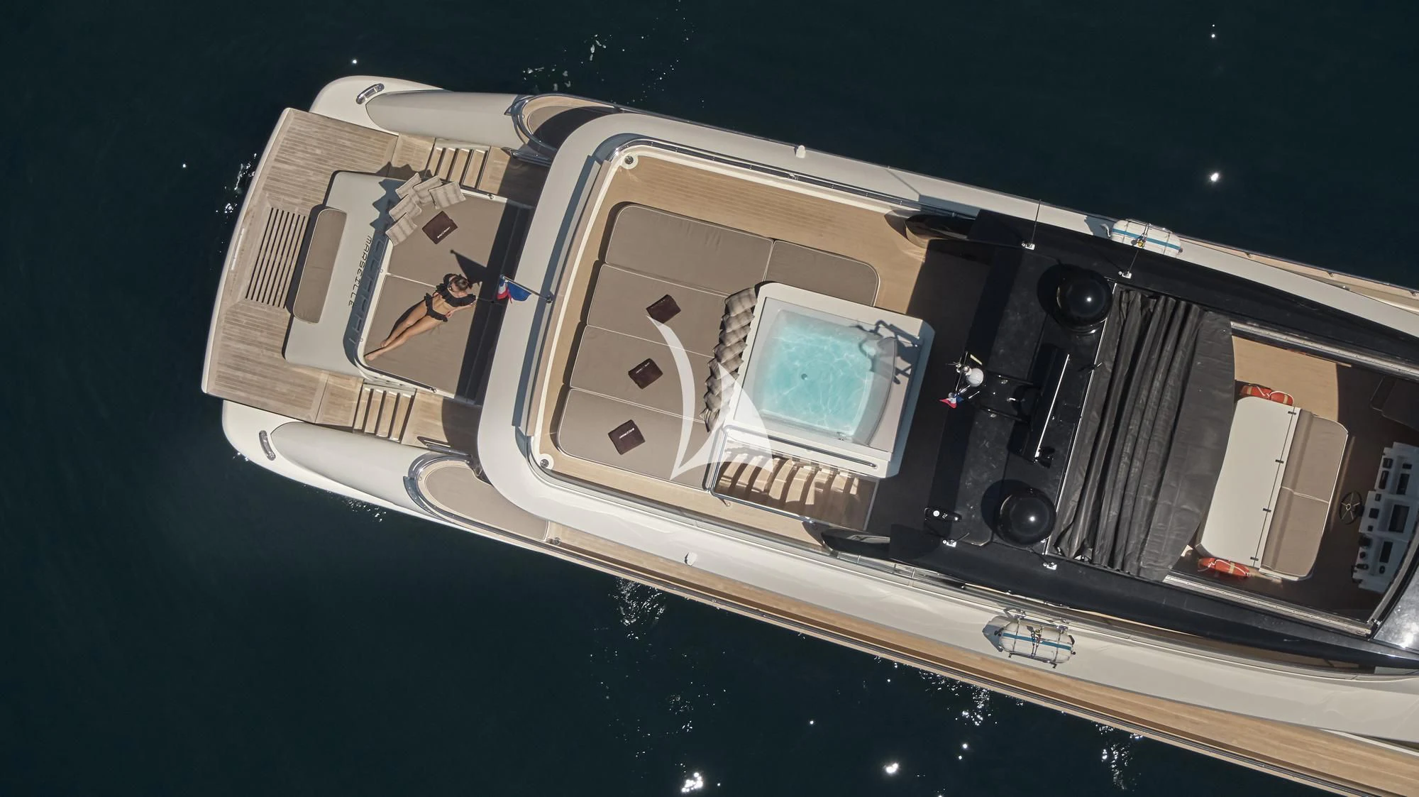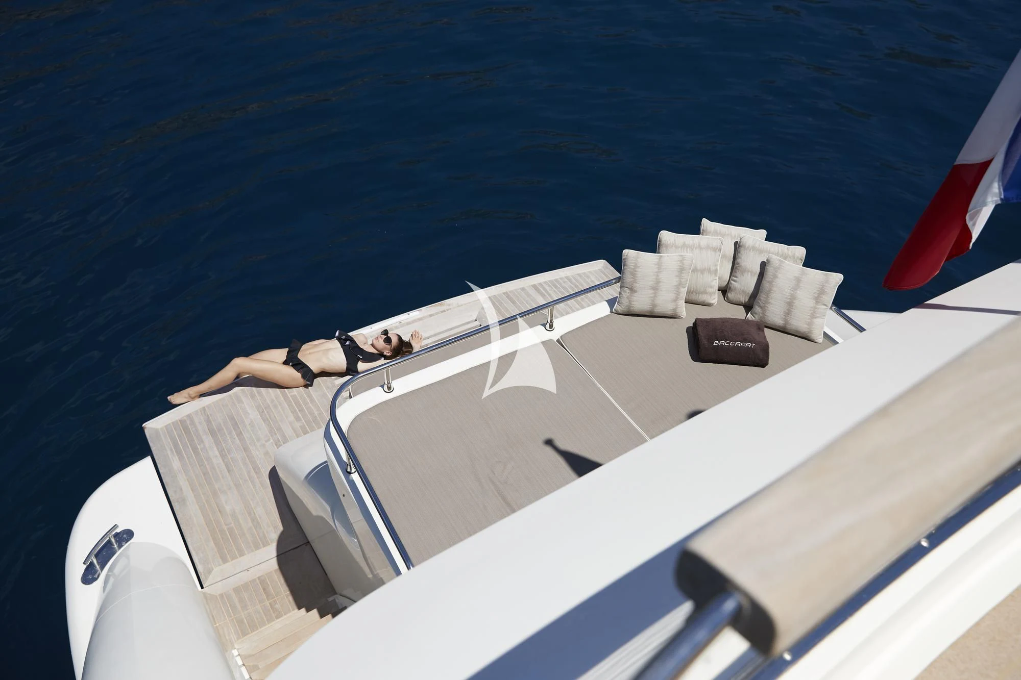 BACCARAT boasts impressive and smart exterior areas, perfect for relaxation. Unwind on the spacious flybridge and take in spectacular views. Soak up the sun, enjoy alfresco dining, refresh yourself at the minibar, splash into the Jacuzzi or lounge under the retractable hardtop. Additional sunbathing areas are available on the aft and foredeck; the bathing platform also acts as a small private teak beach, convenient to launch the water toys. The yacht is equipped with four Volvo Penta engines, 900 hp 662 KW each. BACCARAT provides everything expected for a successful luxury yacht charter.