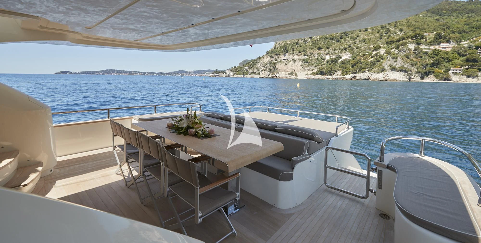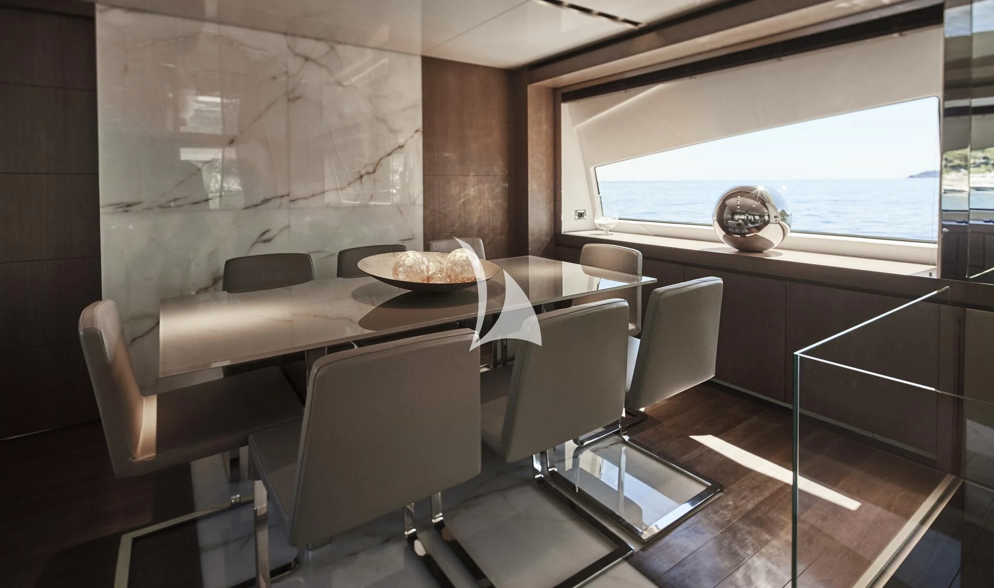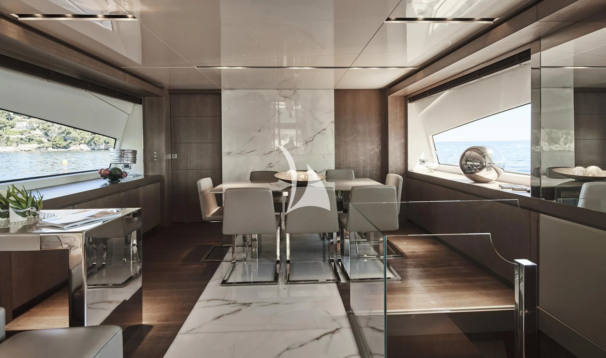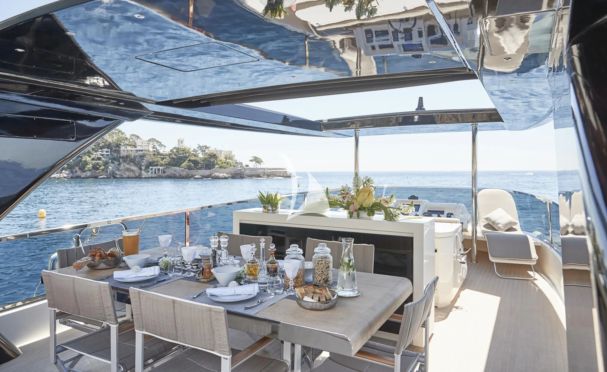 Charter yacht BACCARAT’s cool, calm interior was designed by the interior designer Stefano Tini of the shipyard Permare, satisfying the sophisticated taste of the owner. Inside, guests will find a neutral color palette and high-quality finishes that create a light, bright and comfortable living space. The soothing ambiance can be felt in every room, from the spacious main salon to each stateroom. BACCARAT’s main salon showcases two sofas mirroring each other, expansive windows and a formal dining space. When alfresco dining is desired, guests can step outside the sliding doors to the beautiful aft deck and enjoy meals around the large table surrounded by unbeatable views. Comfortable sunpads can also be found on the aft deck for lounging under the hardtop. Guests will be in complete comfort while at anchor and when underway, courtesy of the stabilizers.