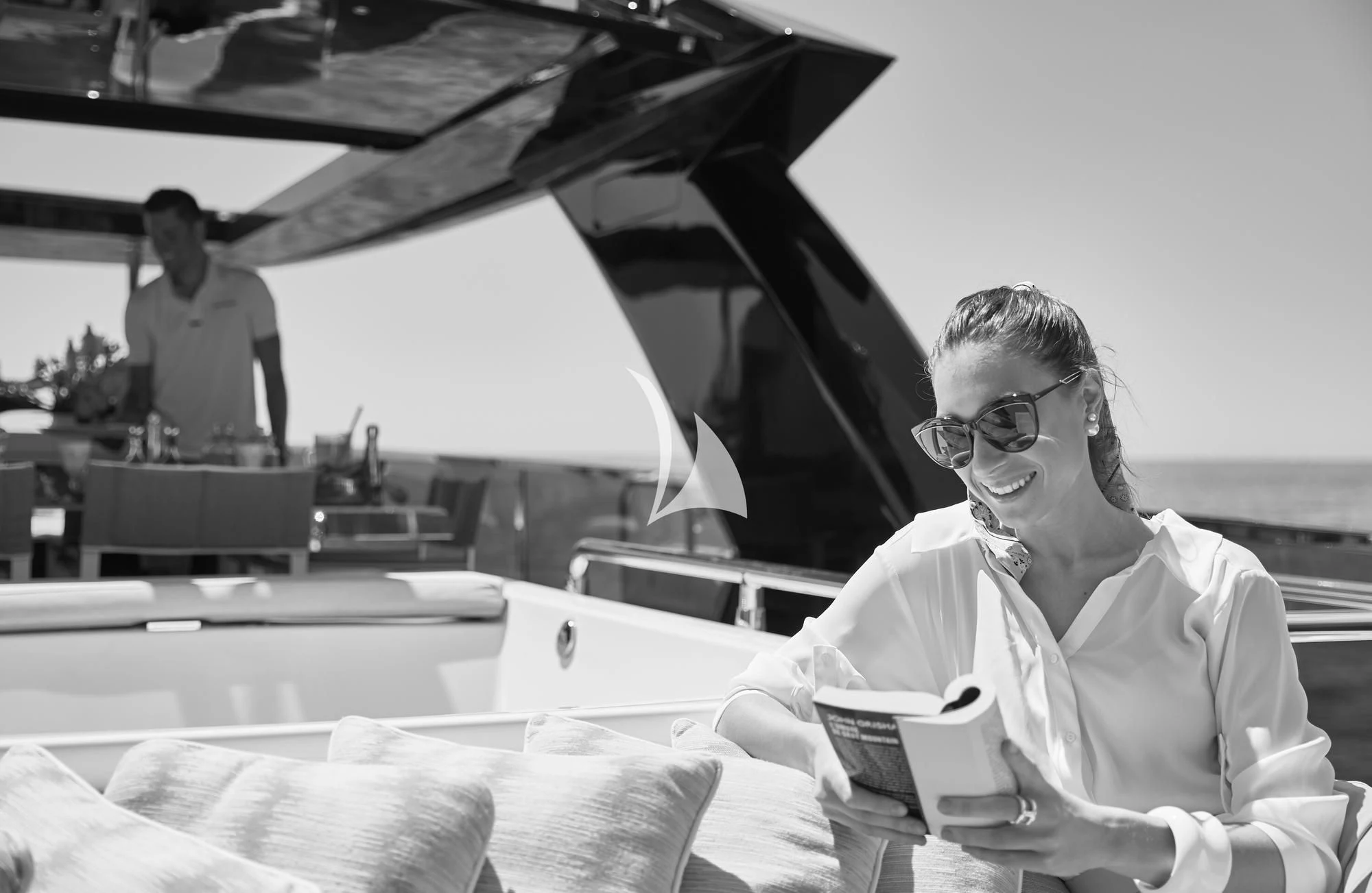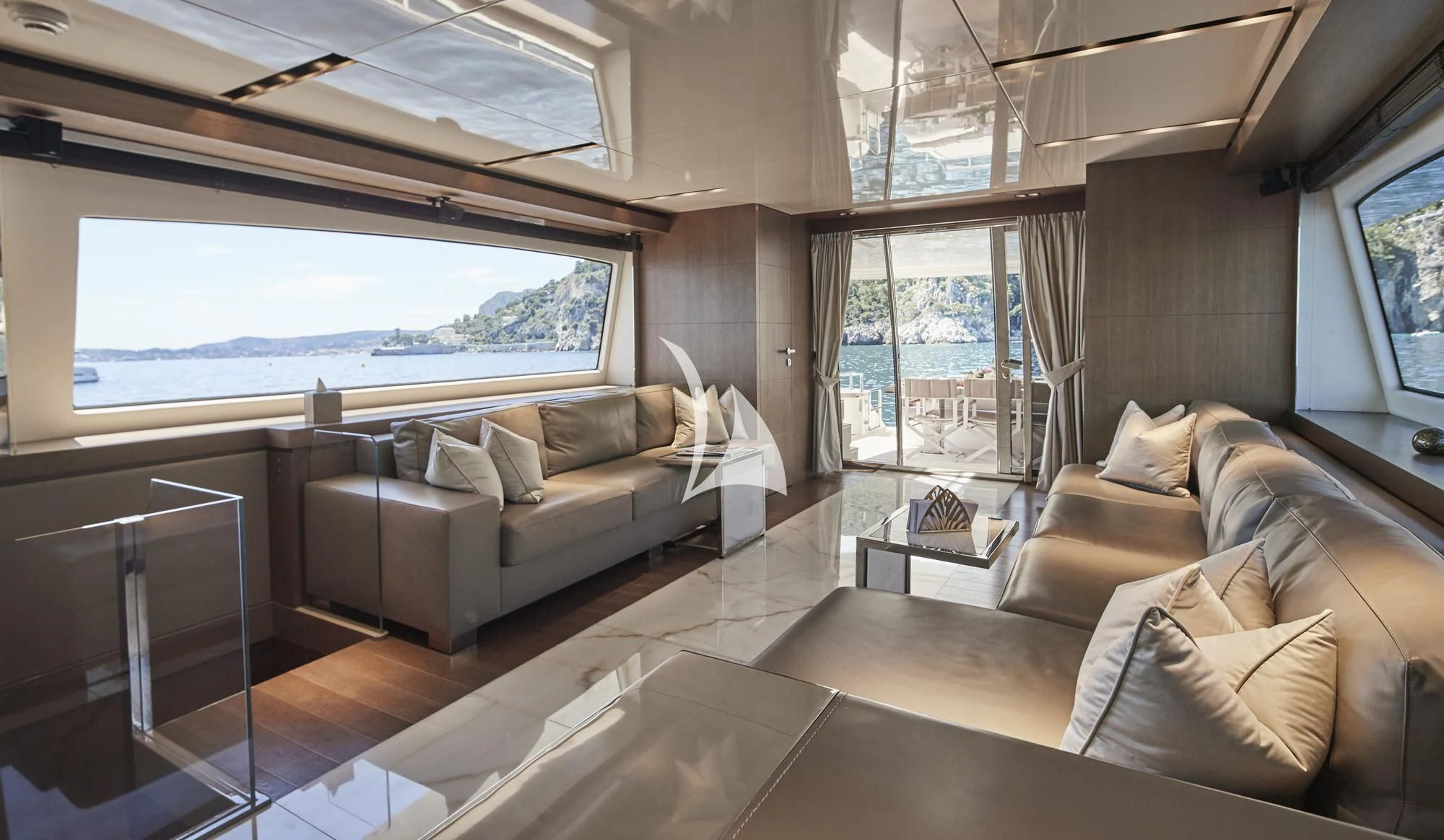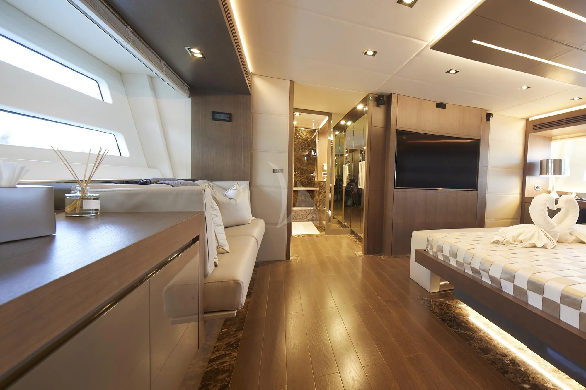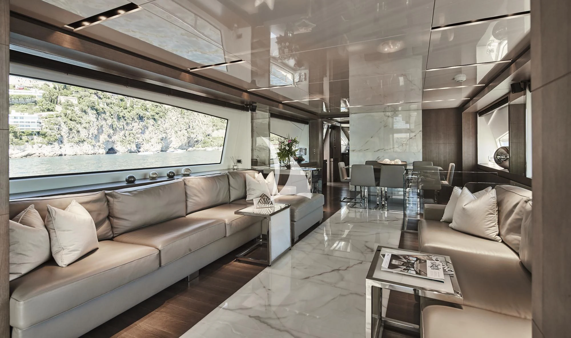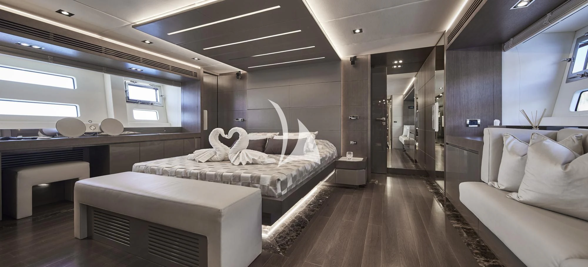 Charter yacht BACCARAT’s cool, calm interior was designed by the interior designer Stefano Tini of the shipyard Permare, satisfying the sophisticated taste of the owner. Inside, guests will find a neutral color palette and high-quality finishes that create a light, bright and comfortable living space. The soothing ambiance can be felt in every room, from the spacious main salon to each stateroom. BACCARAT’s main salon showcases two sofas mirroring each other, expansive windows and a formal dining space. When alfresco dining is desired, guests can step outside the sliding doors to the beautiful aft deck and enjoy meals around the large table surrounded by unbeatable views. Comfortable sunpads can also be found on the aft deck for lounging under the hardtop. Guests will be in complete comfort while at anchor and when underway, courtesy of the stabilizers.