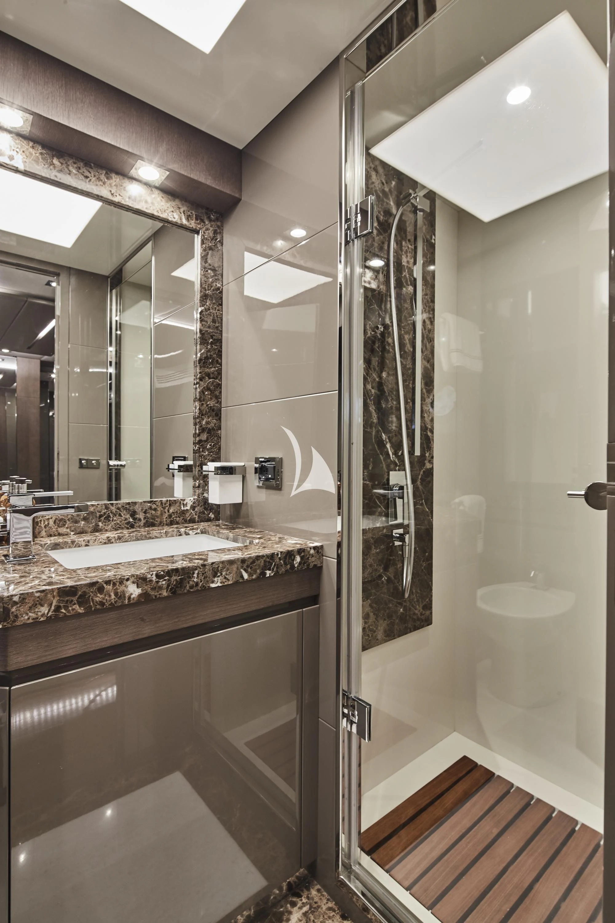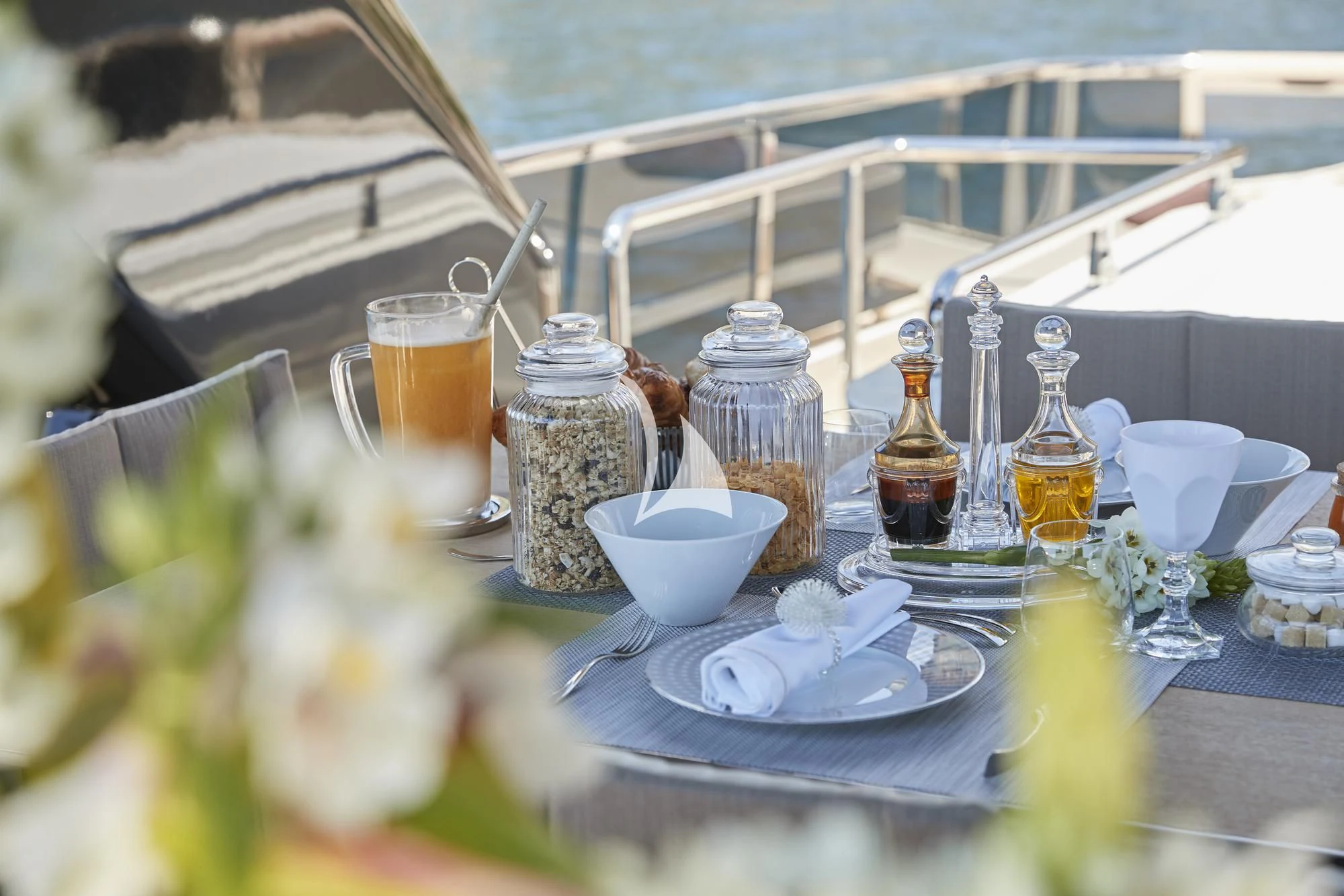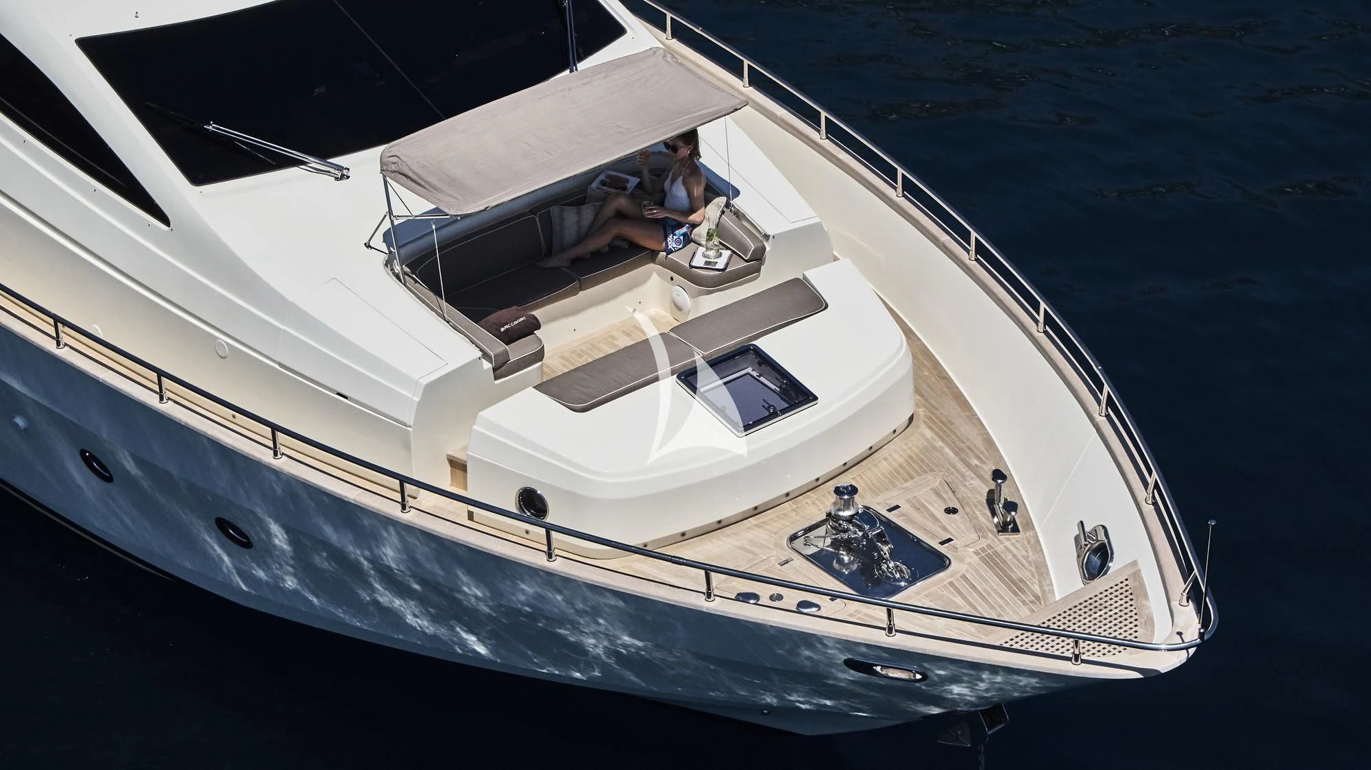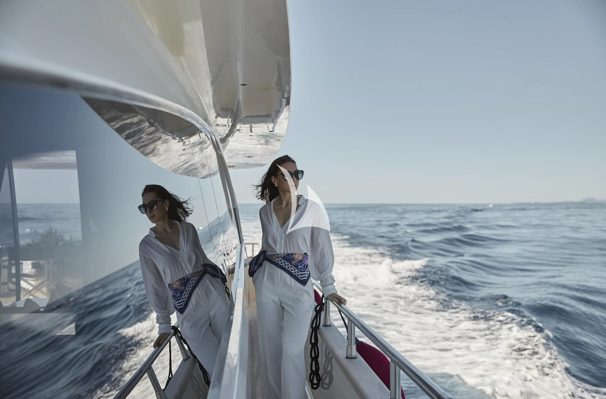 Charter yacht BACCARAT’s cool, calm interior was designed by the interior designer Stefano Tini of the shipyard Permare, satisfying the sophisticated taste of the owner. Inside, guests will find a neutral color palette and high-quality finishes that create a light, bright and comfortable living space. The soothing ambiance can be felt in every room, from the spacious main salon to each stateroom. BACCARAT’s main salon showcases two sofas mirroring each other, expansive windows and a formal dining space. When alfresco dining is desired, guests can step outside the sliding doors to the beautiful aft deck and enjoy meals around the large table surrounded by unbeatable views. Comfortable sunpads can also be found on the aft deck for lounging under the hardtop. Guests will be in complete comfort while at anchor and when underway, courtesy of the stabilizers.
