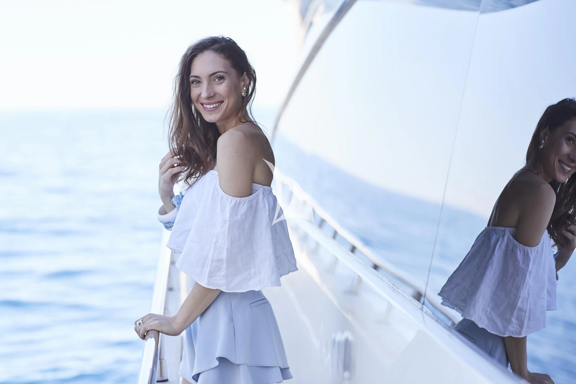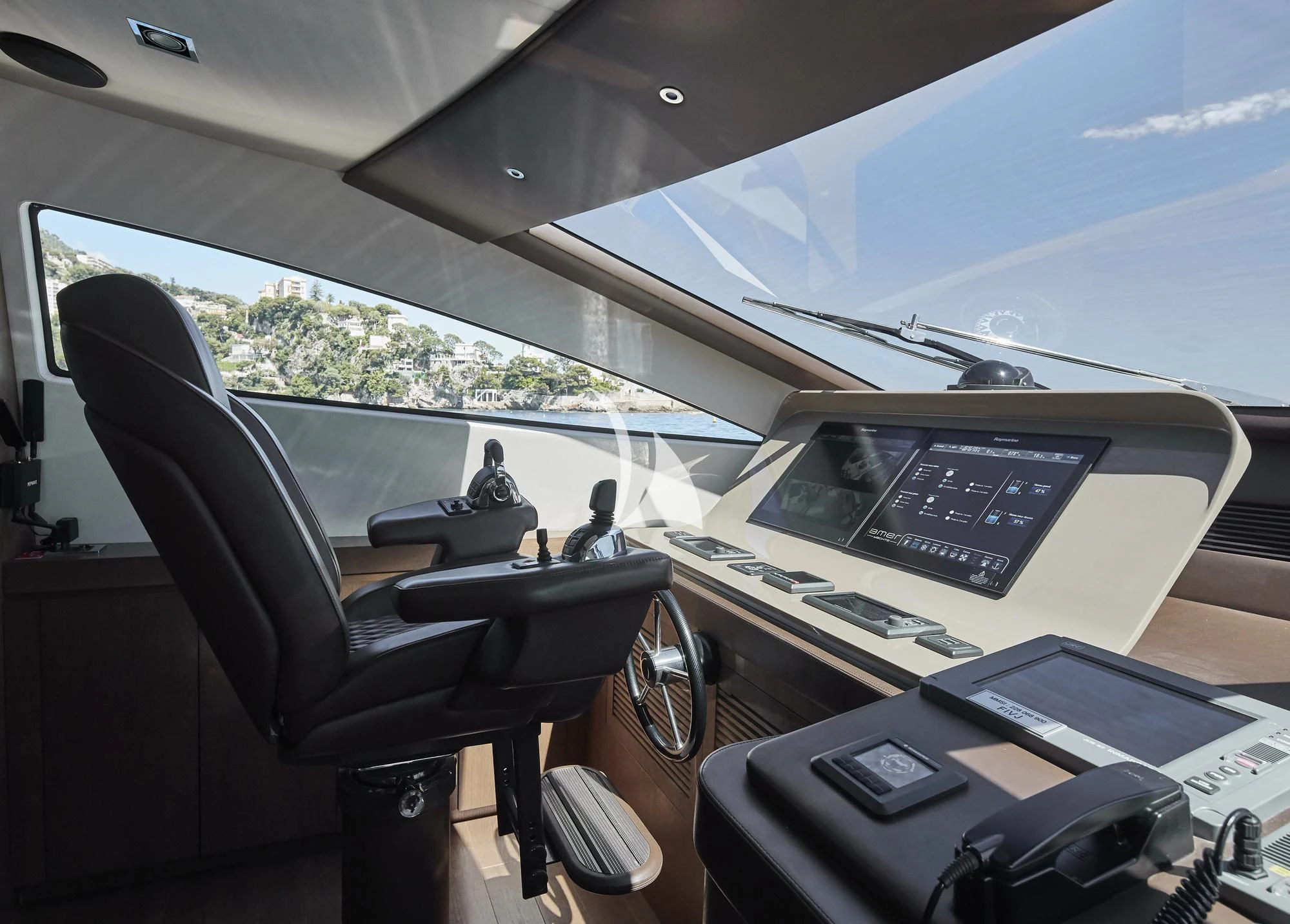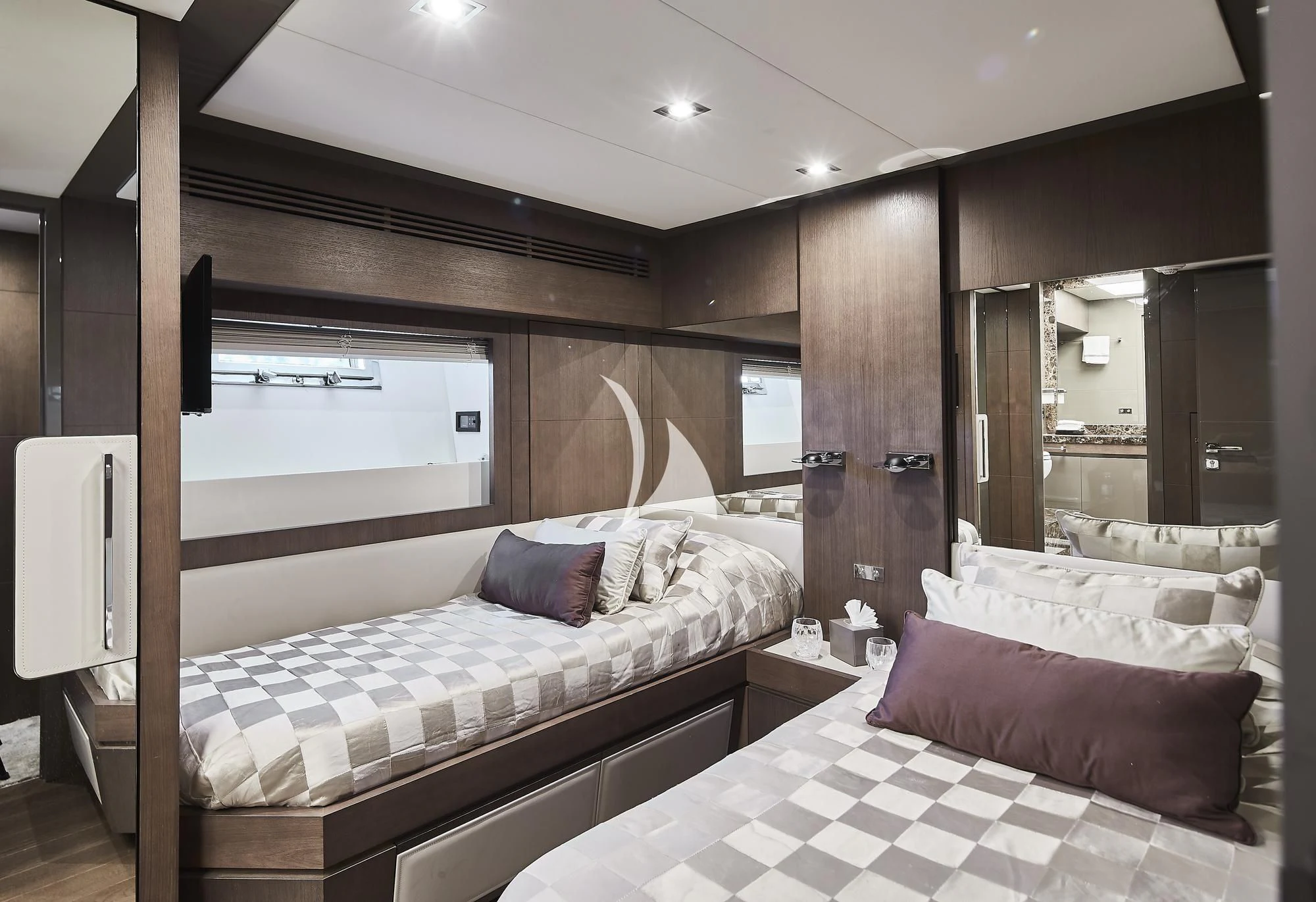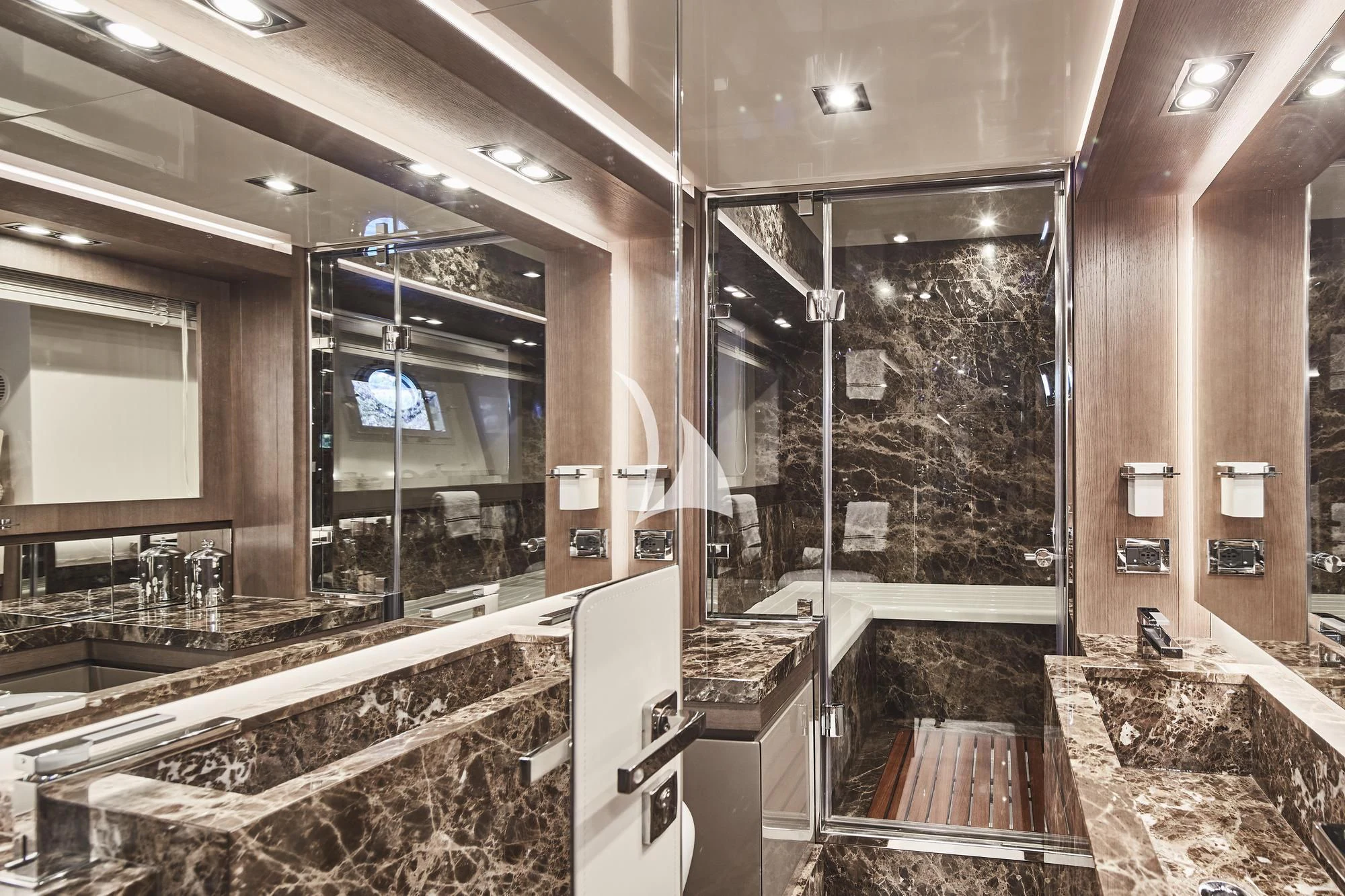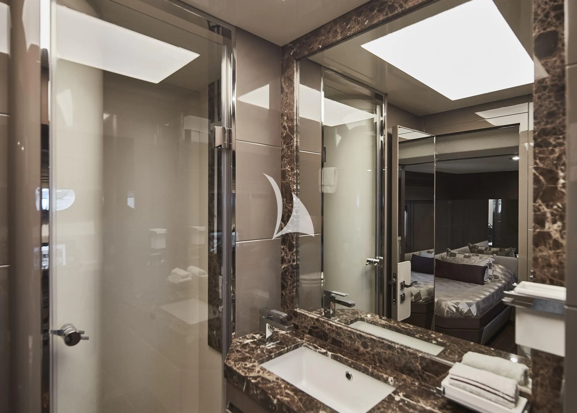 Charter yacht BACCARAT’s cool, calm interior was designed by the interior designer Stefano Tini of the shipyard Permare, satisfying the sophisticated taste of the owner. Inside, guests will find a neutral color palette and high-quality finishes that create a light, bright and comfortable living space. The soothing ambiance can be felt in every room, from the spacious main salon to each stateroom. BACCARAT’s main salon showcases two sofas mirroring each other, expansive windows and a formal dining space. When alfresco dining is desired, guests can step outside the sliding doors to the beautiful aft deck and enjoy meals around the large table surrounded by unbeatable views. Comfortable sunpads can also be found on the aft deck for lounging under the hardtop. Guests will be in complete comfort while at anchor and when underway, courtesy of the stabilizers.