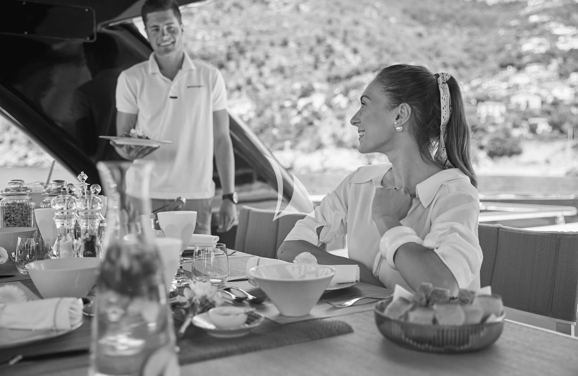 BACCARAT welcomes up to 10 guests to spend restful nights in five staterooms, all with en-suite bathrooms. The main-deck master suite is full-beam and features plenty of natural and ambient lighting, comfortable furnishings and ample space to move around. Further accommodations include four double cabins with king-size beds. The charter yacht’s versatile and flexible layout is ideal for families, couples and friends at the same time. BACCARAT’s exceptional crew of five will ensure each guest’s charter experience is memorable.