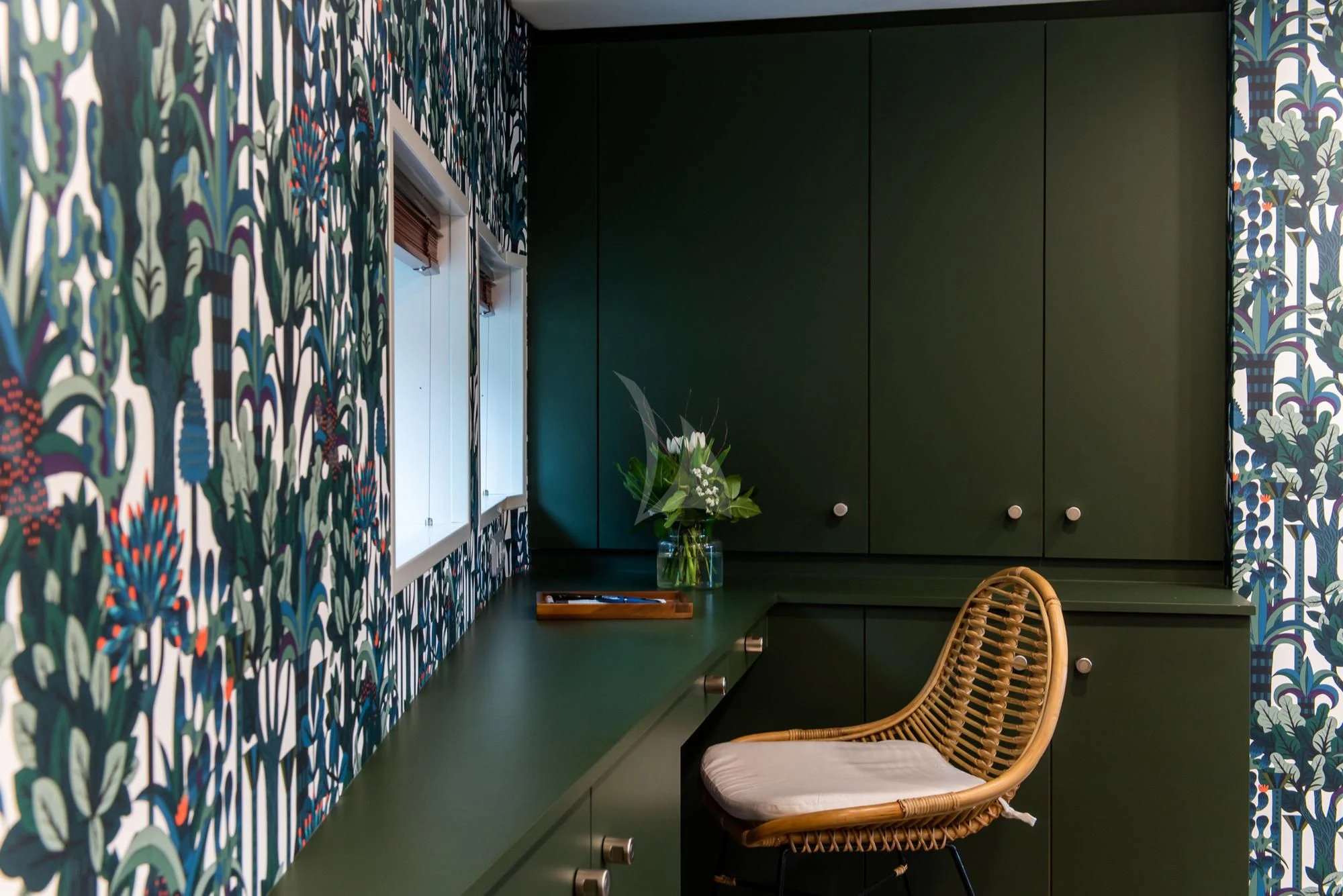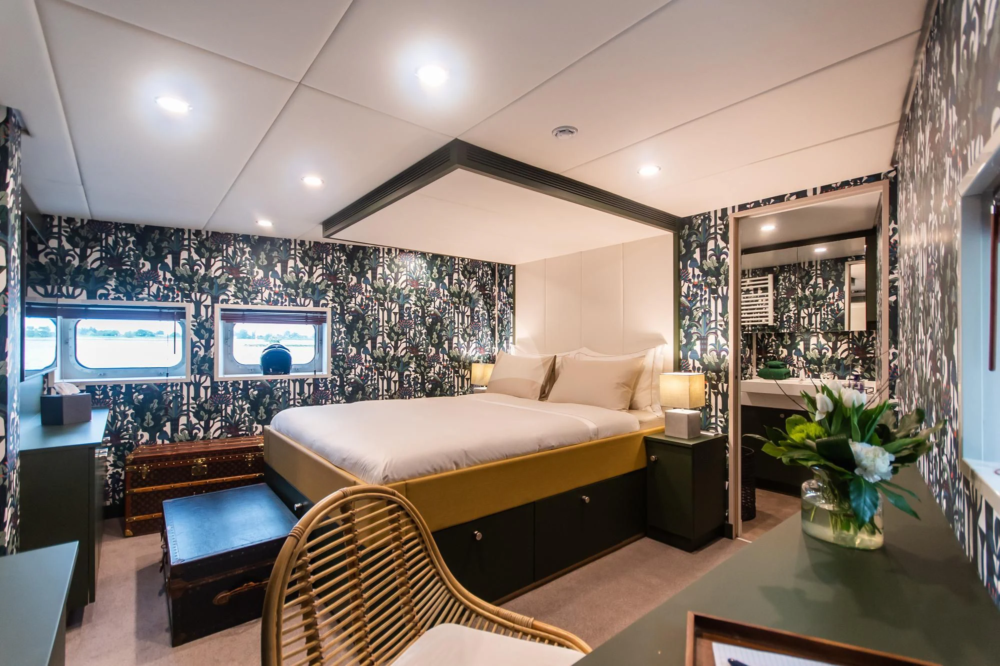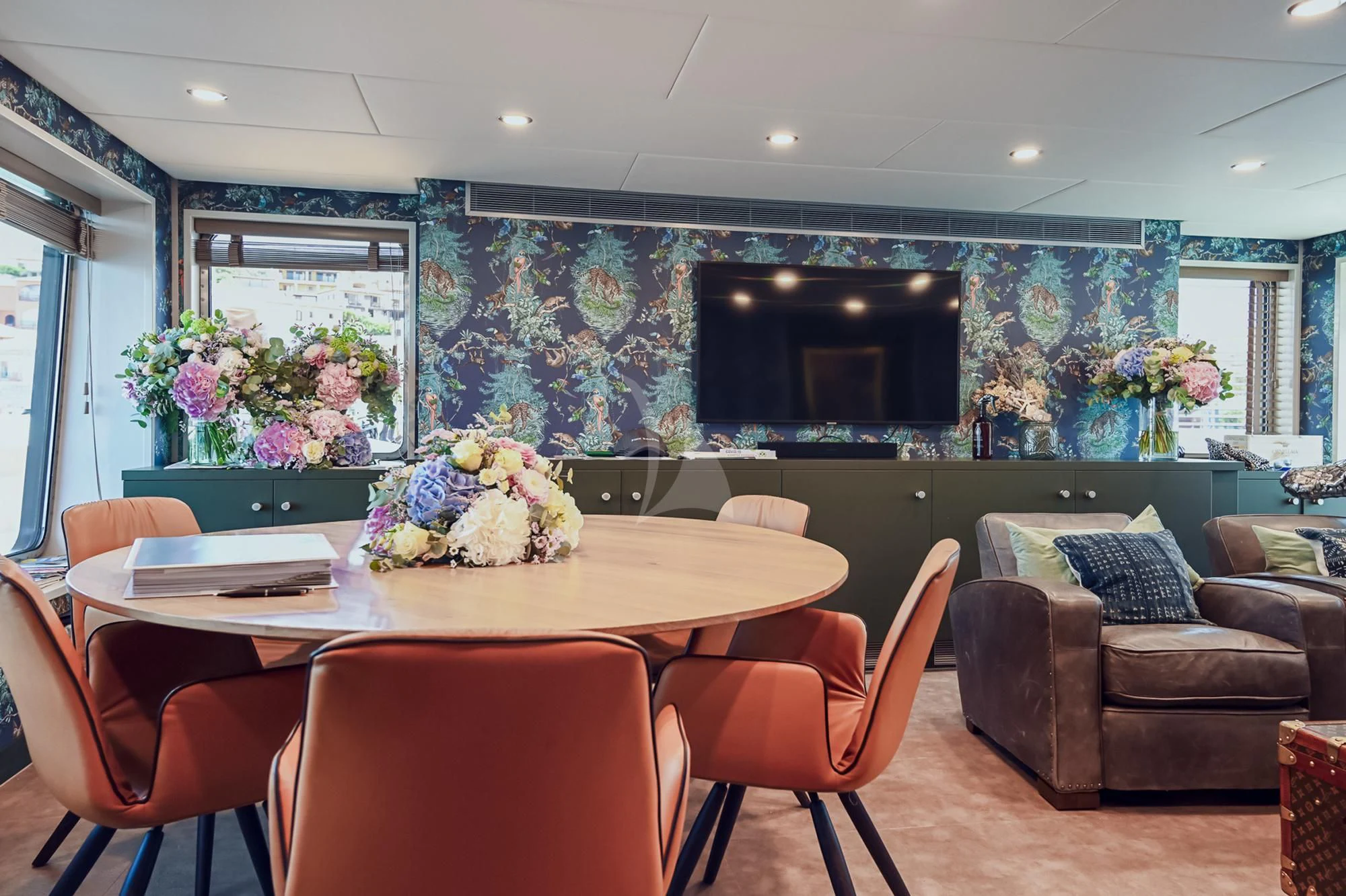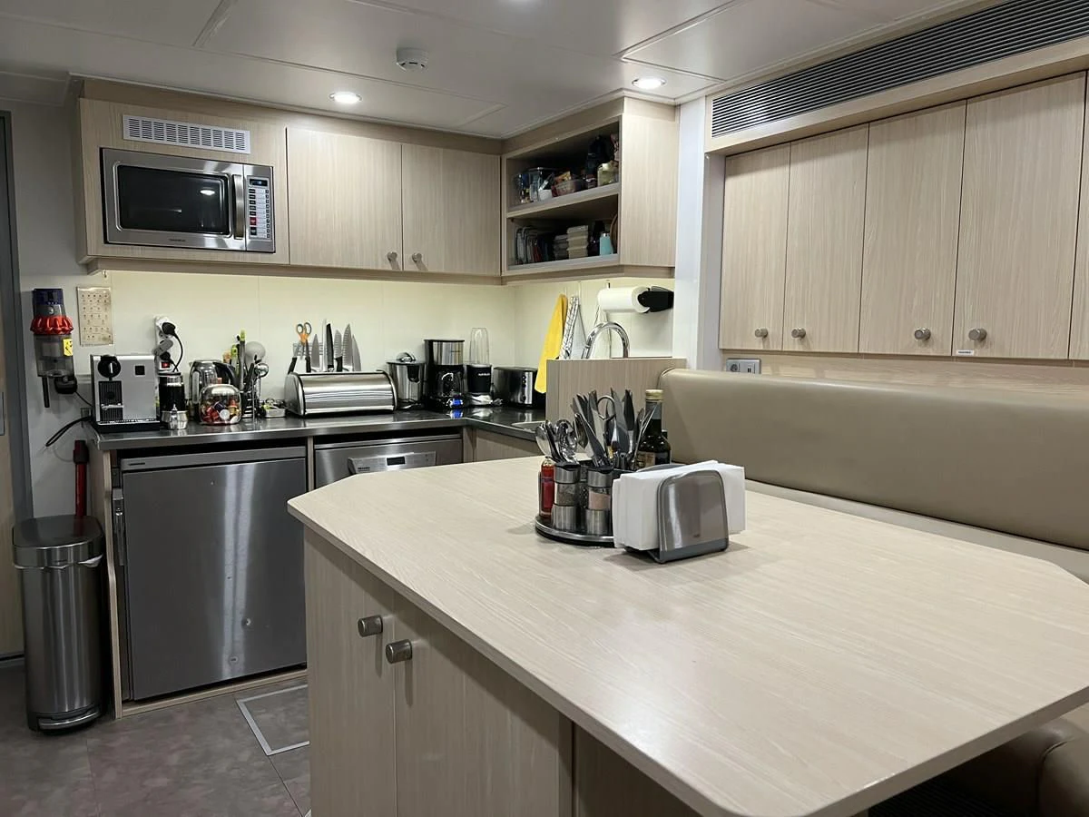 Designed in-house by Damen Yachting, interiors on BAD COMPANY SUPPORT are bright, colorful and fun with an eclectic combination of textures and a maximalist vibe. The main salon is filled with natural light from massive windows and is an incredibly comfortable space with slouchy leather armchairs and sofa, a steam trunk coffee table, vibrant wallpaper and funky artwork including hand-painted surfboards and a giant silver crocodile. The timber dining table adjacent to the lounge adds to the warmth and charm and is a great place for planning the day ahead or more formal dinners.