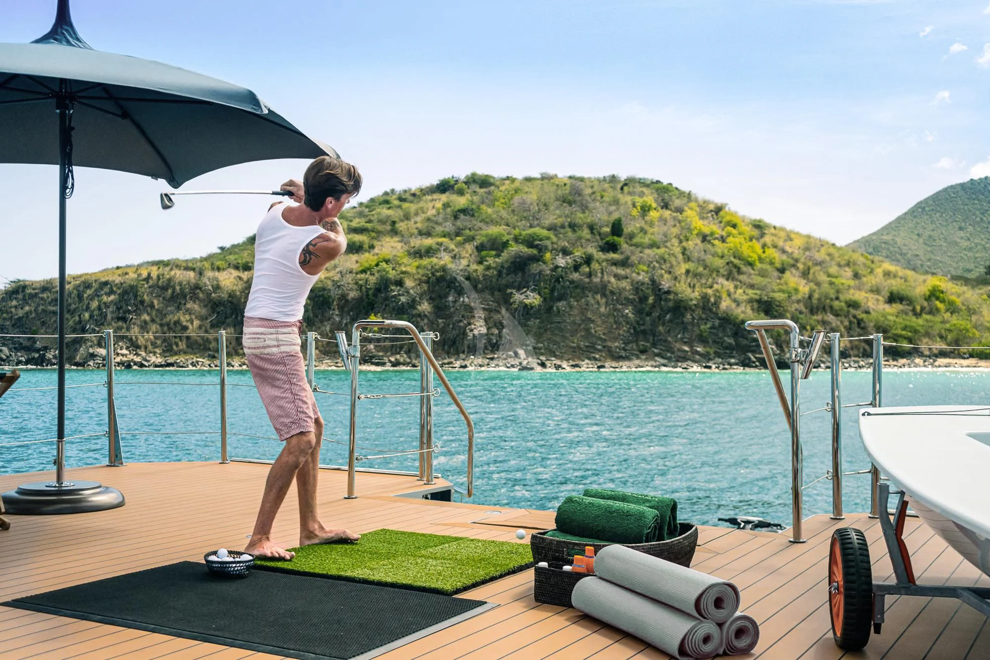 BAD COMPANY SUPPORT’s full toy box ensures there’s always plenty to do and plenty of ways to explore her chosen cruising grounds. There are SeaDoo WaveRunners, paddle boards and an array of inflatable towable toys. SeaBobs, scuba diving and snorkeling equipment unlock the underwater wonders.