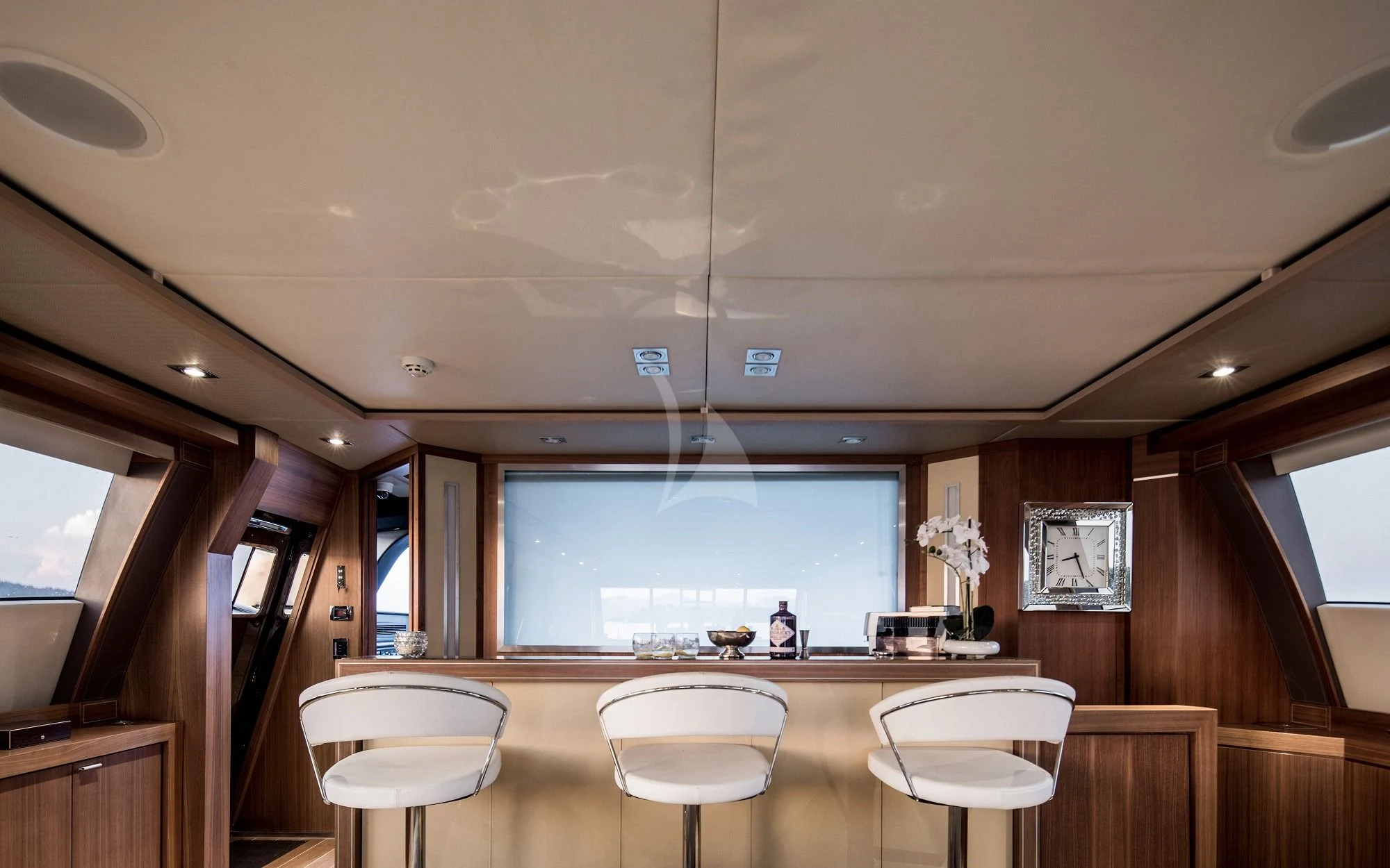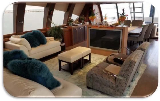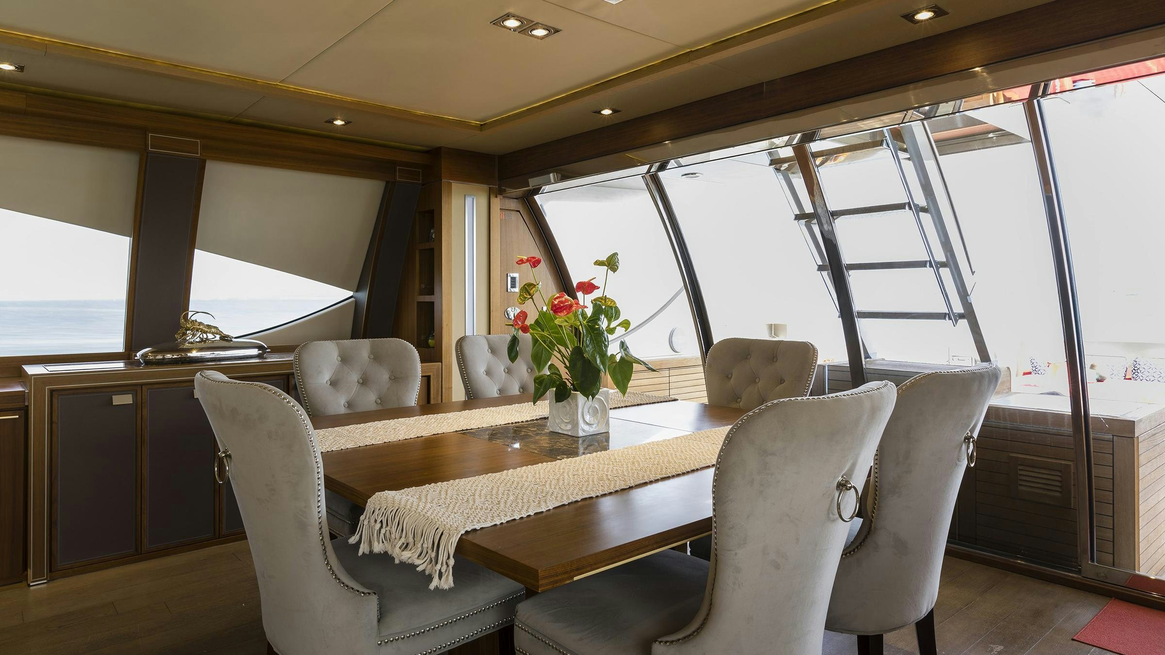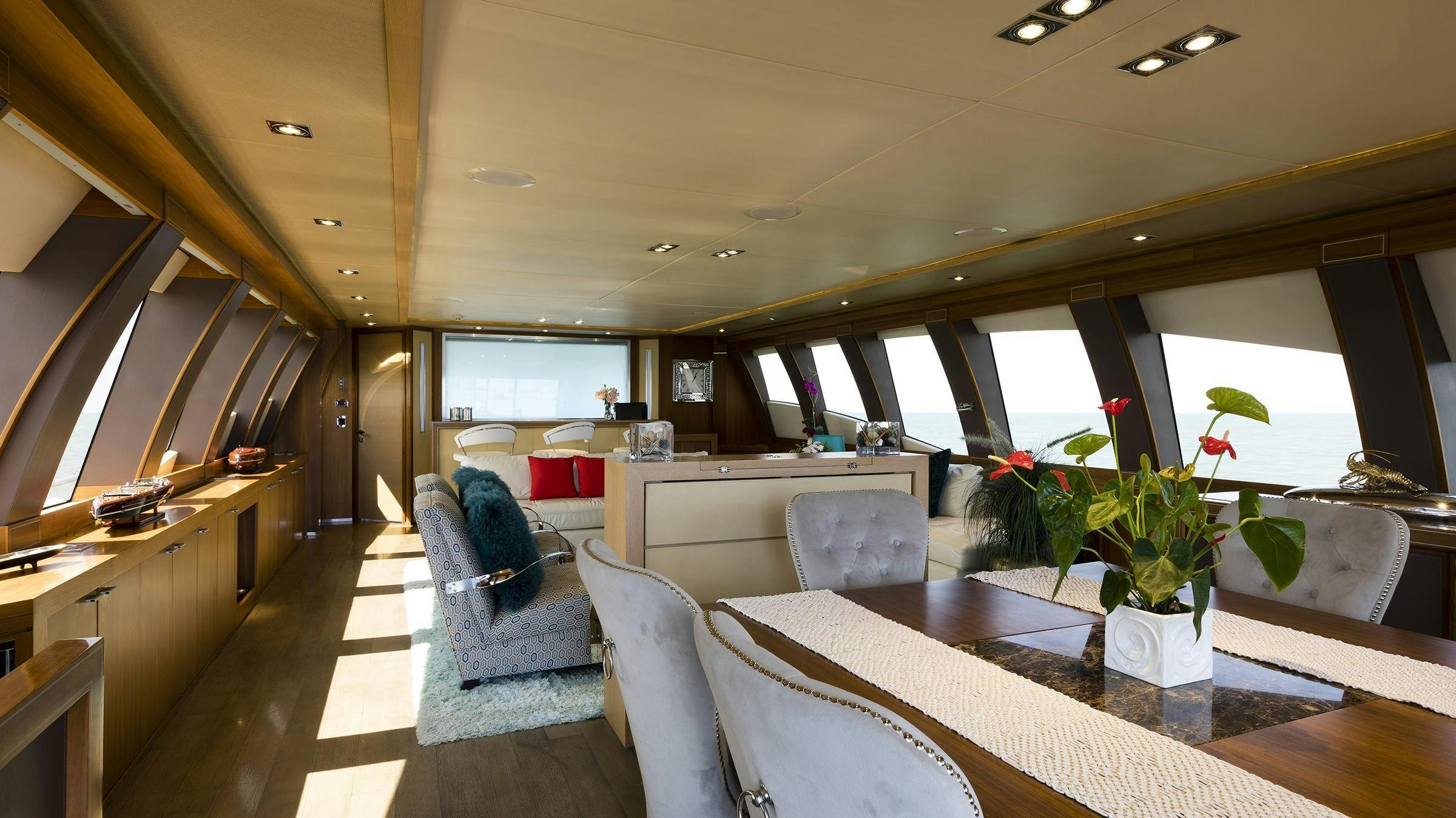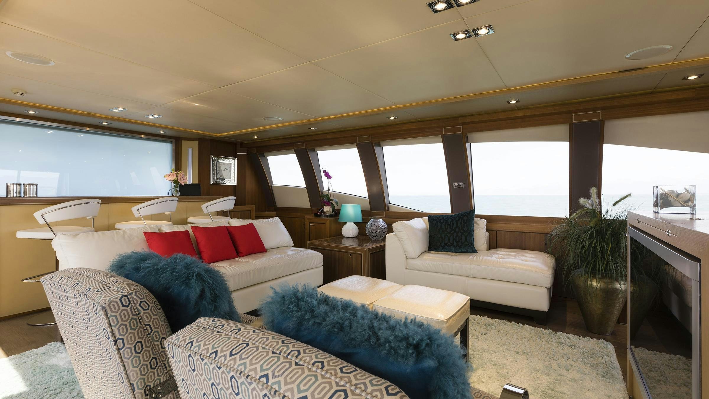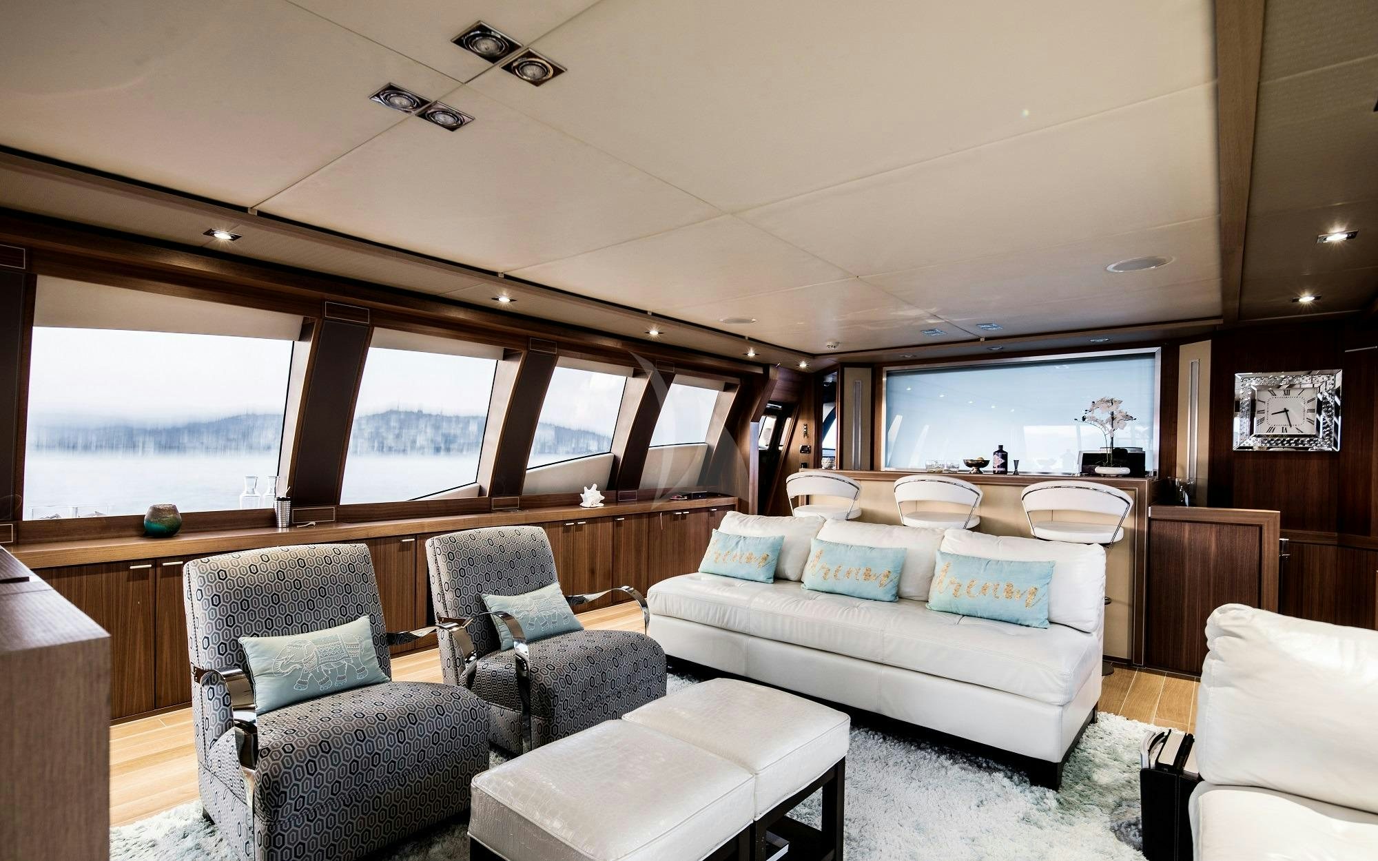 As beautiful on the inside as she is on the outside, charter yacht BAGHEERA's interior is the work of Nuvolari & Lenard. Chic and sophisticated, they feature stunning wide plant hardwood floors, fabulous textiles in neutral tones, and warm wood paneling. Luxury charter yacht BAGHEERA's salon is an impressive open-plan space with a stylish back-lit bar, comfortable lounge area and formal dining for eight. Offering incredible views and floods of natural light from the panoramic windows, the salon's sliding glass doors can be opened to the aft deck for amazing indoor/outdoor living.