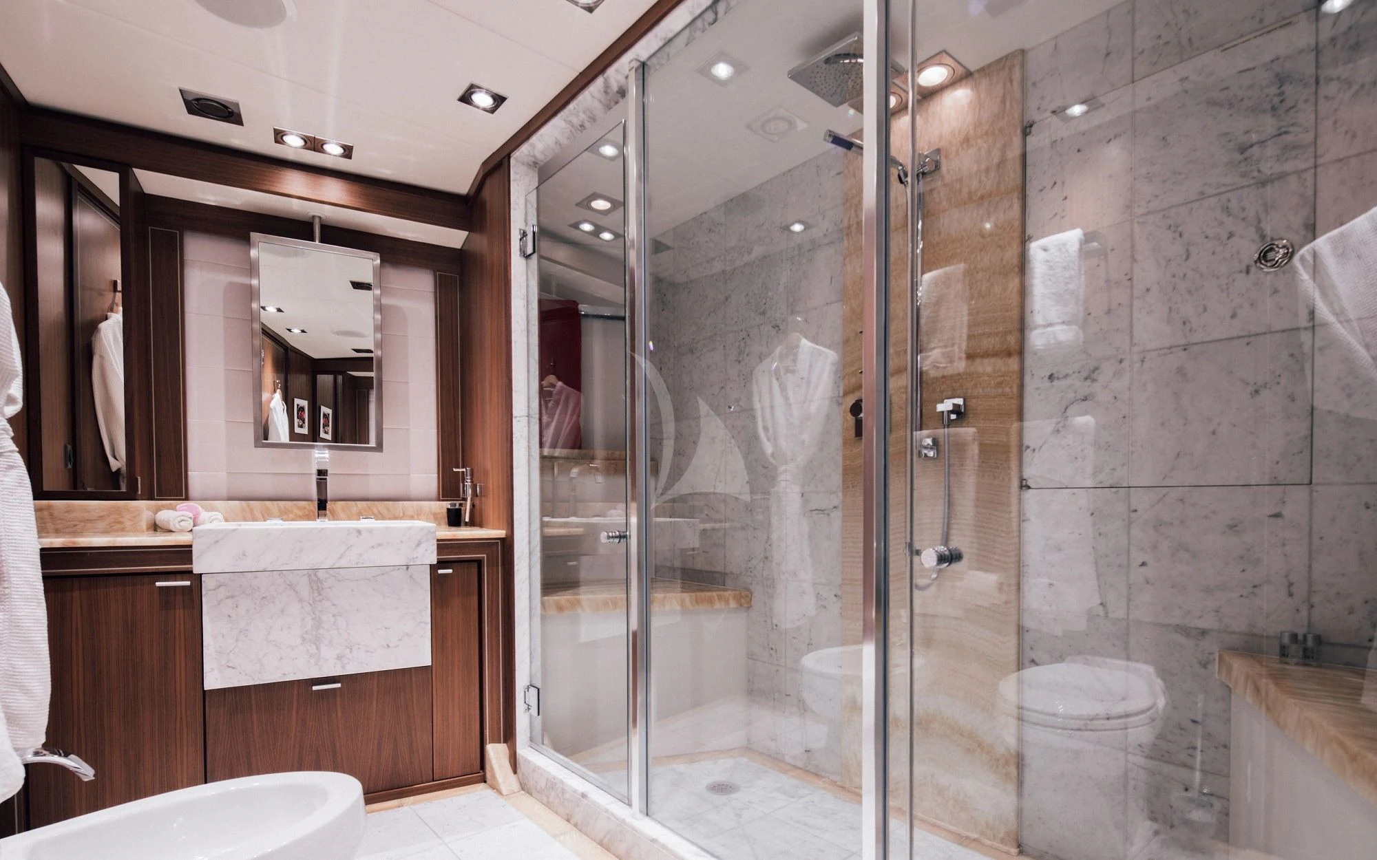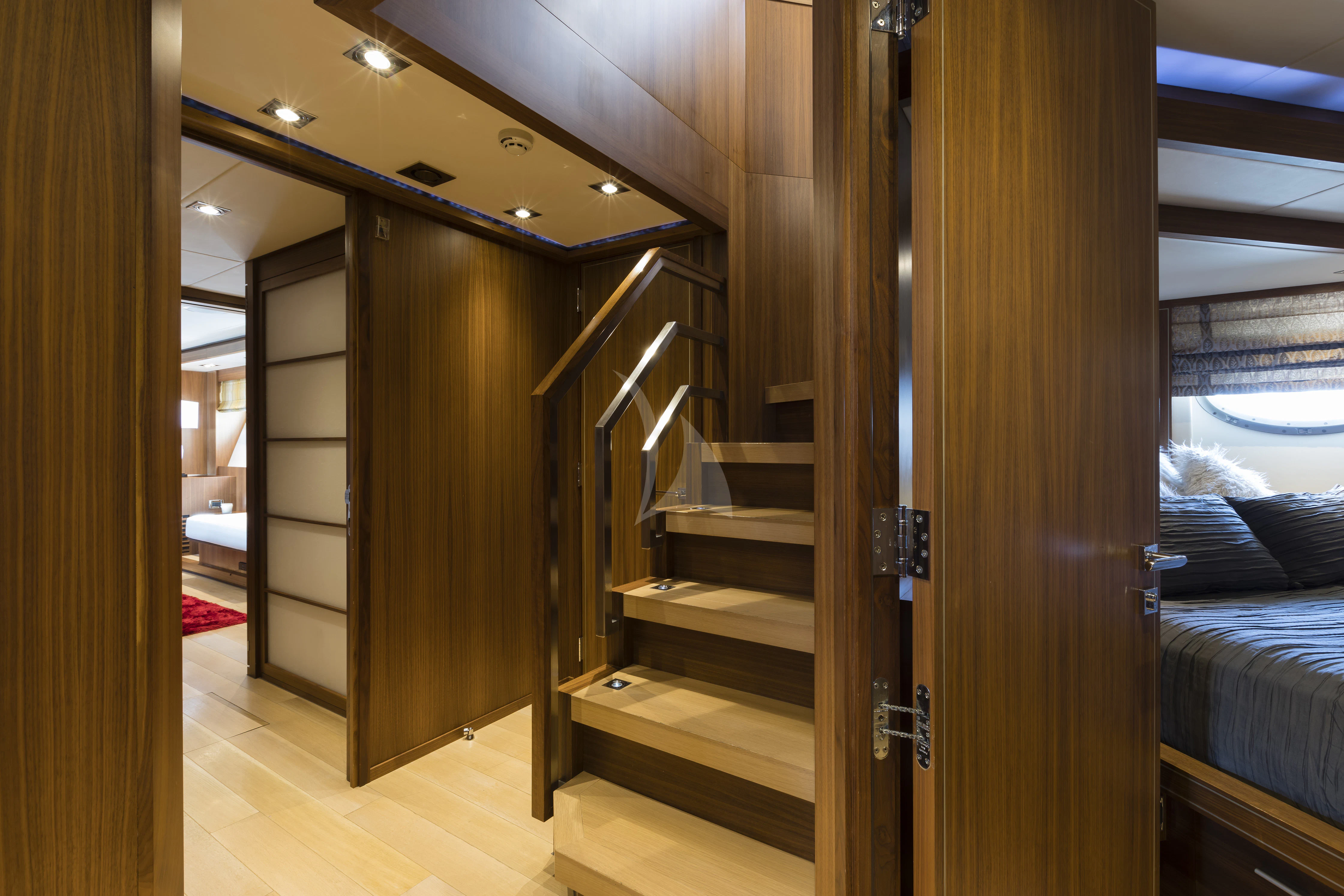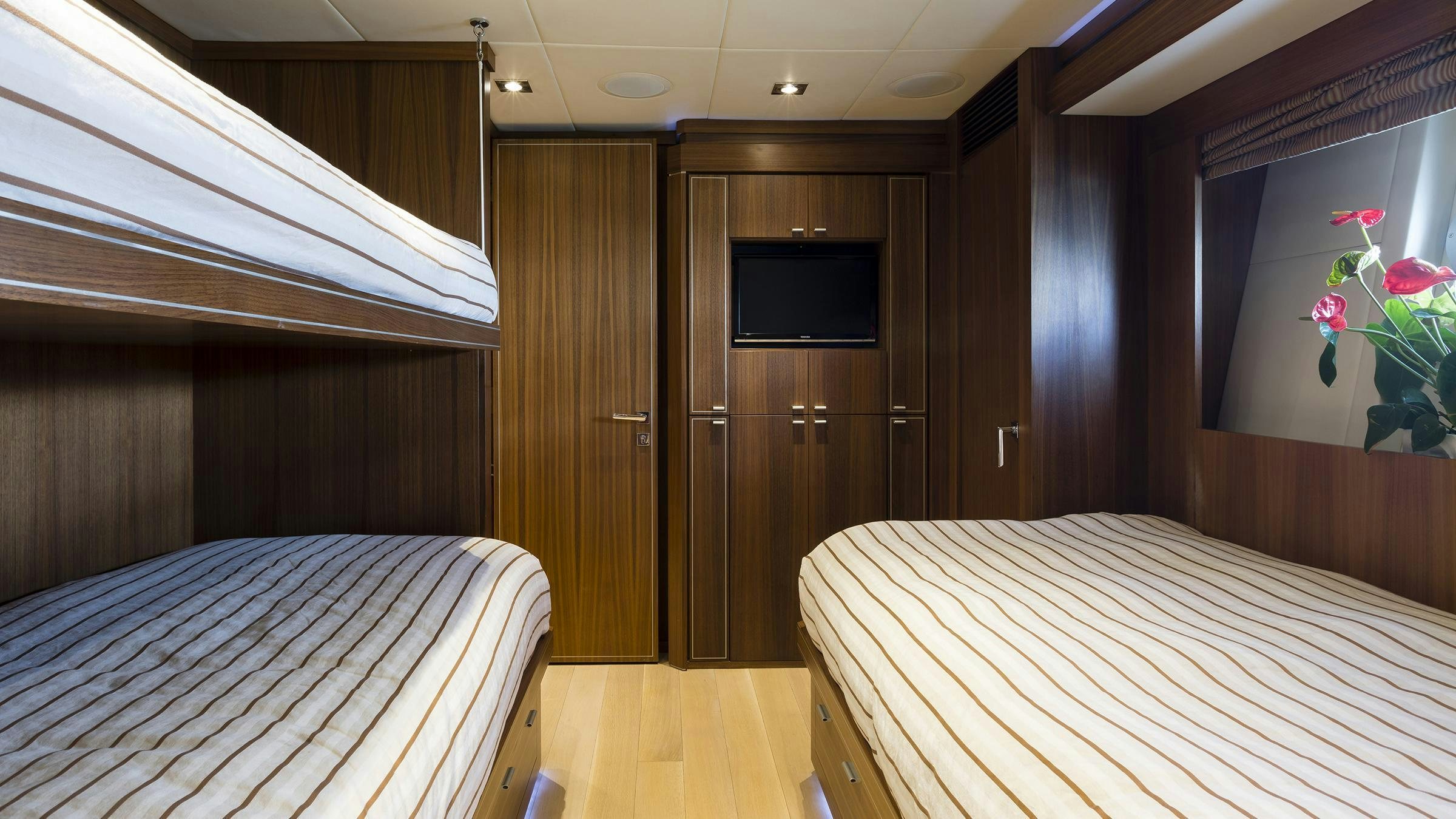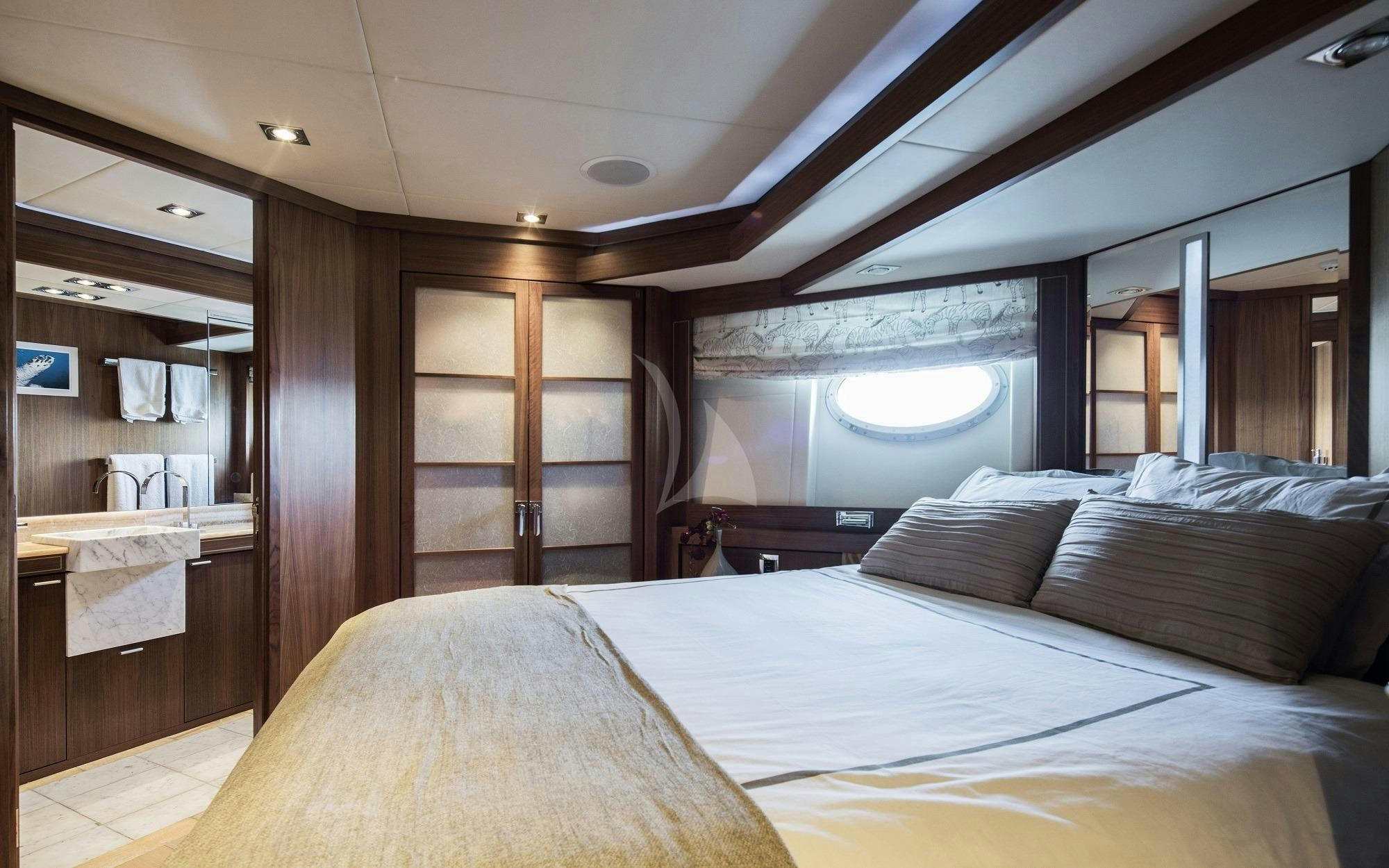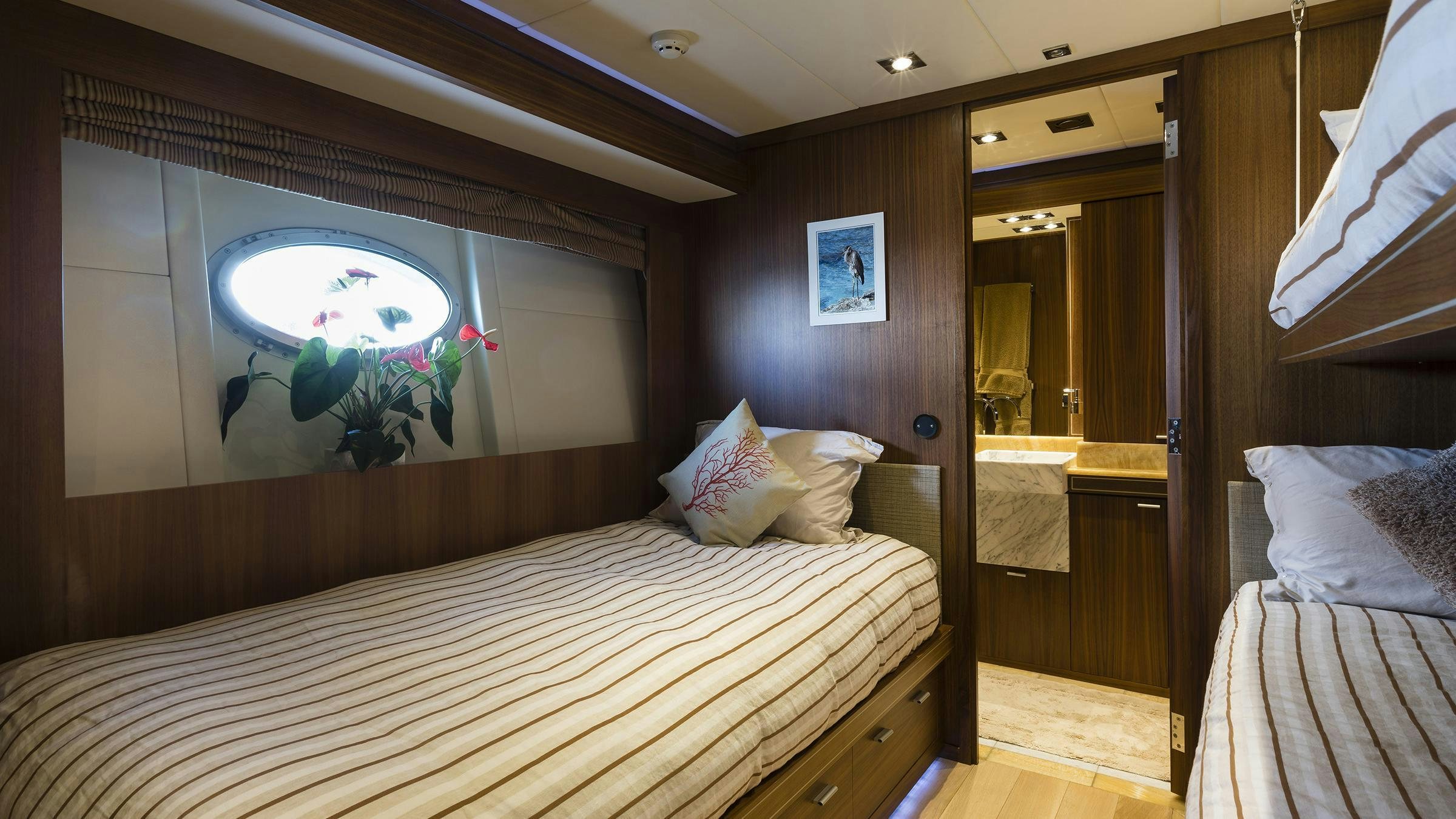 Luxury charter yacht BAGHEERA's four lower deck staterooms offer tranquil havens for up to nine guests. The remarkably spacious master stateroom spans the full width of the yacht and features the same chic décor found elsewhere in BAGHEERA's interior. There's a king-size bed, sofa, exquisite cabinetry, and his and hers en-suite bathroom. The motor yacht's two VIP staterooms boast queen size beds and generous en-suite bathrooms, while the handsome twin cabin has the benefit of an additional Pullman bunk, making it a perfect room for children.