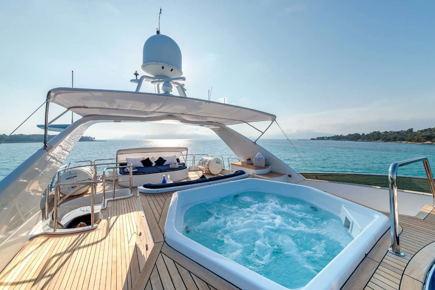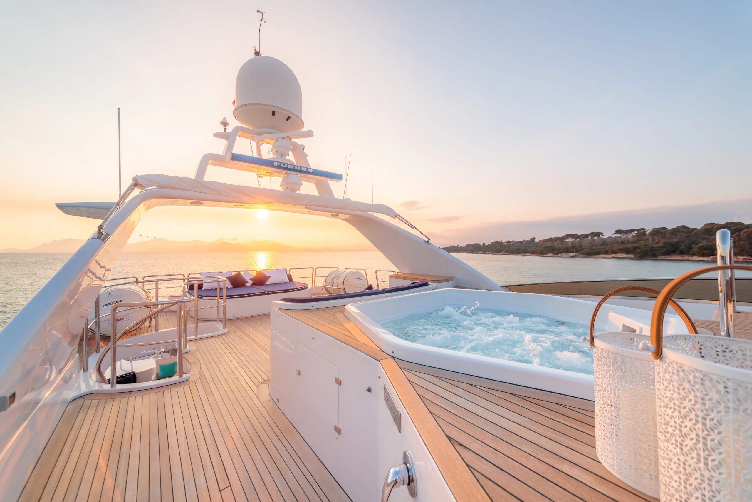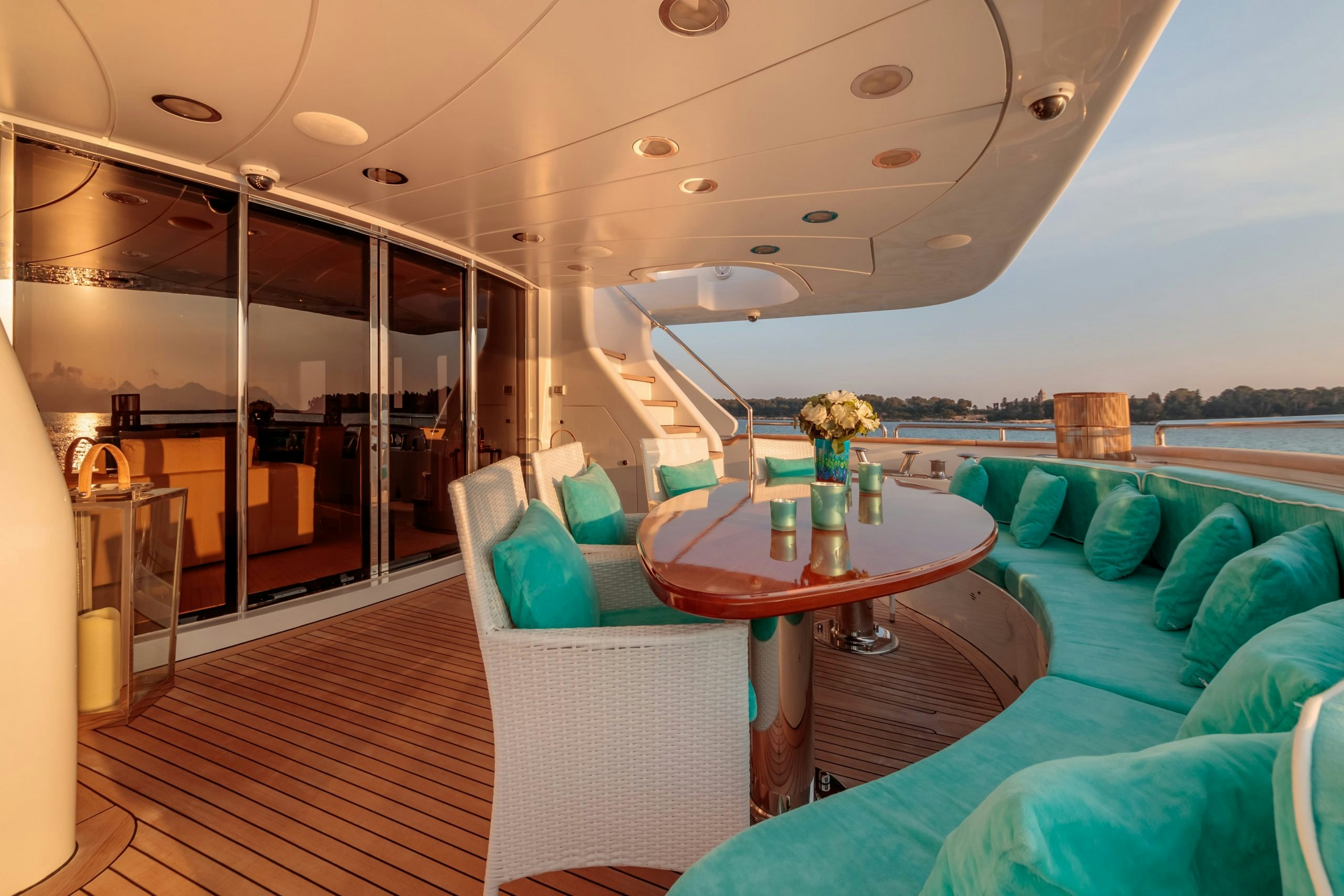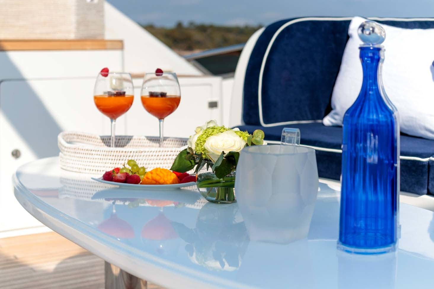 The luxurious interior is complemented by stunning outdoor spaces featuring everything required for relaxation and fun in the sun. Unwind on her large sundeck, which houses a jacuzzi and sheltered lounging spaces or open sunbathing areas. The upper salon opens up to the upper deck where there is a table for 10 guests to dine alfresco.