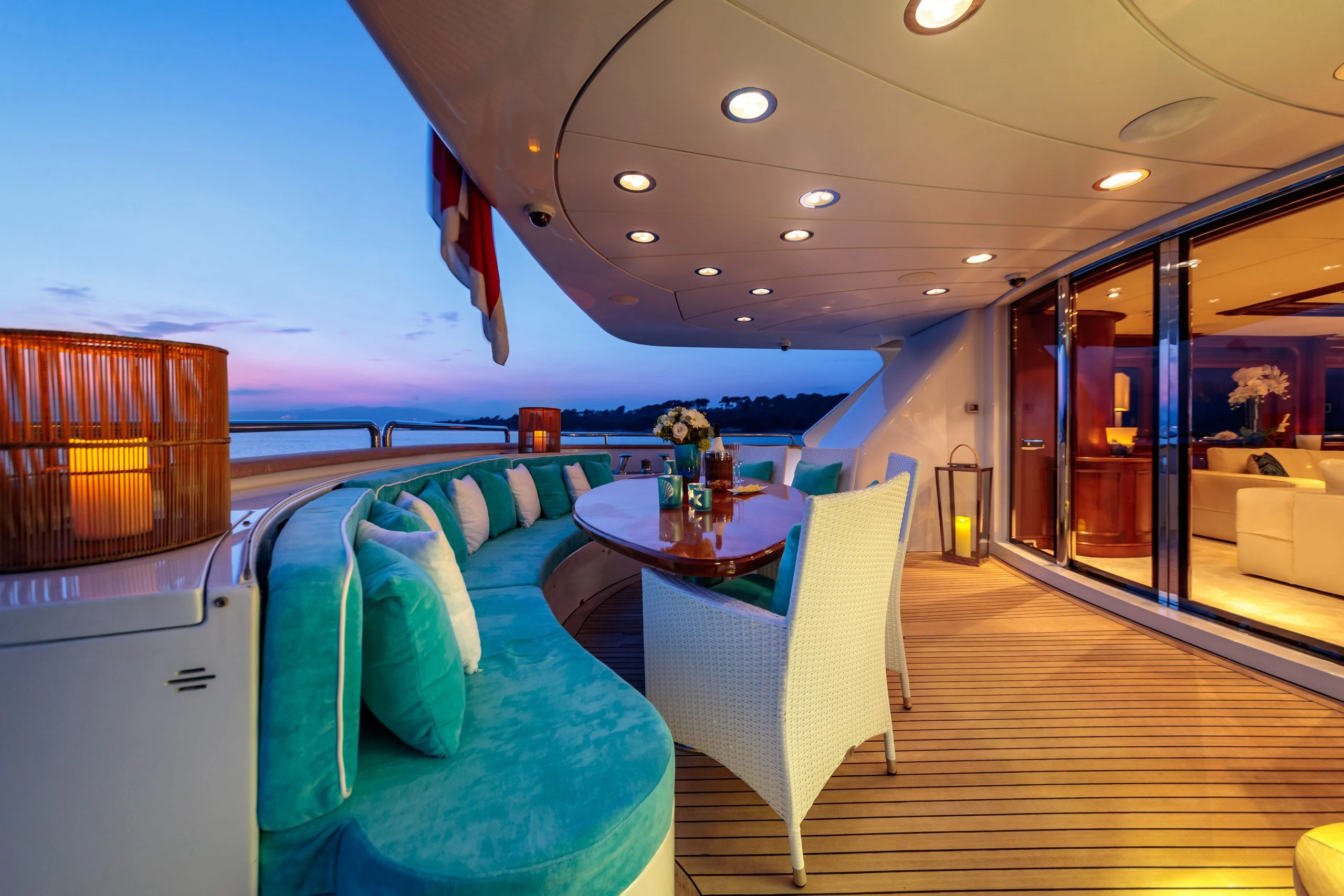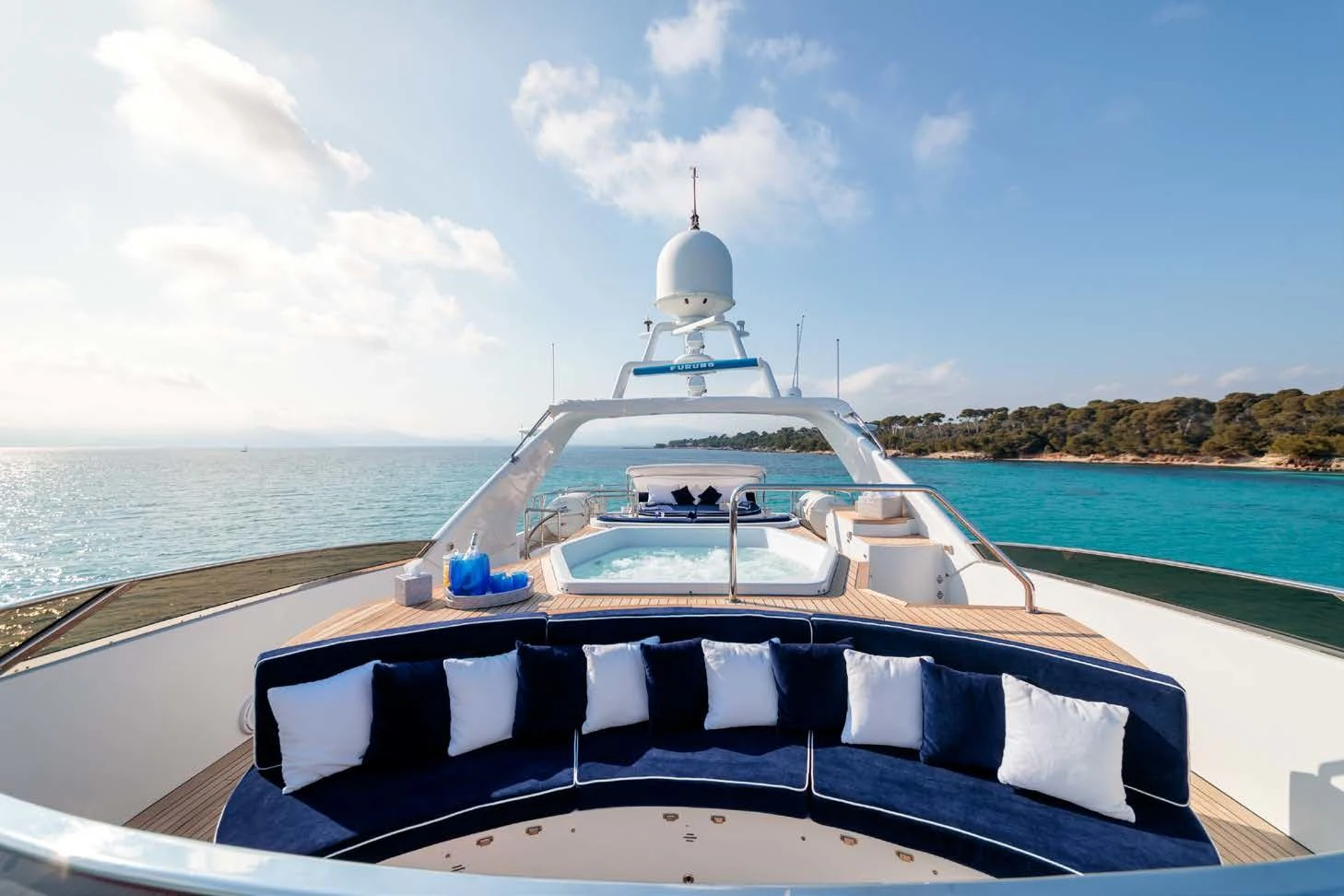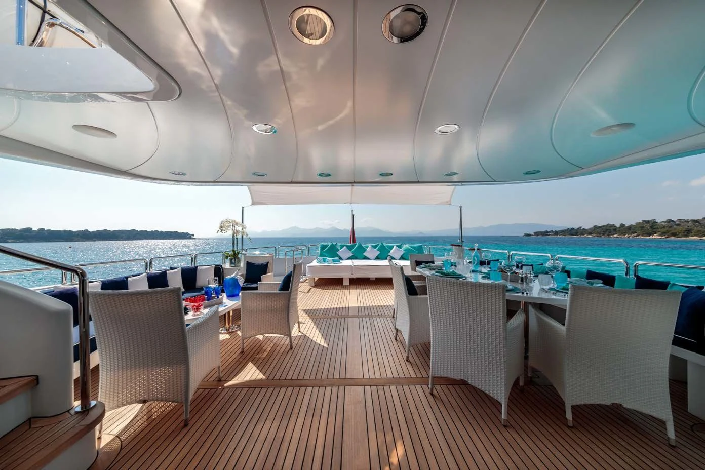The luxurious interior is complemented by stunning outdoor spaces featuring everything required for relaxation and fun in the sun. Unwind on her large sundeck, which houses a jacuzzi and sheltered lounging spaces or open sunbathing areas. The upper salon opens up to the upper deck where there is a table for 10 guests to dine alfresco.