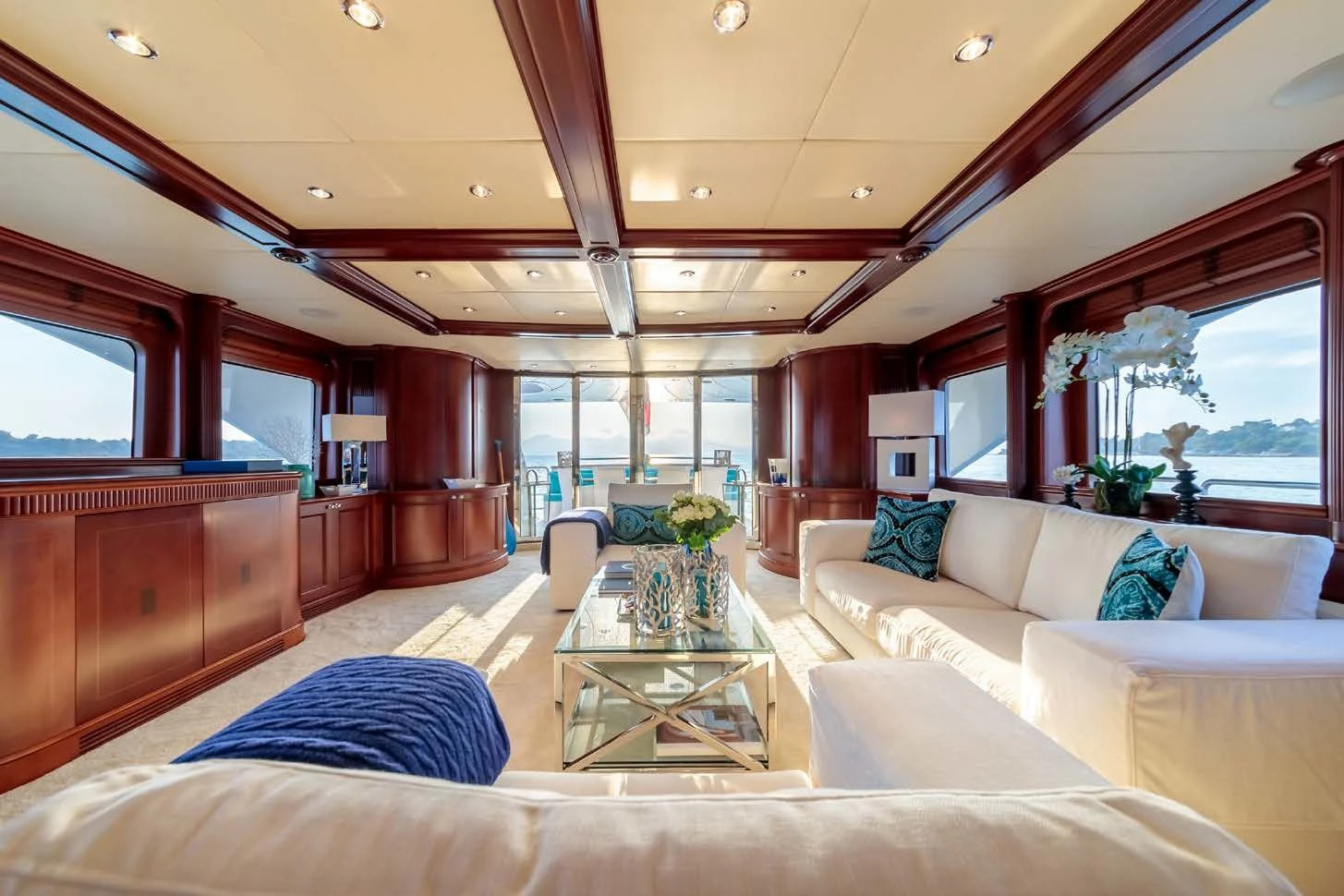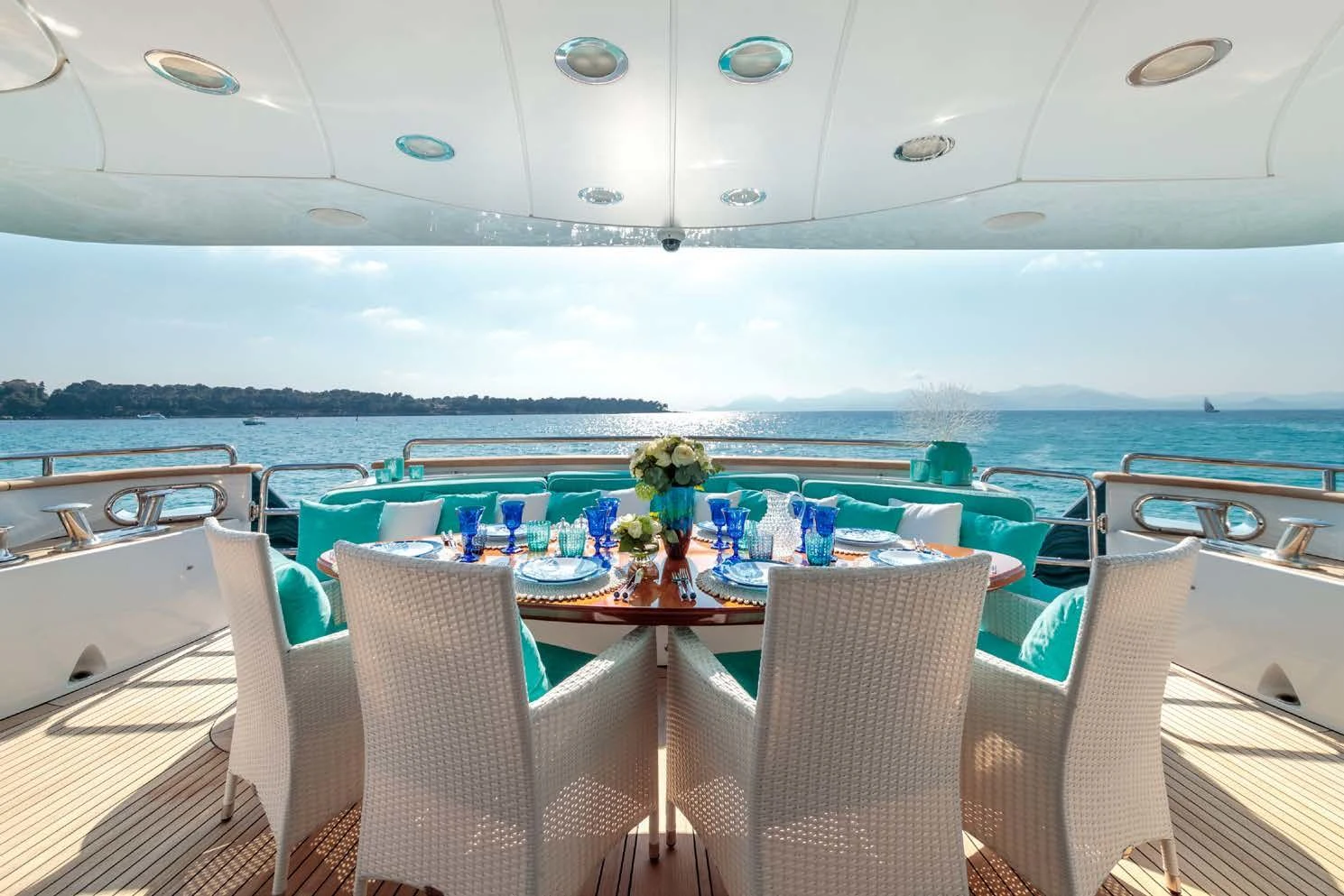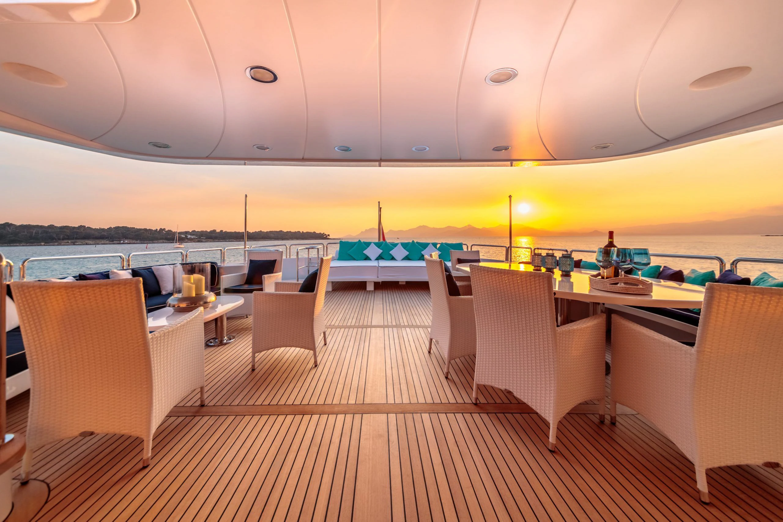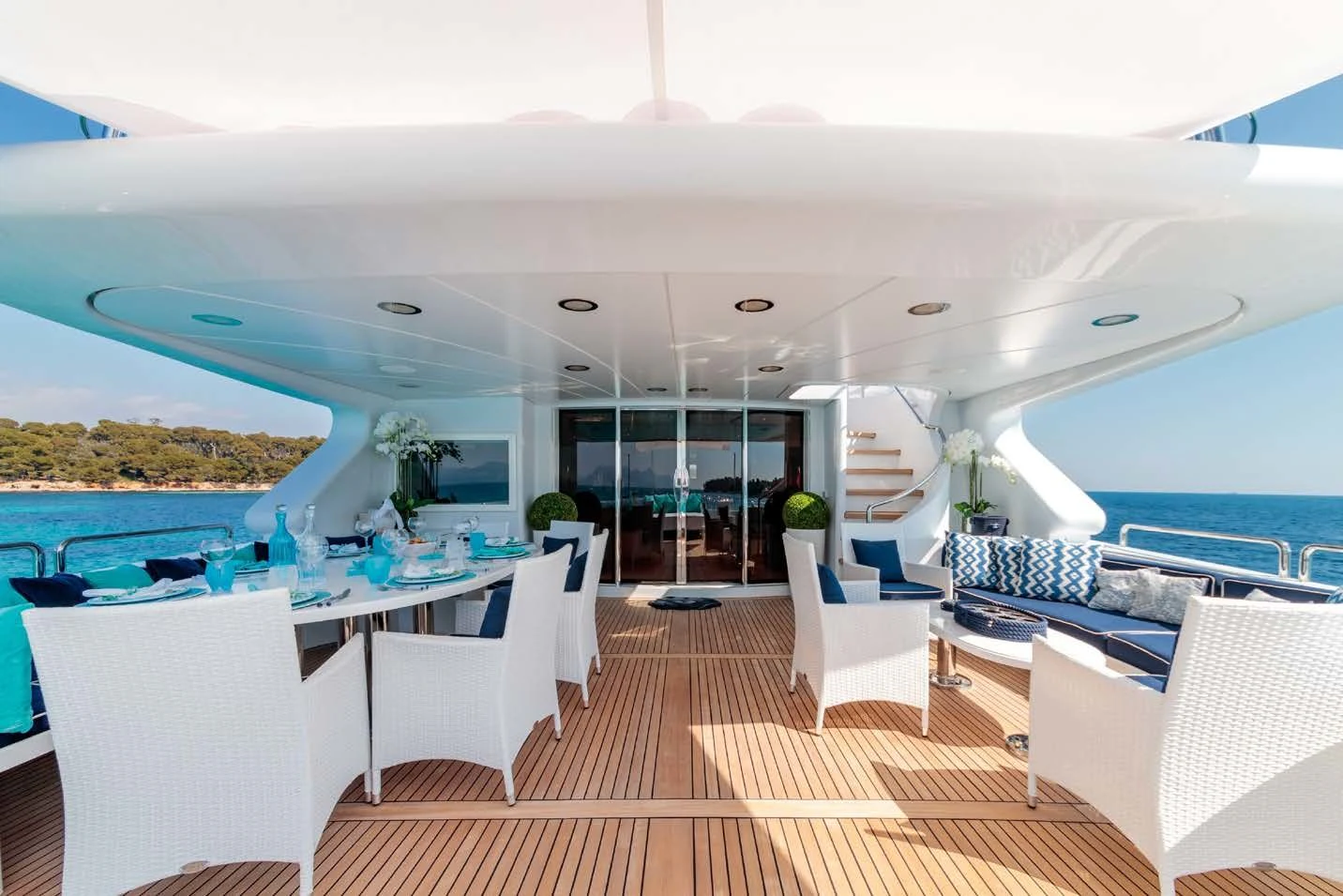 The luxurious interior is complemented by stunning outdoor spaces featuring everything required for relaxation and fun in the sun. Unwind on her large sundeck, which houses a jacuzzi and sheltered lounging spaces or open sunbathing areas. The upper salon opens up to the upper deck where there is a table for 10 guests to dine alfresco.