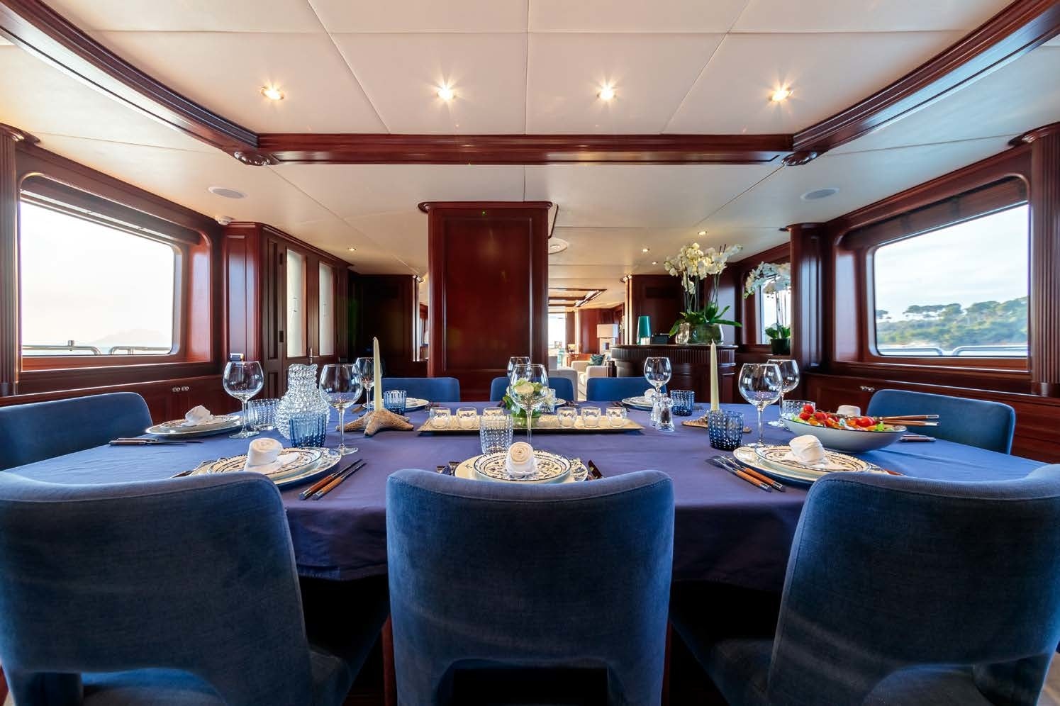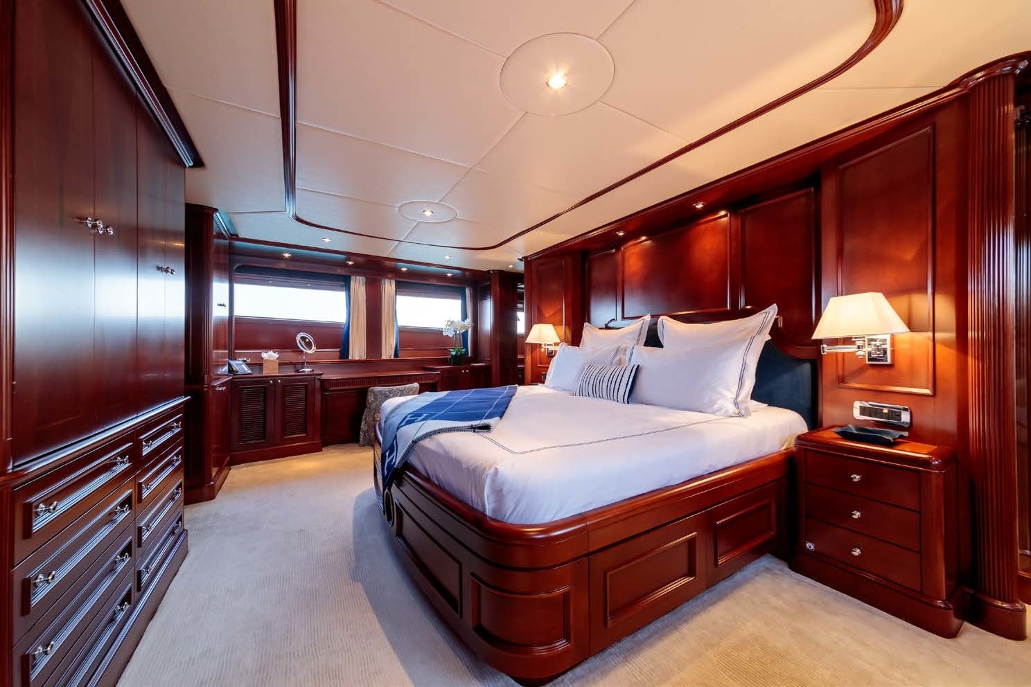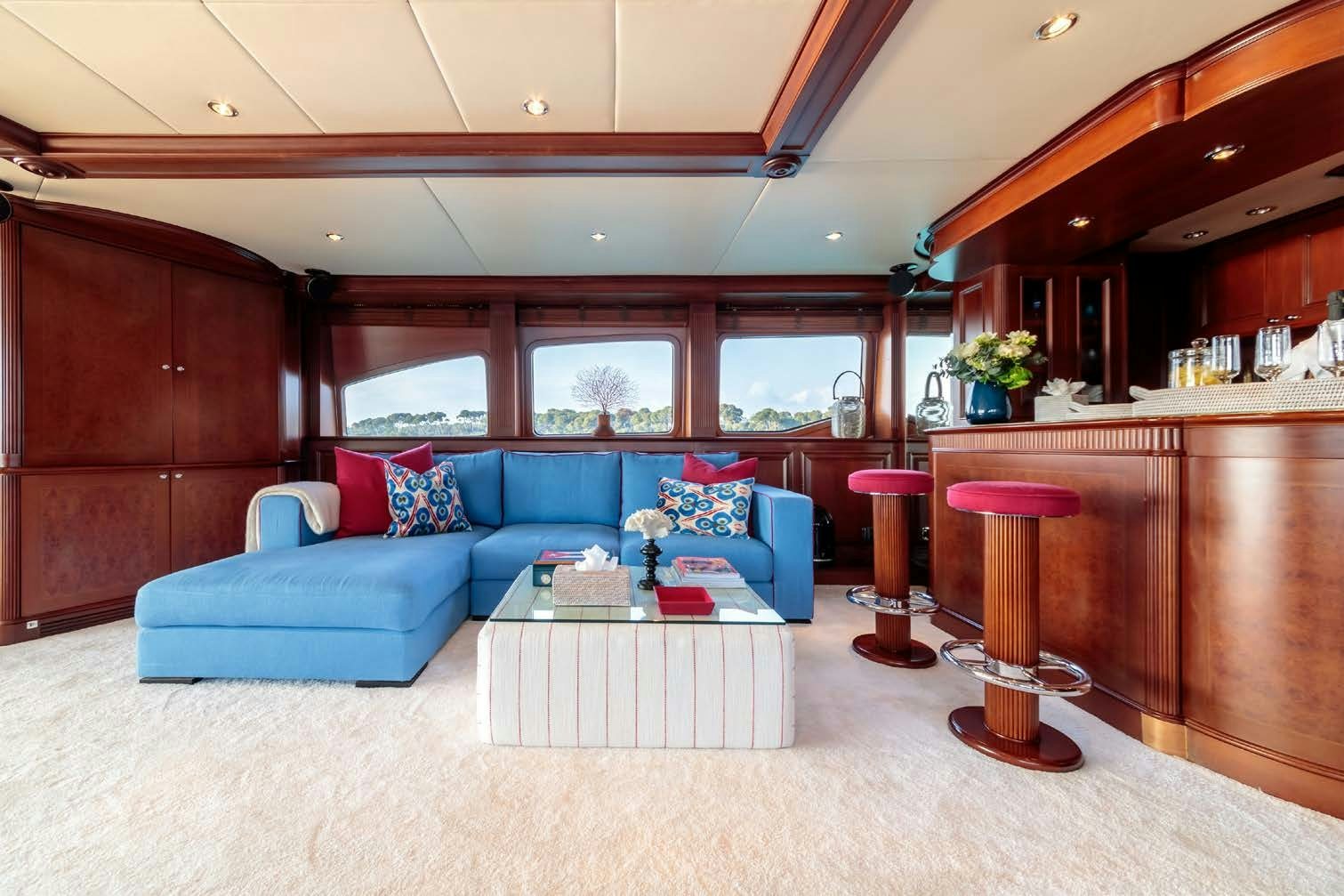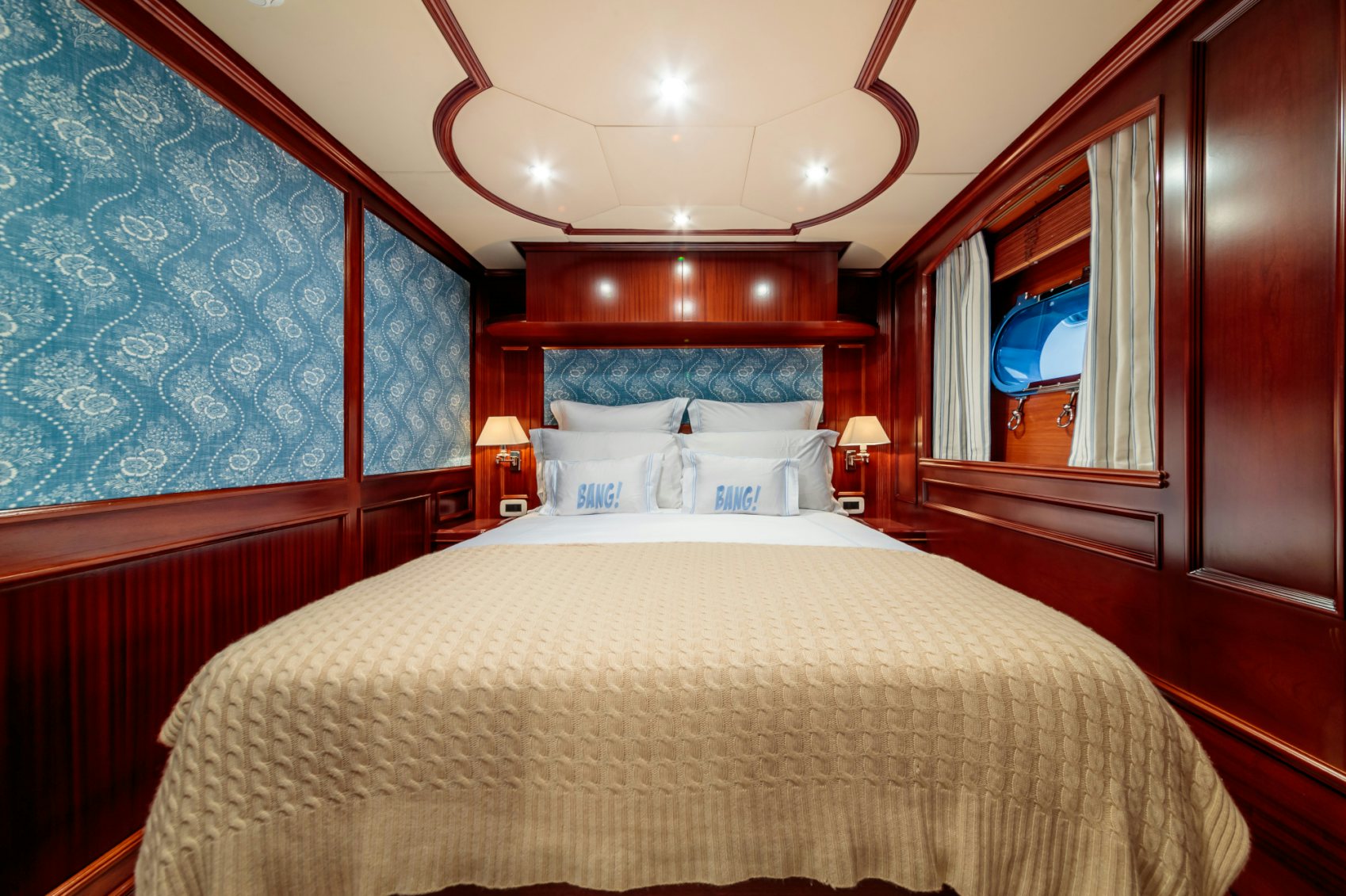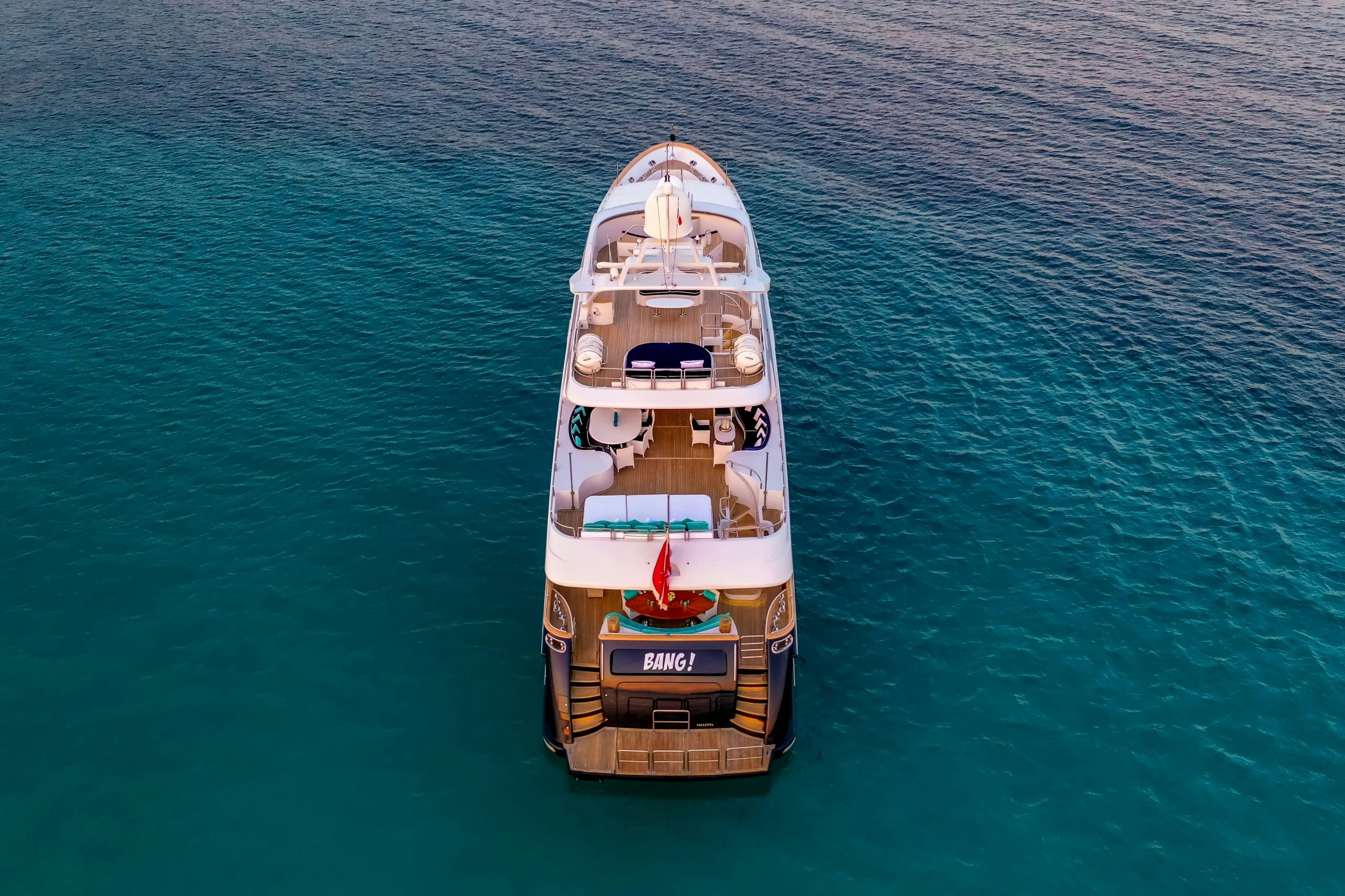 BANG!’s interior décor boasts nautical touches and Mediterranean influences with sumptuous fabrics interspersed with contemporary detailing. Her main deck features areas for formal and informal dining and an extravagant and stylish main salon that evokes relaxation courtesy of its striking Mediterranean-inspired style and color palette. The main salon is separated from the formal dining area by a bar; the upper salon also has a full bar, a small office area and large lounging area.