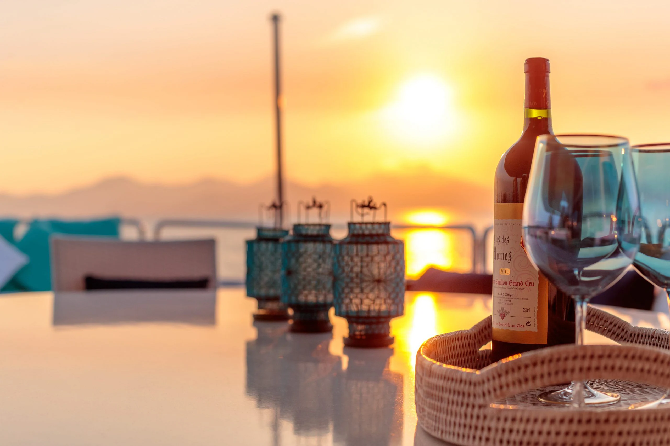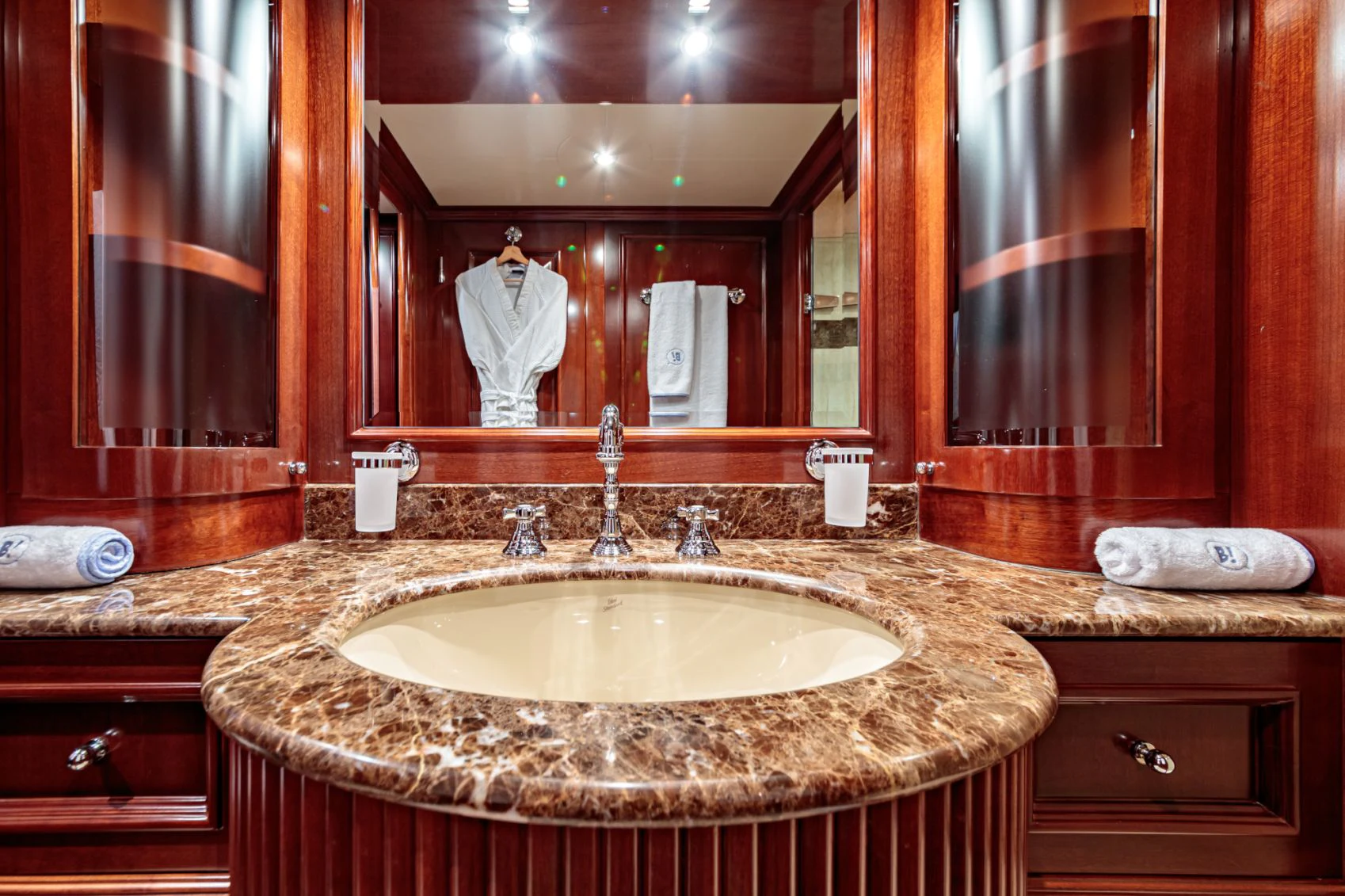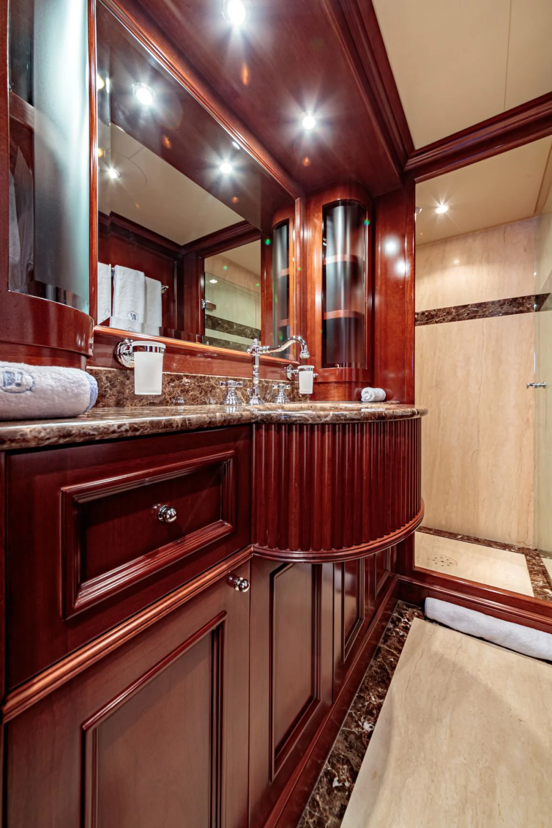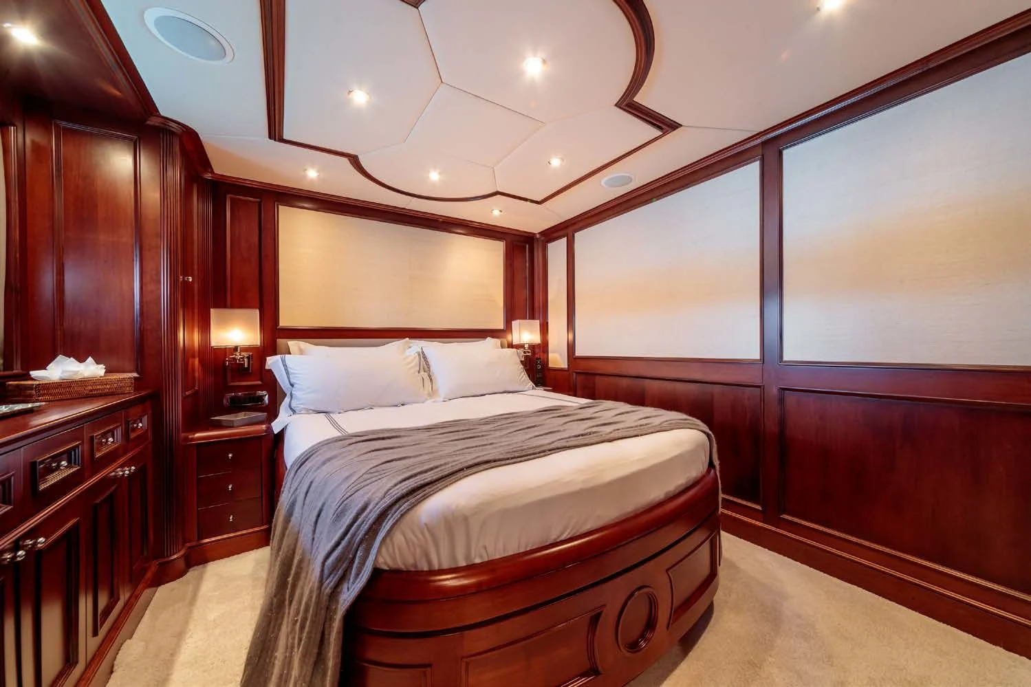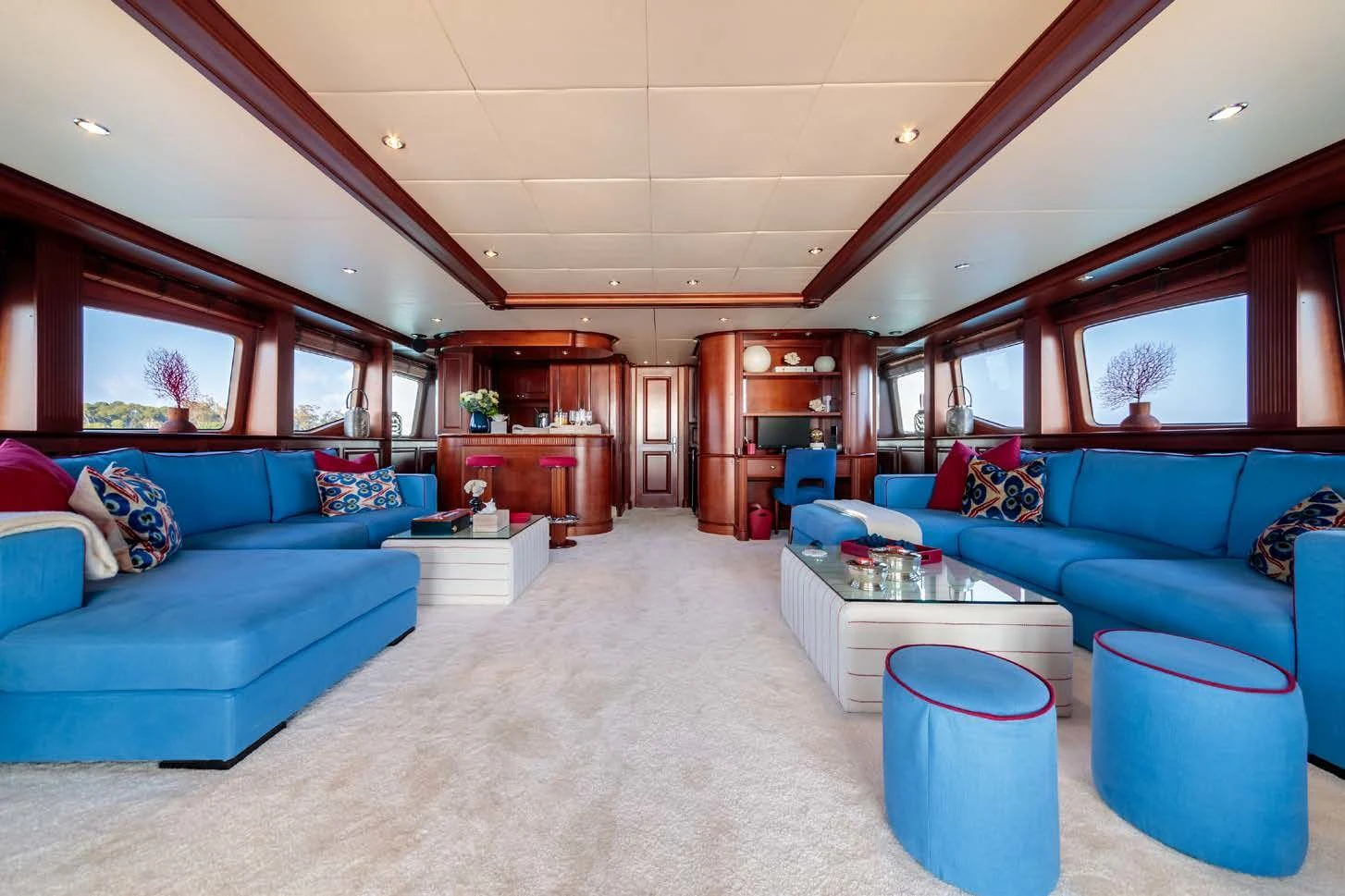 BANG!’s interior décor boasts nautical touches and Mediterranean influences with sumptuous fabrics interspersed with contemporary detailing. Her main deck features areas for formal and informal dining and an extravagant and stylish main salon that evokes relaxation courtesy of its striking Mediterranean-inspired style and color palette. The main salon is separated from the formal dining area by a bar; the upper salon also has a full bar, a small office area and large lounging area.