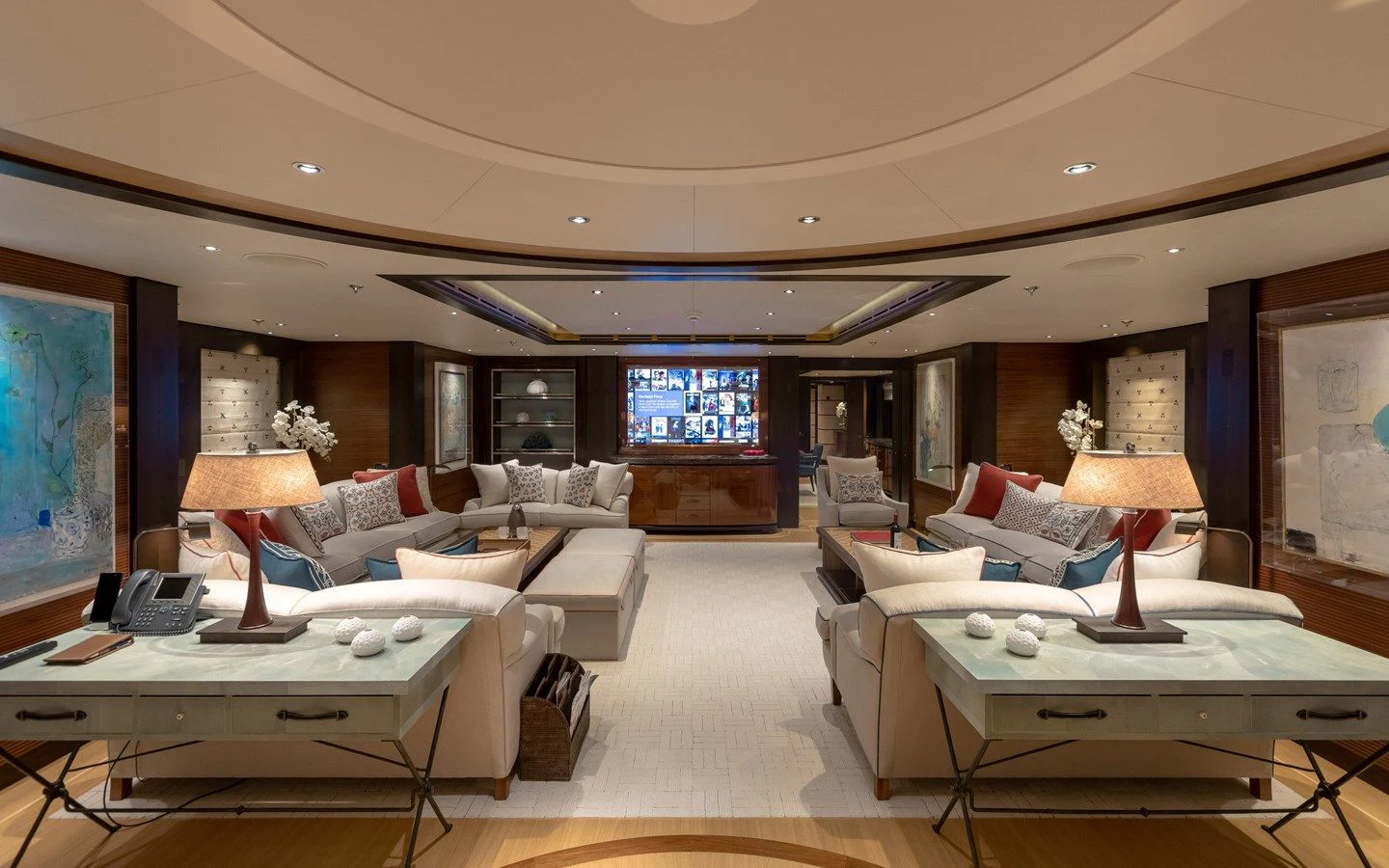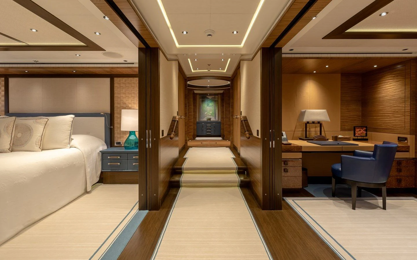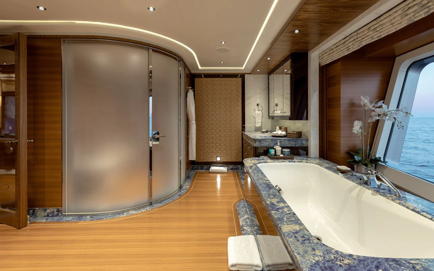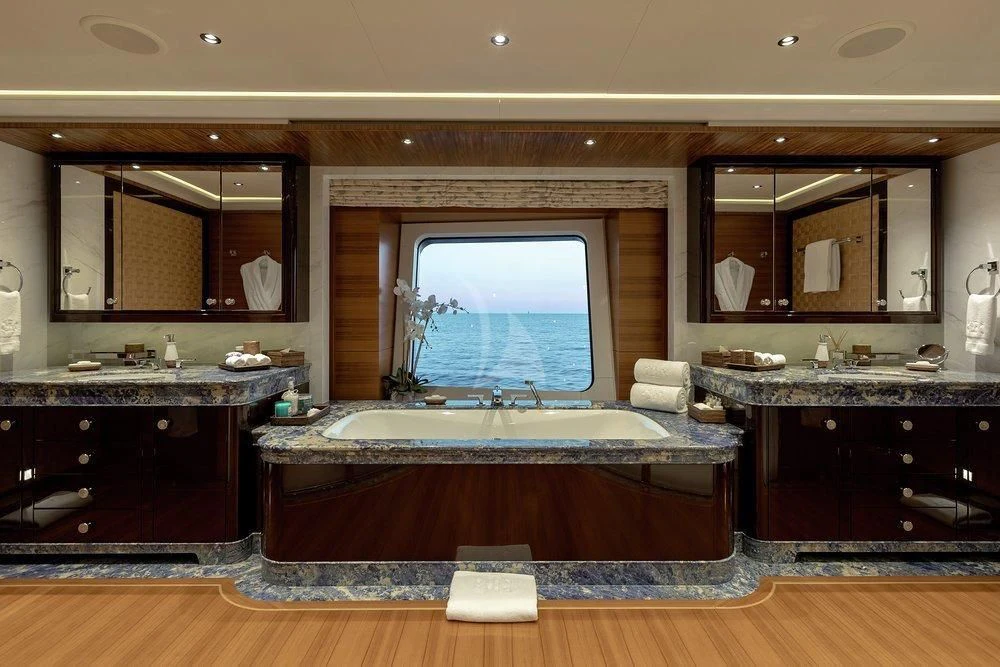 At the end of the day, the superyacht’s seven sumptuous staterooms offer tranquil havens to rejuvenate after a fun day on the water. BATON ROUGE features an expansive, 1,000-square meter, main deck master suite with two private offices, a dressing room and a lavish en-suite bath with a rainfall shower and blue marble bathtub. The yacht also features two upper deck VIP staterooms and four double staterooms on the lower deck (two staterooms convert into doubles).