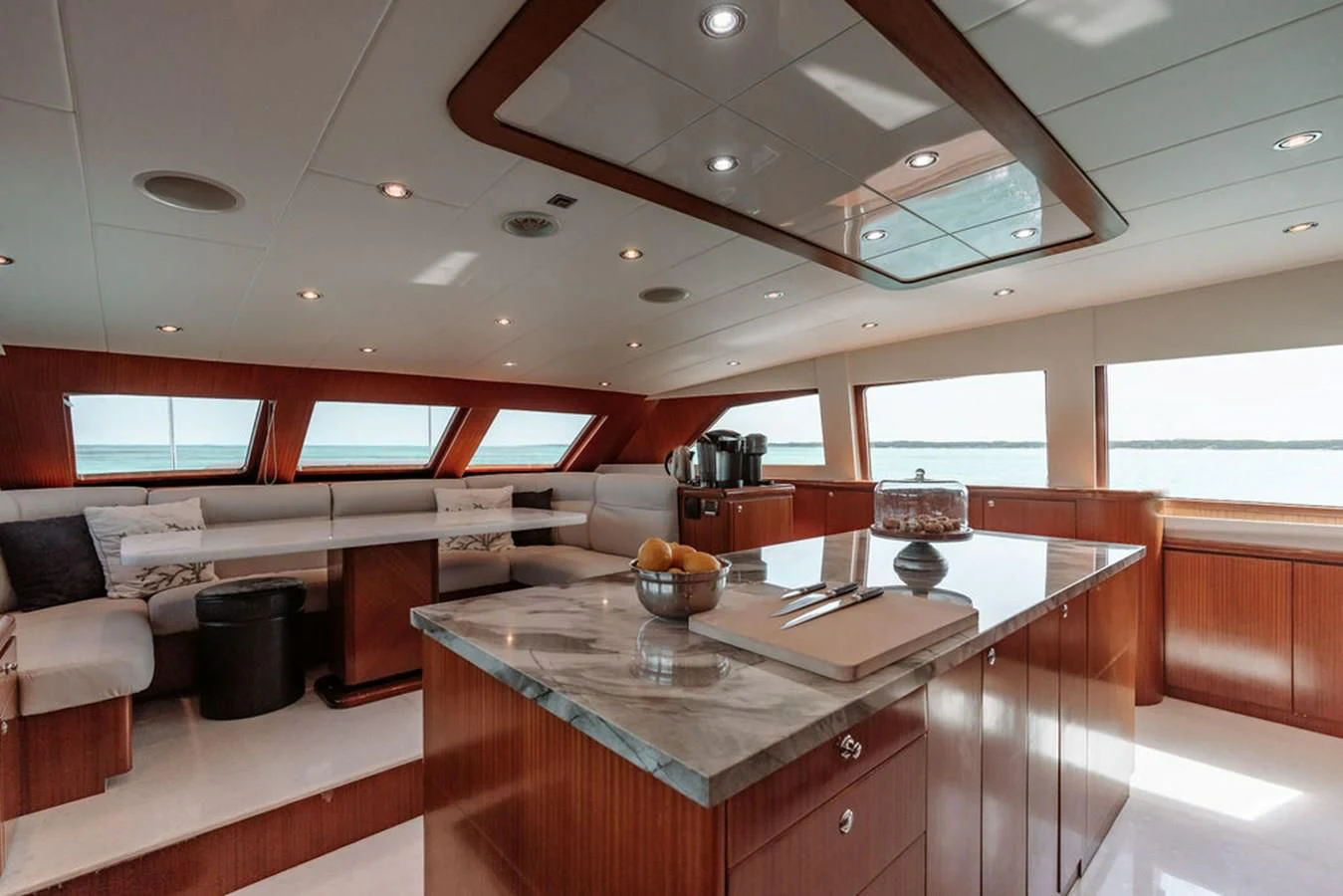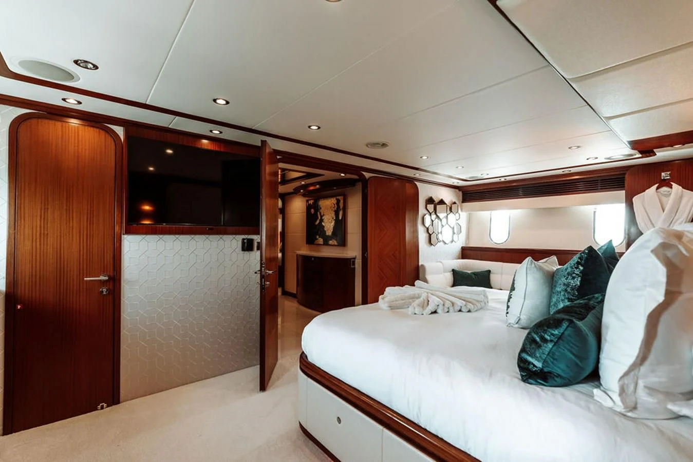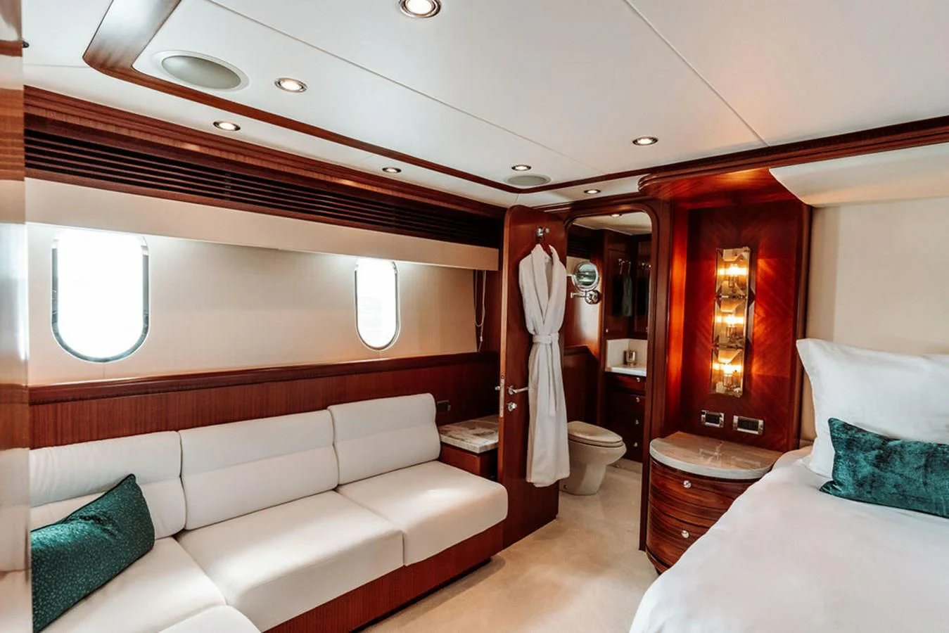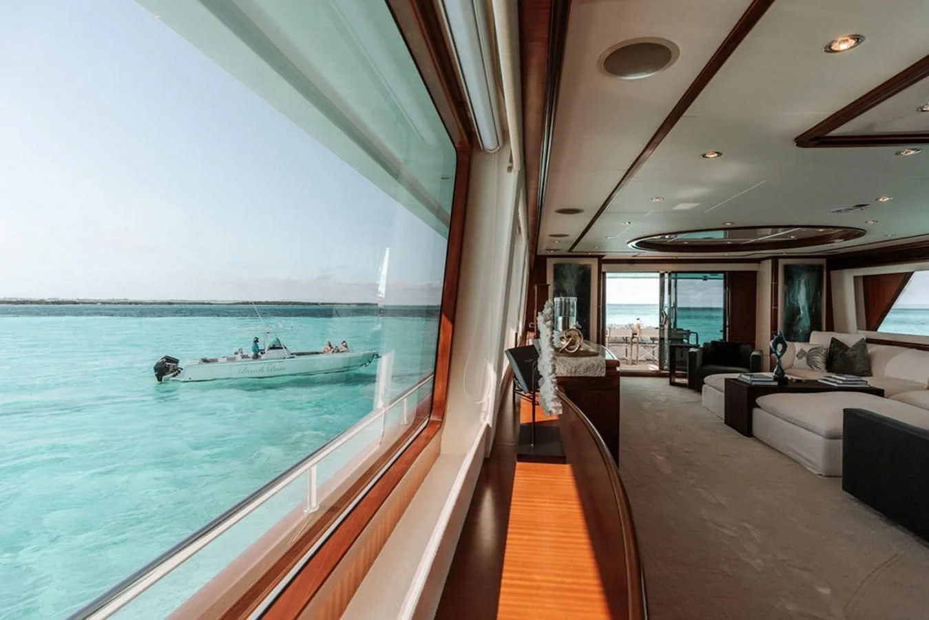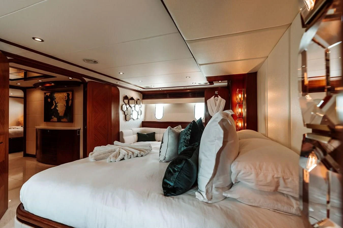 BEACHFRONT’s interior has a contemporary style and well-thought-out layout. She is easily adapted to any situation. She features a high-tech home theater with more than 500 HD movies and a music library of more than 70,000 songs. Airplay broadcast is available throughout the yacht with ability to play music through speakers almost anywhere. BEACHFRONT has five lavish staterooms, catering to up to 10 guests. Her full-beam master has double walk-in closest and a lounge. Four additional staterooms, including a VIP forward all have en-suite bathrooms. A guest common area is located forward.