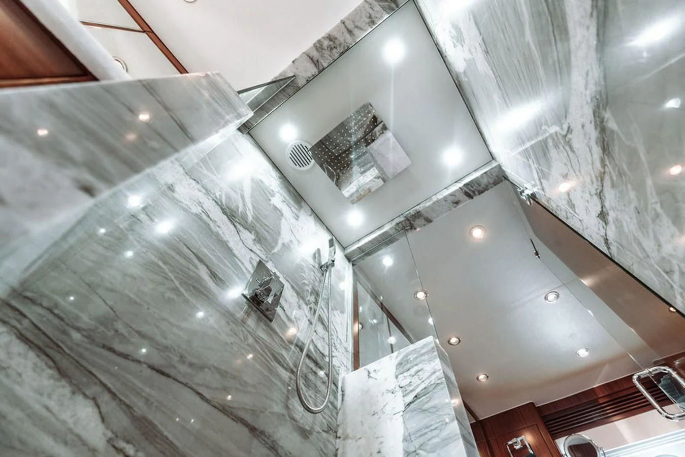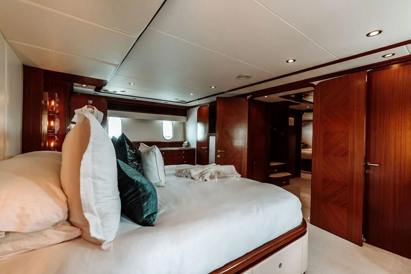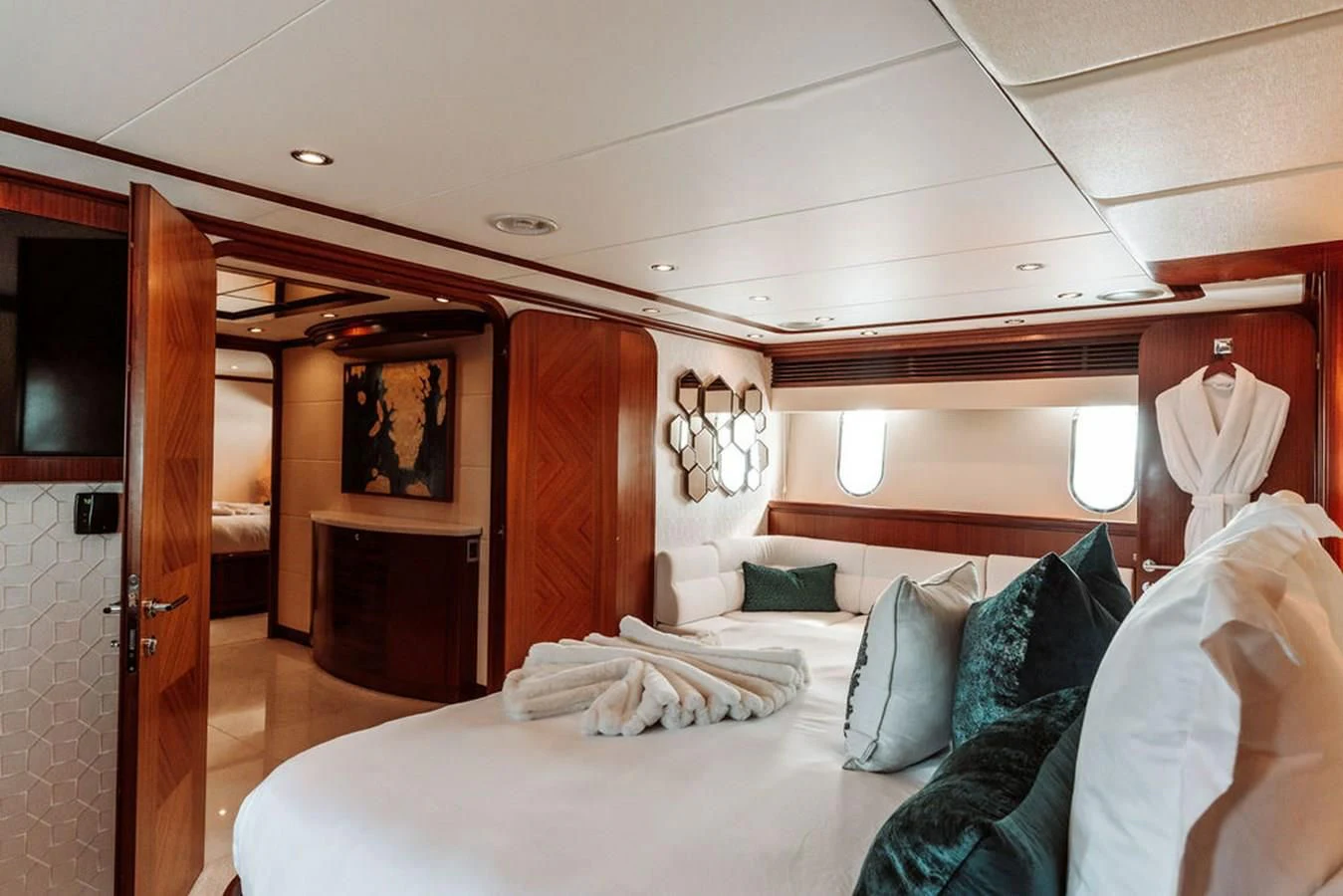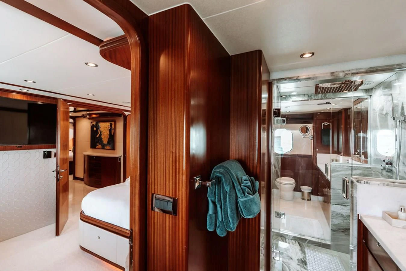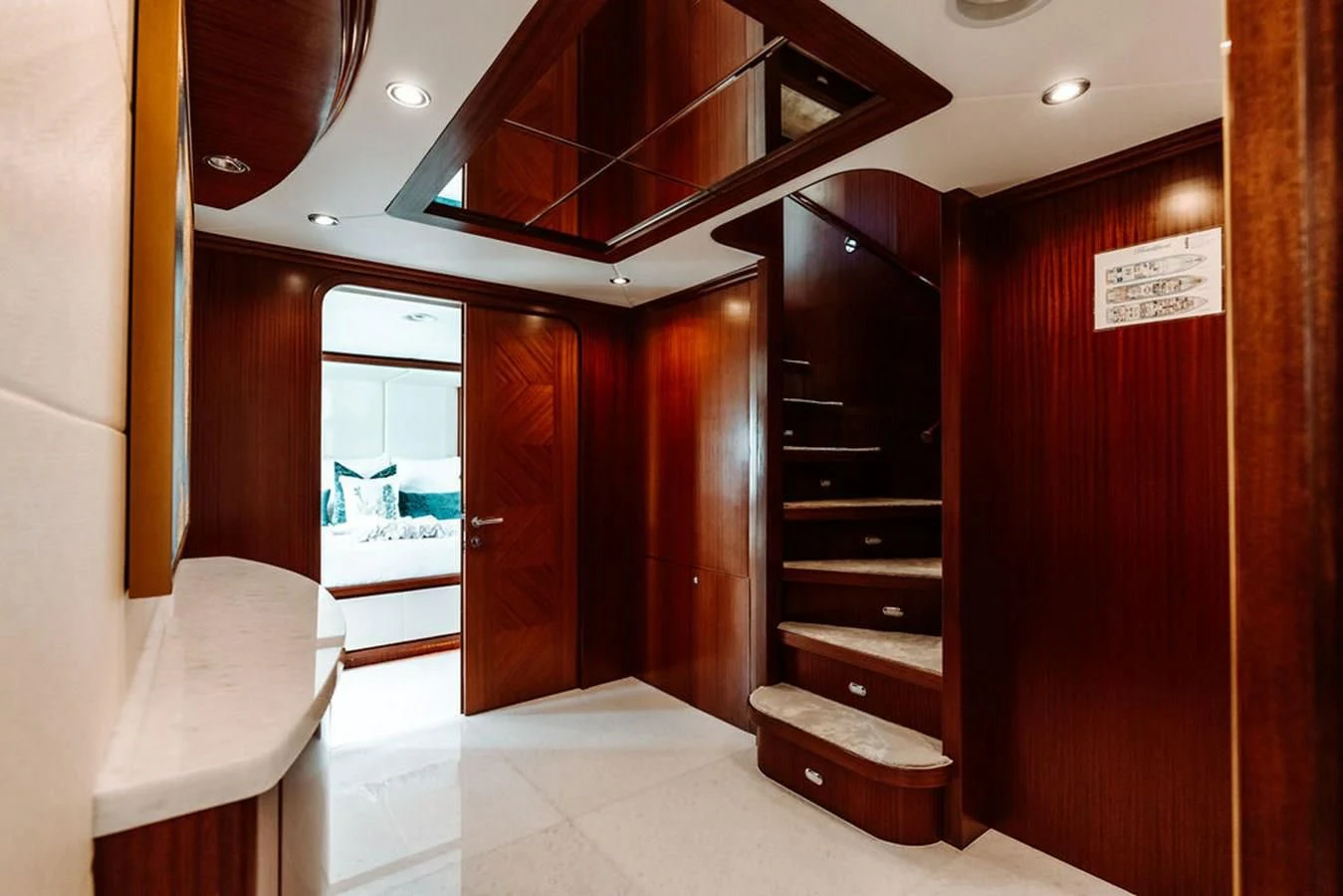 BEACHFRONT’s interior has a contemporary style and well-thought-out layout. She is easily adapted to any situation. She features a high-tech home theater with more than 500 HD movies and a music library of more than 70,000 songs. Airplay broadcast is available throughout the yacht with ability to play music through speakers almost anywhere. BEACHFRONT has five lavish staterooms, catering to up to 10 guests. Her full-beam master has double walk-in closest and a lounge. Four additional staterooms, including a VIP forward all have en-suite bathrooms. A guest common area is located forward.
