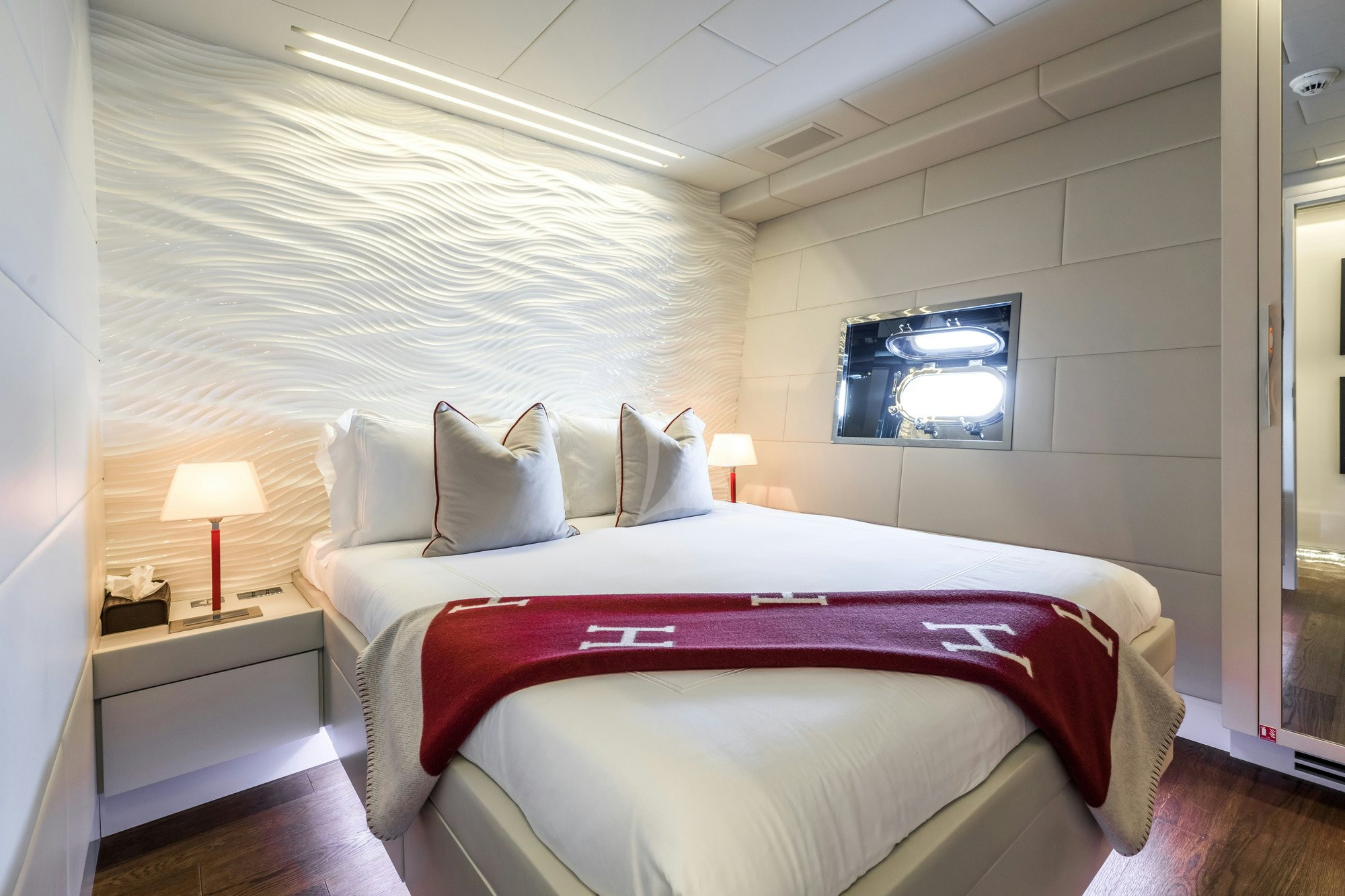 Four staterooms, including an owner’s suite, a VIP stateroom, one double stateroom and a twin stateroom with two Pullmans welcome up to 10 guests. The yacht’s staterooms are as well laid out and beautifully appointed as her other interior spaces. They, too, have neutral color palates with pops of color that create a Zen-like ambiance ideally suited for unwinding after a day on the water. The yacht is run by a crew of six.