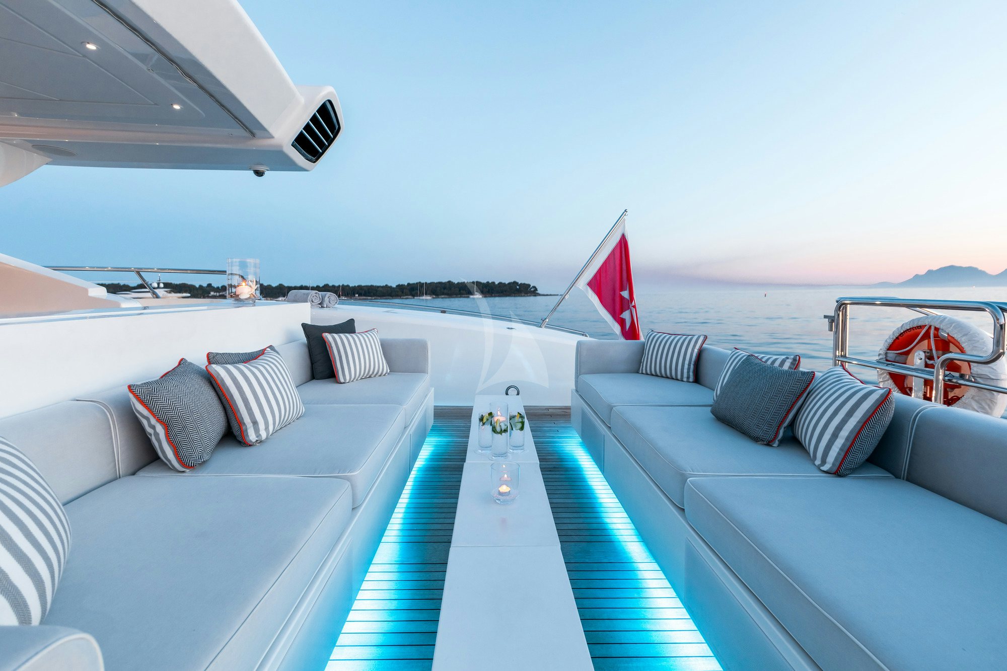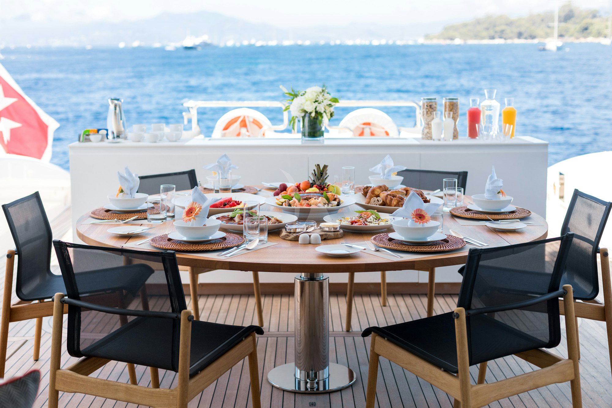 BEACHOUSE has a large swim platform where guests can access the water and use the water toys. The yacht has a variety of alfresco dining areas and sunpads where guests can enjoy the views and the sunshine.
