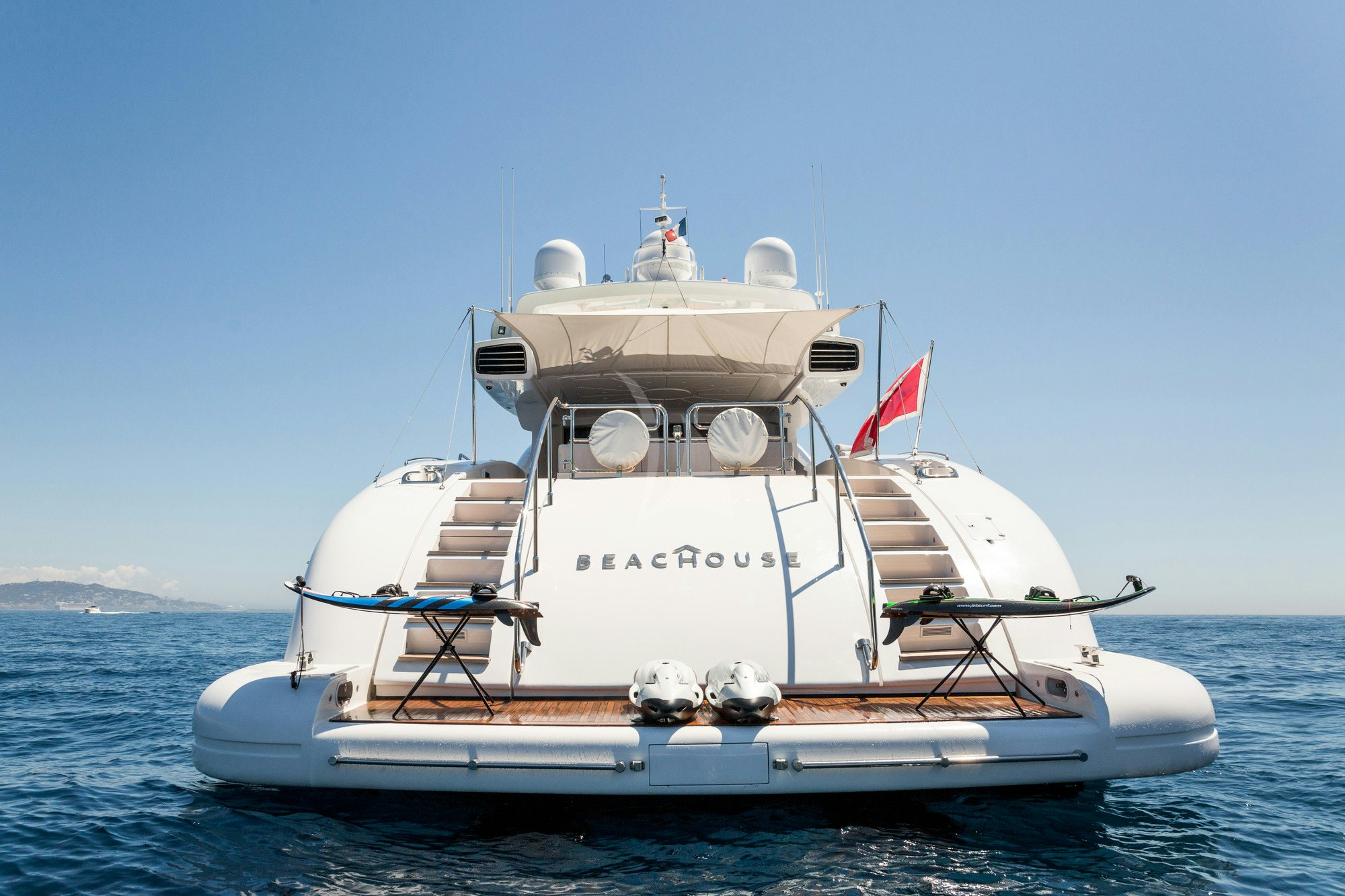 BEACHHOUSE is a planing motor yacht with a GRP hull and superstructure. Her two decks are laden in teak. The yacht has a 26-foot (7.8m) beam and a shallow five-foot (1.6m) draft, which allows her to visit low-laying bays, islands and islets that many other yachts are not able to cruise. The impressive 41-knot maximum speed of BEACHHOUSE is courtesy of two MTU diesel engines that provide her with 9,220 horsepower. The yacht has a quick cruising speed of 32 knots and a nautical-mile range of 530 when cruising at 34 knots.