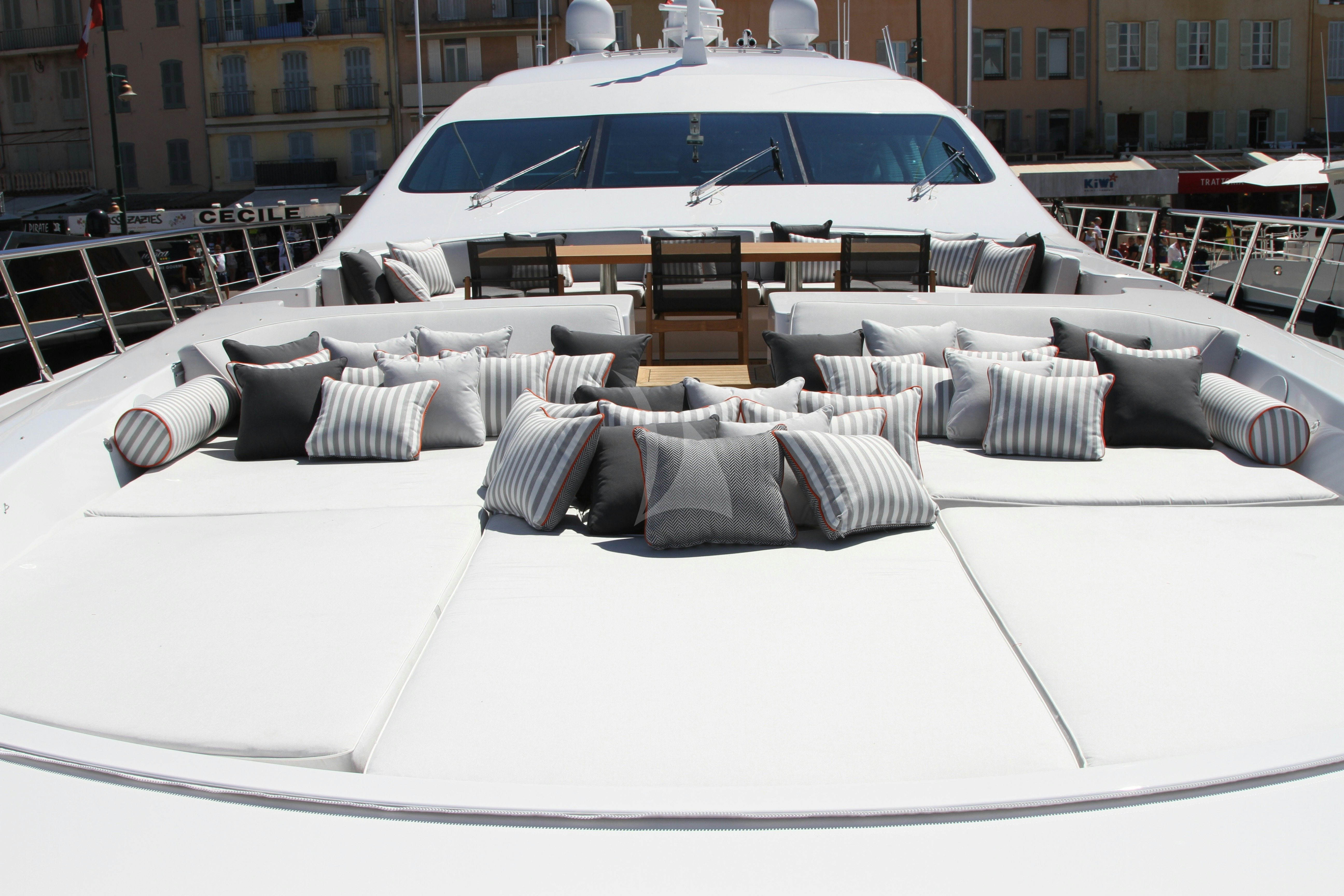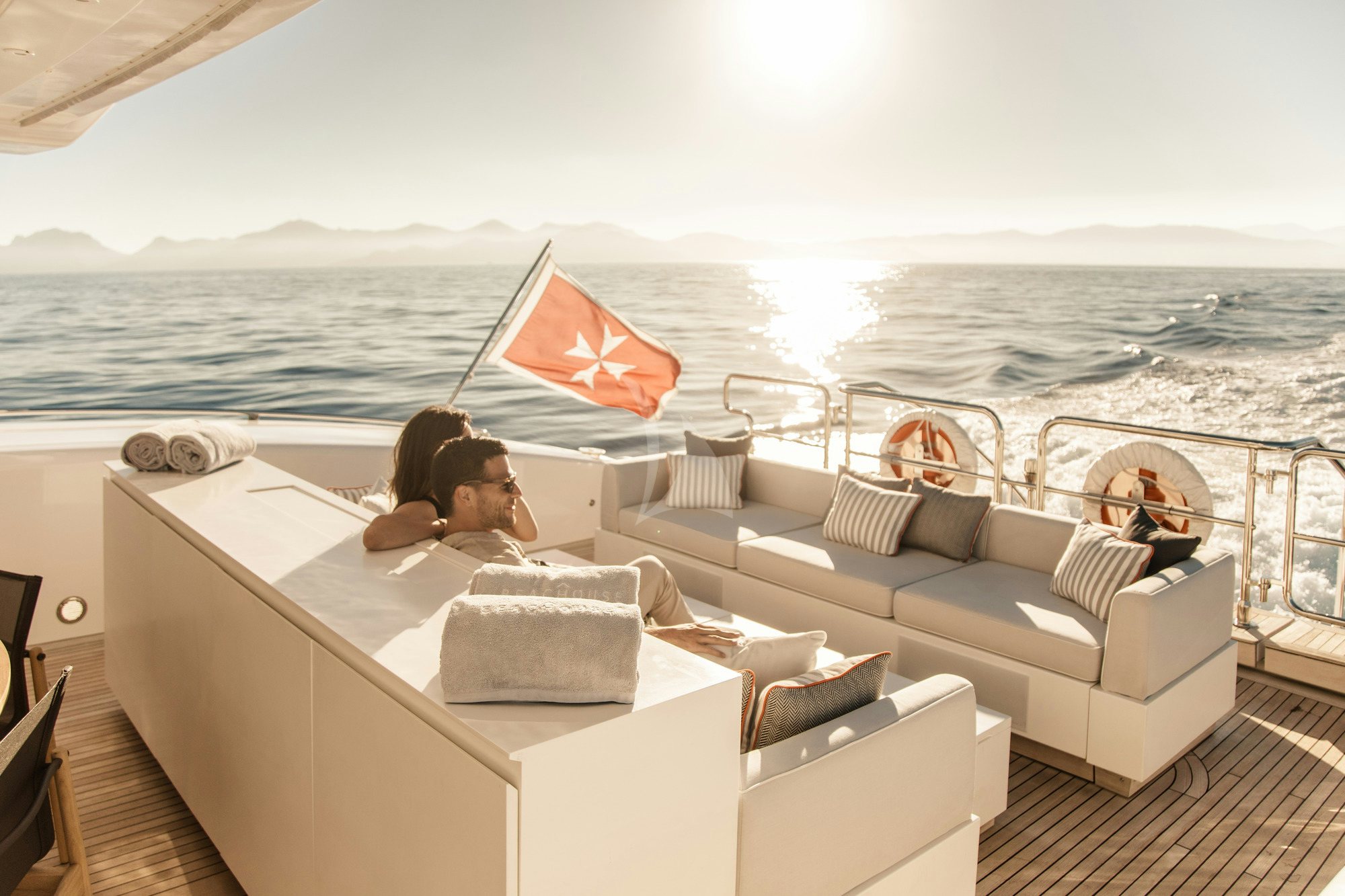 The yacht’s main deck is spacious and well laid out. A neutral color palette provides a comfortable and welcoming atmosphere as sumptuous, chic furnishings and accompaniments create an air of elegance throughout. The main salon has a large, L-shaped sofa where guests can relax and spend quality time together. The formal dining table forward sits under a retractable roof that allows the space to become an indoor/outdoor dining experience.