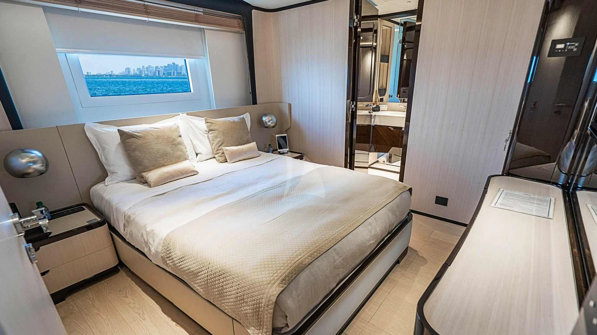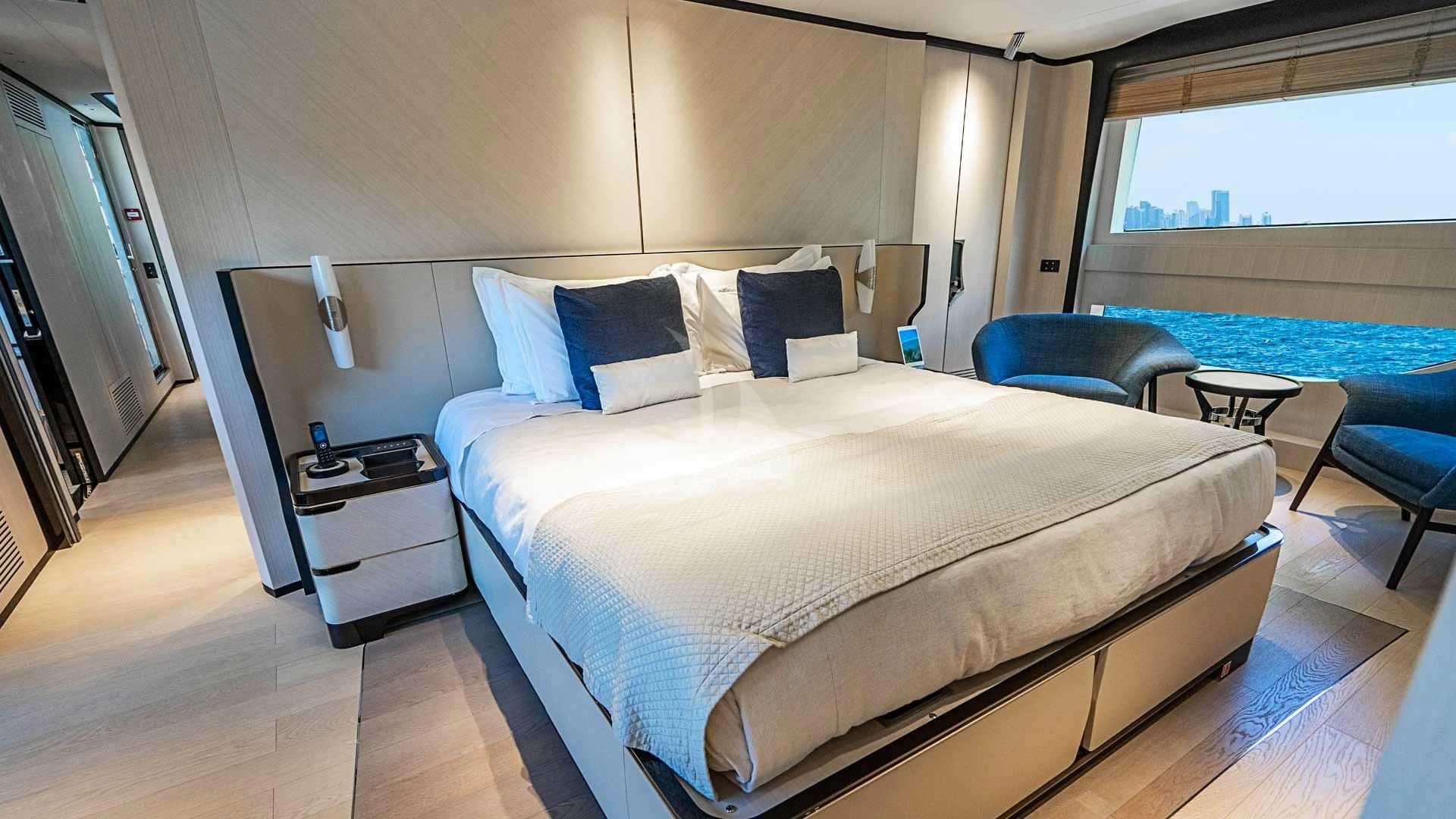 BELLA VITA offers luxurious accommodations for up to 10 guests in five cabins. The full-beam master cabin on the main deck is a haven of modern elegance, featuring oversized windows, a sitting area and a spacious ensuite bathroom with his-and-hers facilities. All guest cabins are equally spacious, offering ample storage and ensuite bathrooms with showers. Every stateroom aboard provides a comfortable and stylish retreat.