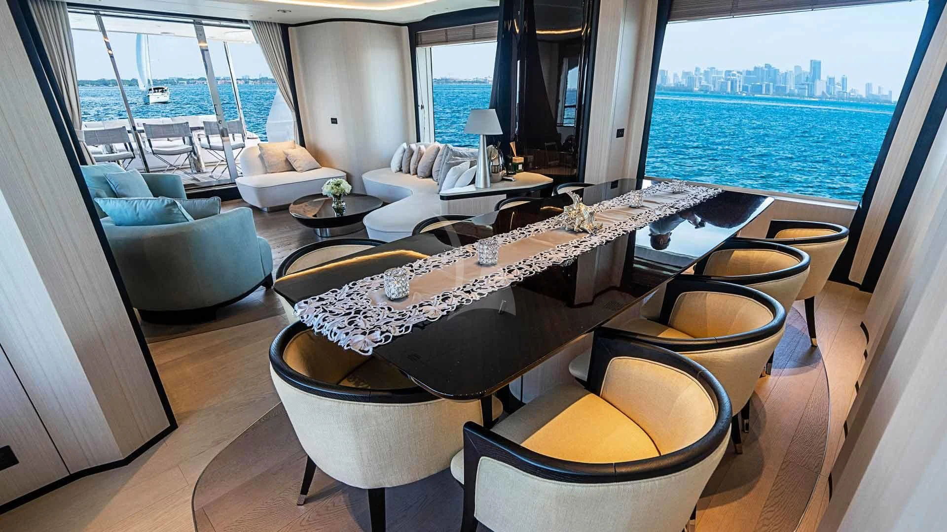Stepping foot onboard BELLA VITA is a breathtaking experience. The yacht's full-length windows flood the interior with natural light, creating an airy and welcoming atmosphere. The elegant chromatic finishings and alternating light and dark oak parquet flooring enhance the yacht's modern feel. Soft shades of pink, green and light blue accentuate the interior, evoking a sense of tranquility and relaxation.