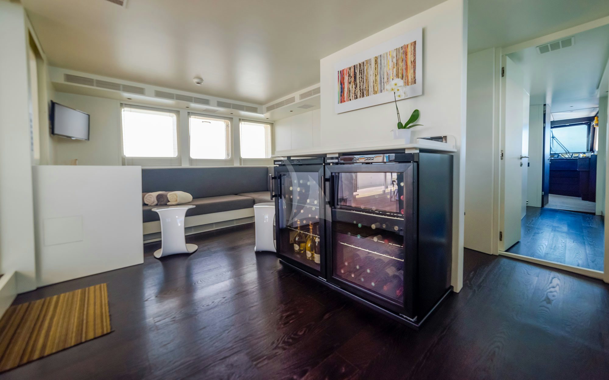 The interior spaces of BERZINC are minimalist and modern, yet still comfortable and welcoming. The yacht’s main deck is home to her full-beam main salon with stylish furnishings and beautiful amenities and details. Forward of the salon is the formal interior dining table where guests can enjoy meals provided by the yacht’s five-star chef. The yacht’s upper deck also has a well-styled skylounge, which is the perfect place to relax and unwind after a fun-filled day on the water.