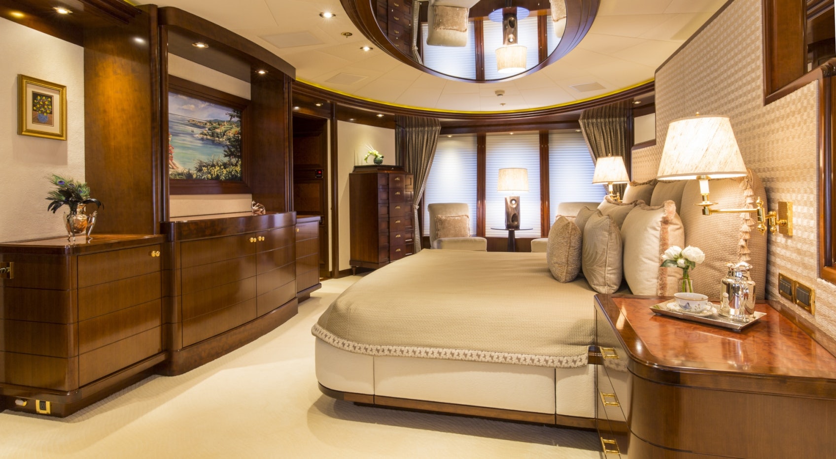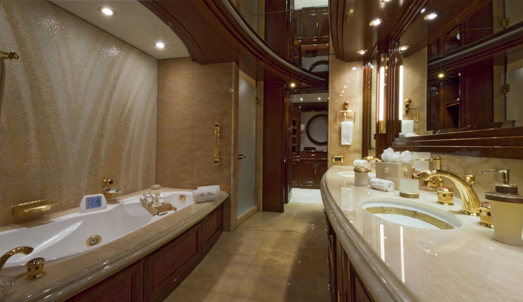 In addition to a full-beam on-deck master suite, with office and guest room/gym, motor yacht BLUE MOON features five comfortable lower-deck staterooms. The two twin cabins connect with two queens to form suites. Each has a private bathroom, individual temperature controls, individual satellite receivers and connects to a full library of movies and DVDs through the Kaleidescape entertainment system. BLUE MOON charters give guests access to iPod stations, and WiFi is available throughout the yacht.