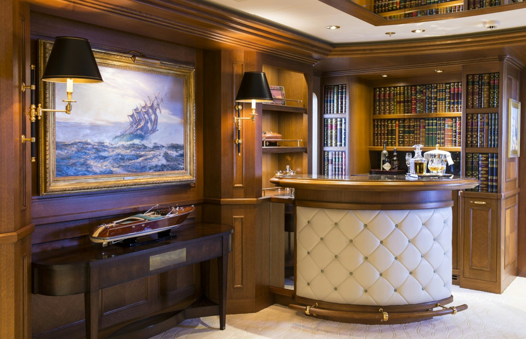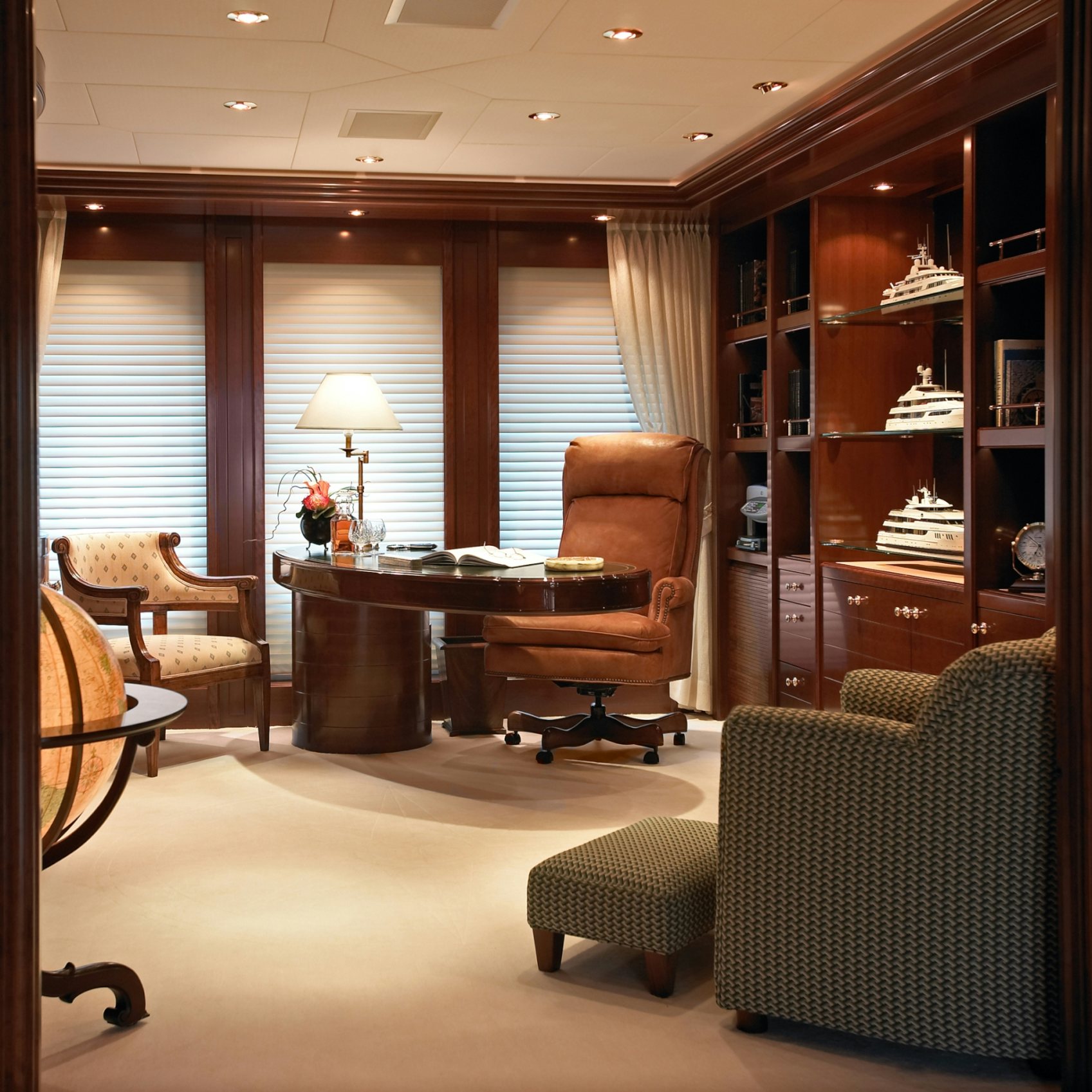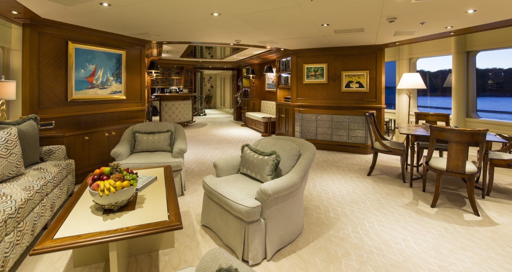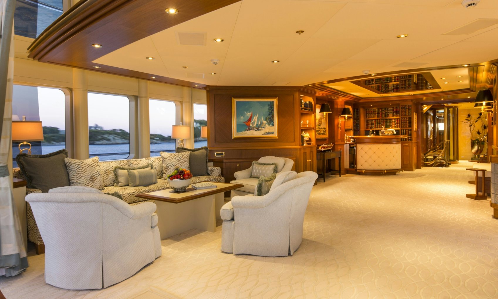 For the ultimate in relaxation, the sun deck features a Jacuzzi surrounded by sun pads. If you’ve had enough sun, stunning glass elevator, which goes from lower deck to sun deck, leads to a panoramic nook, insulated from the elements, but perfect for quiet observation and reading. The classic interior decor of motor yacht BLUE MOON is comfortably luxurious. The central staircase with spectacular wrought iron banister and wood veneer — recalling an ocean motif — wraps around the glass elevator.