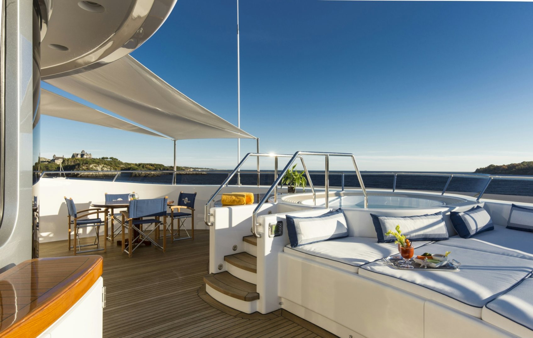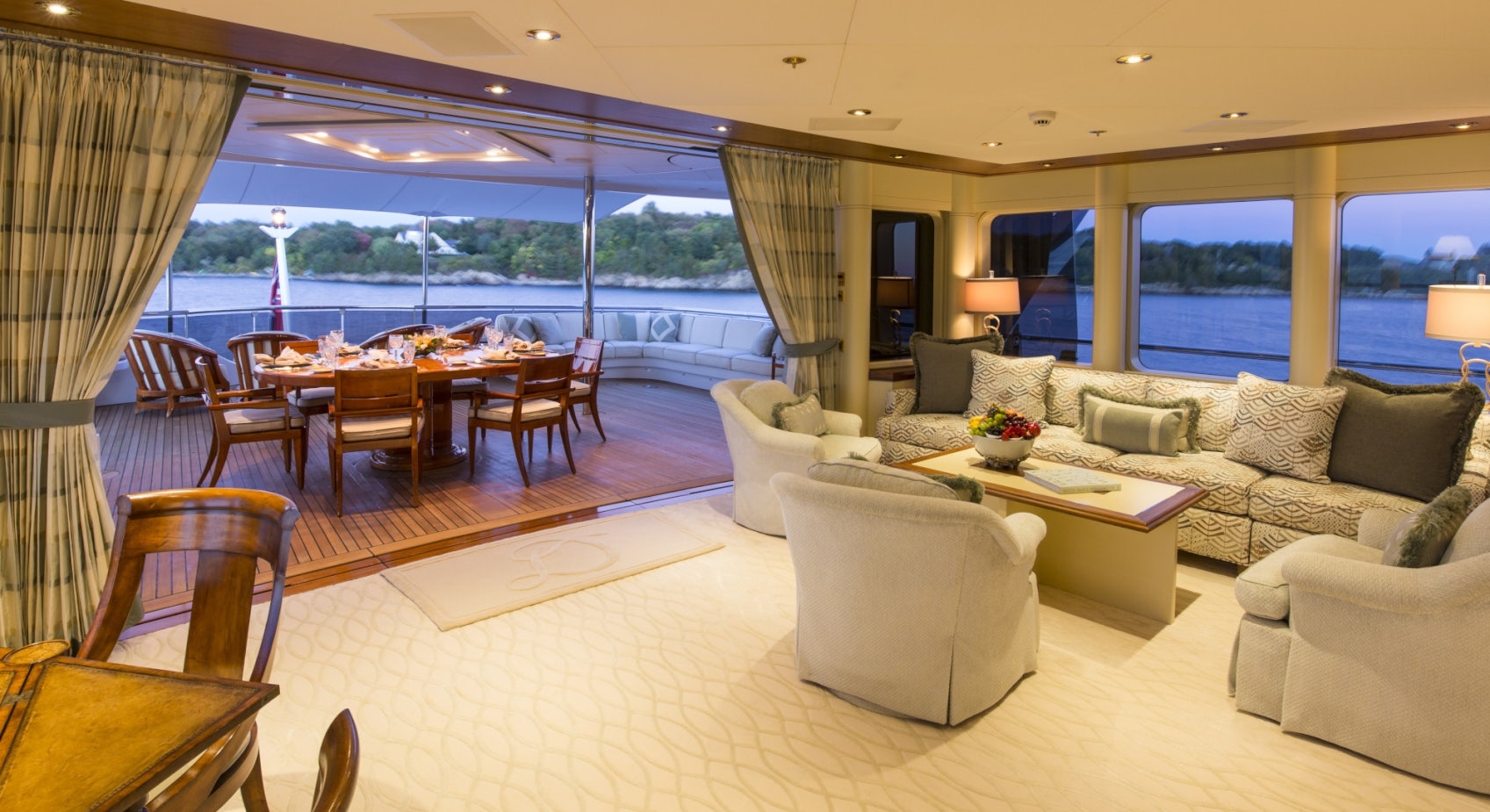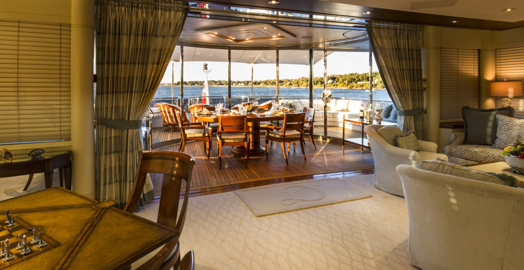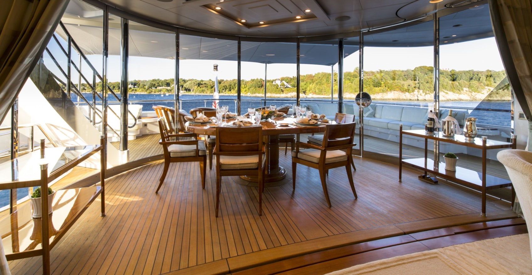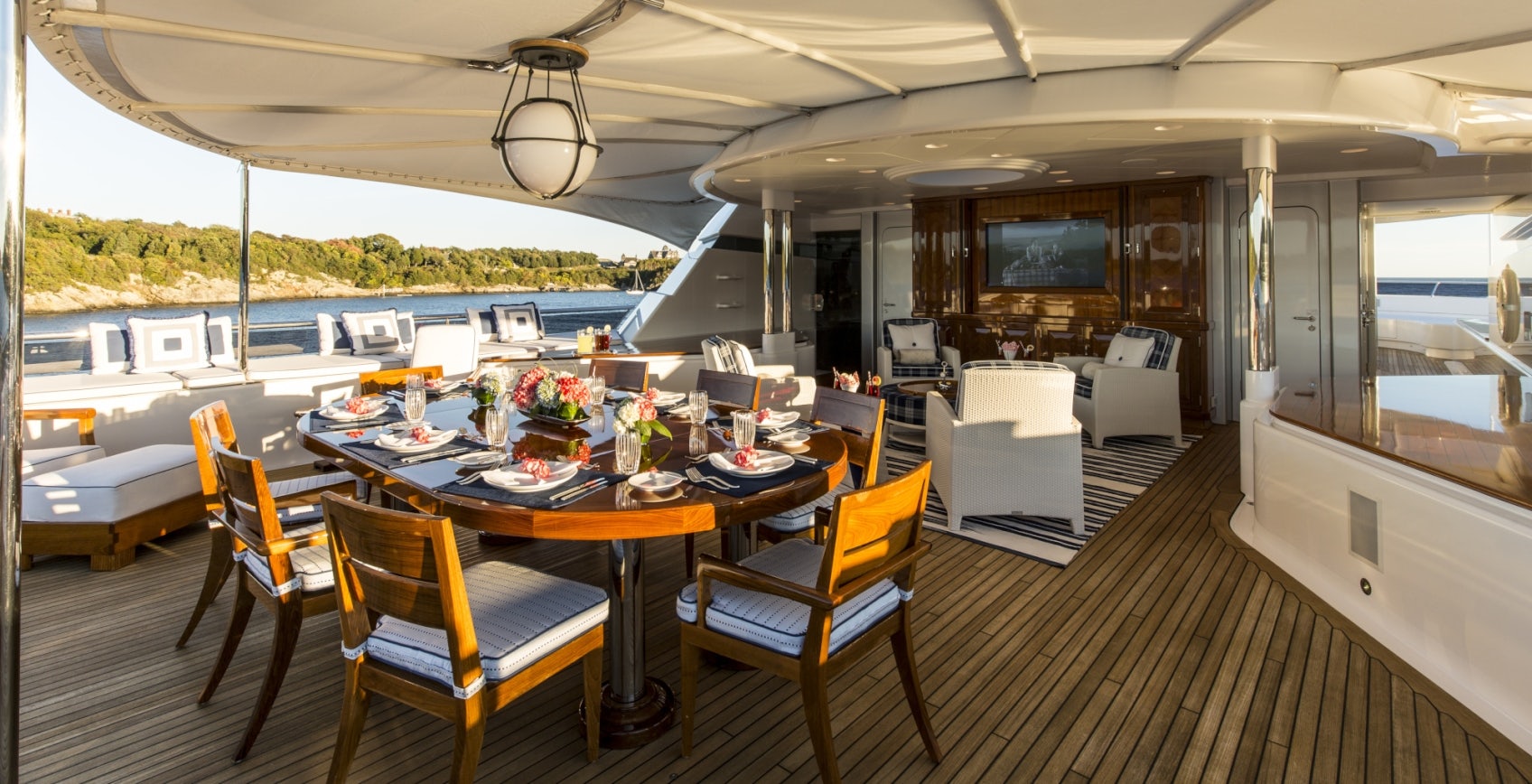 M/Y BLUE MOON has several dining areas, formal dining on the main deck and a panoramic dining area on the bridge deck, are available for use. Floor-to-ceiling glass panels disappear, leaving no tracks on the teak, to open the dining area to the aft deck. Sheltered by the top deck overhang, this is a great spot for breakfast, lunch or dinner during BLUE MOON charters. The dining area aft of the sun deck is equipped with wet bar, refrigerator and grill.