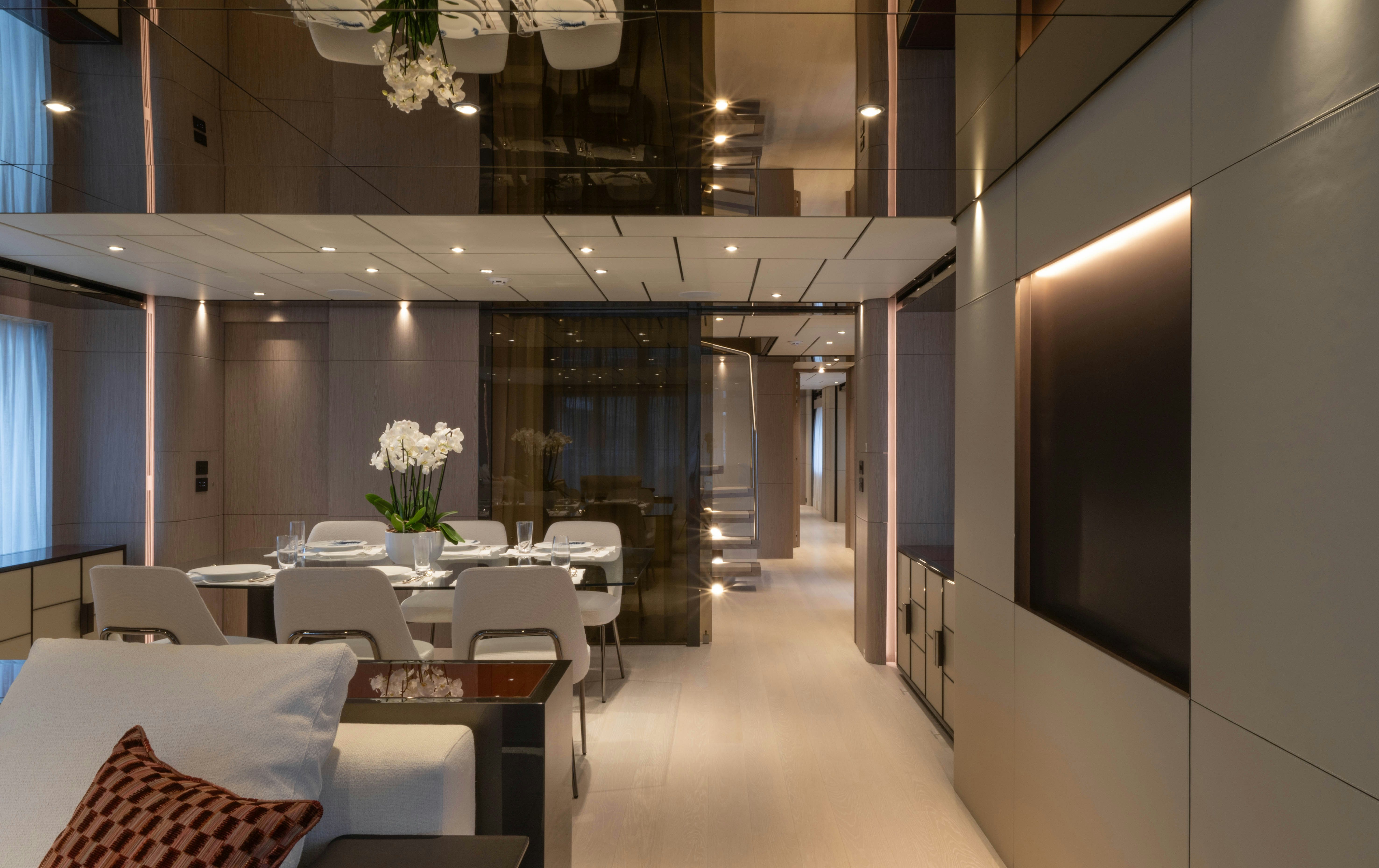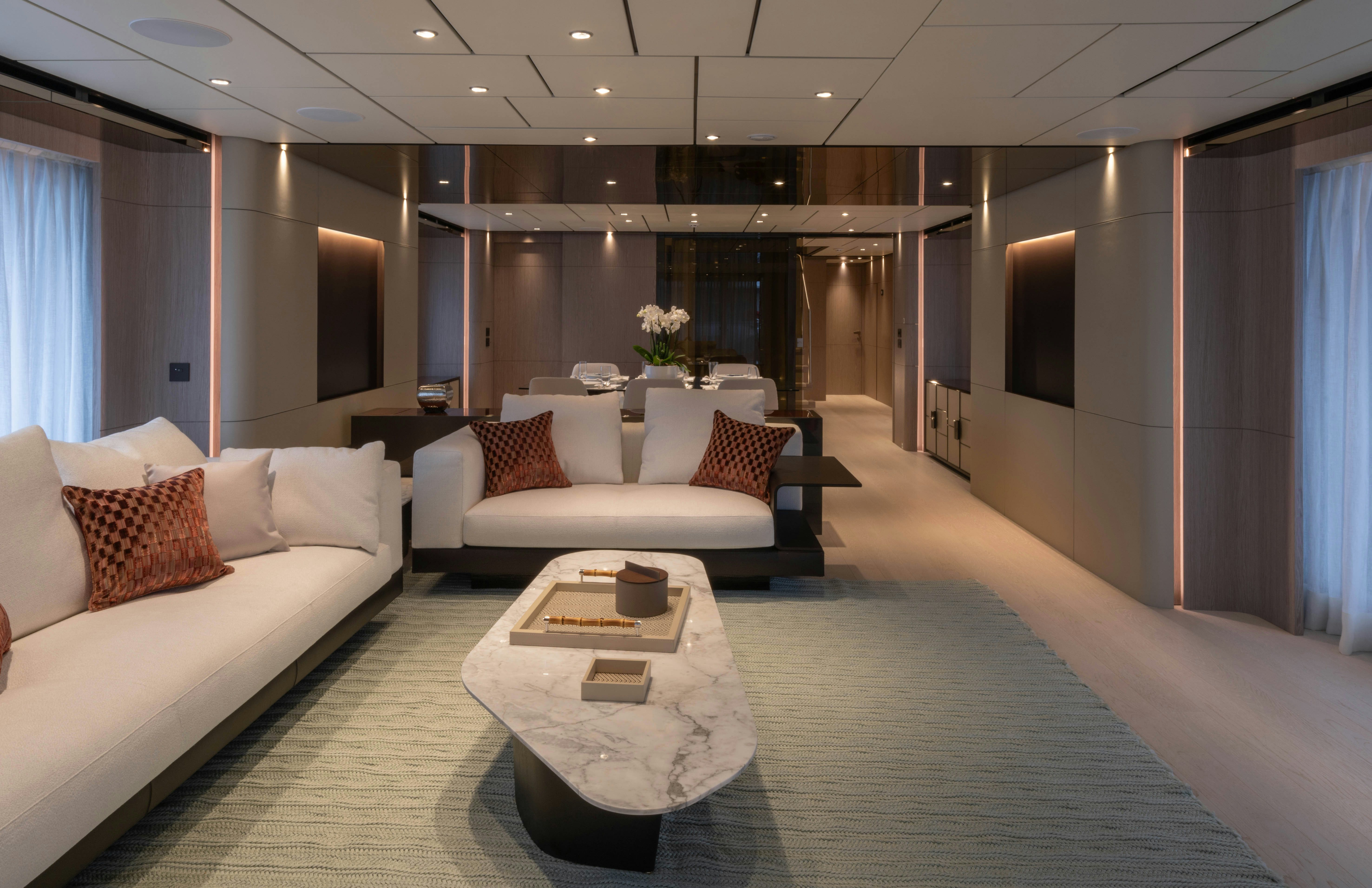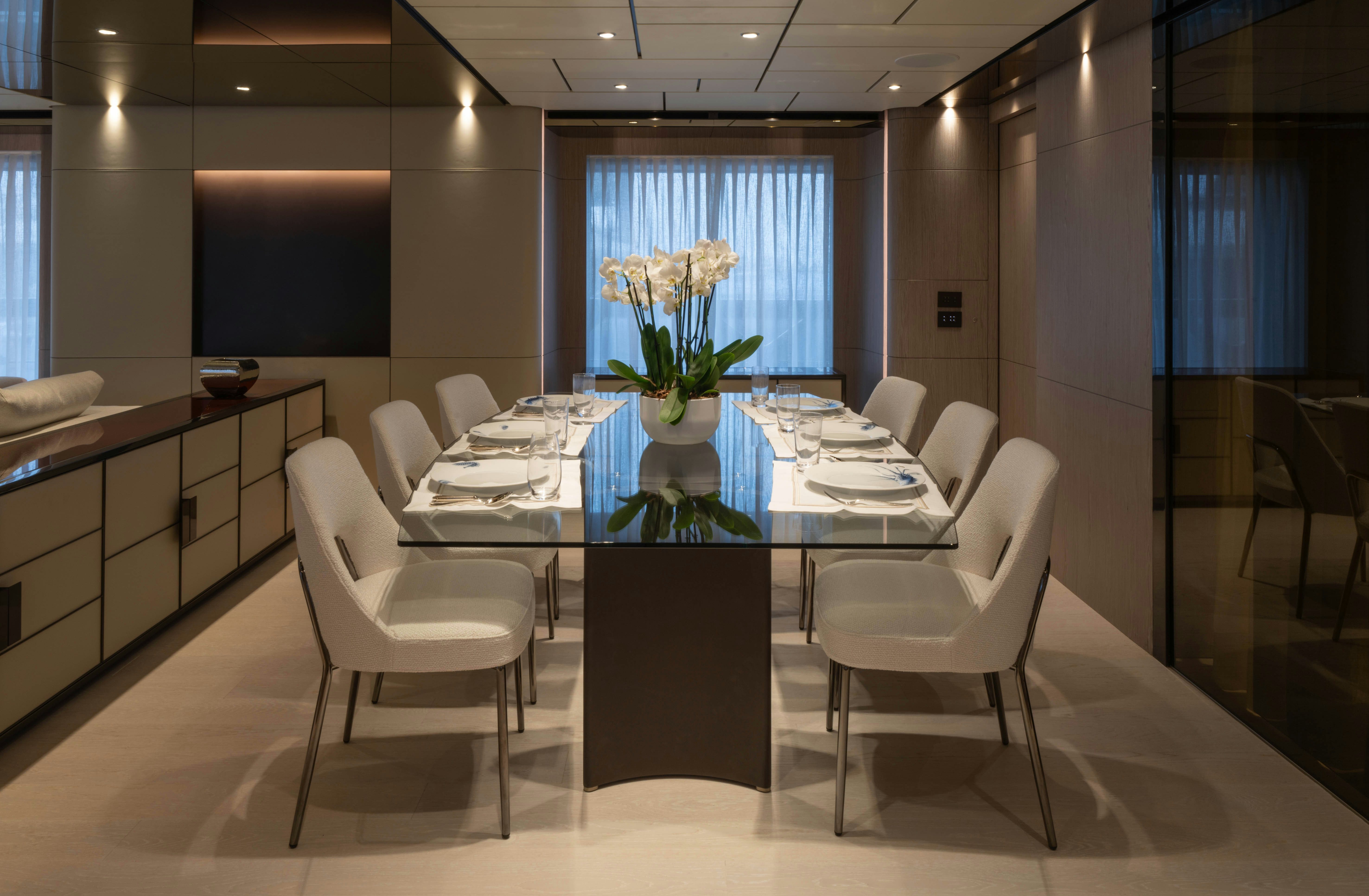 Guests are welcomed aboard via the main deck aft lounge. Through automatic sliding glass doors, the main salon reveals a soft, contemporary design with a mix of sofas, lounge chairs, and a central coffee table, all surrounded by floor-to-ceiling windows. A formal dining area for 10 sits just forward, offering a warm, convivial setting for evening meals or celebratory occasions.