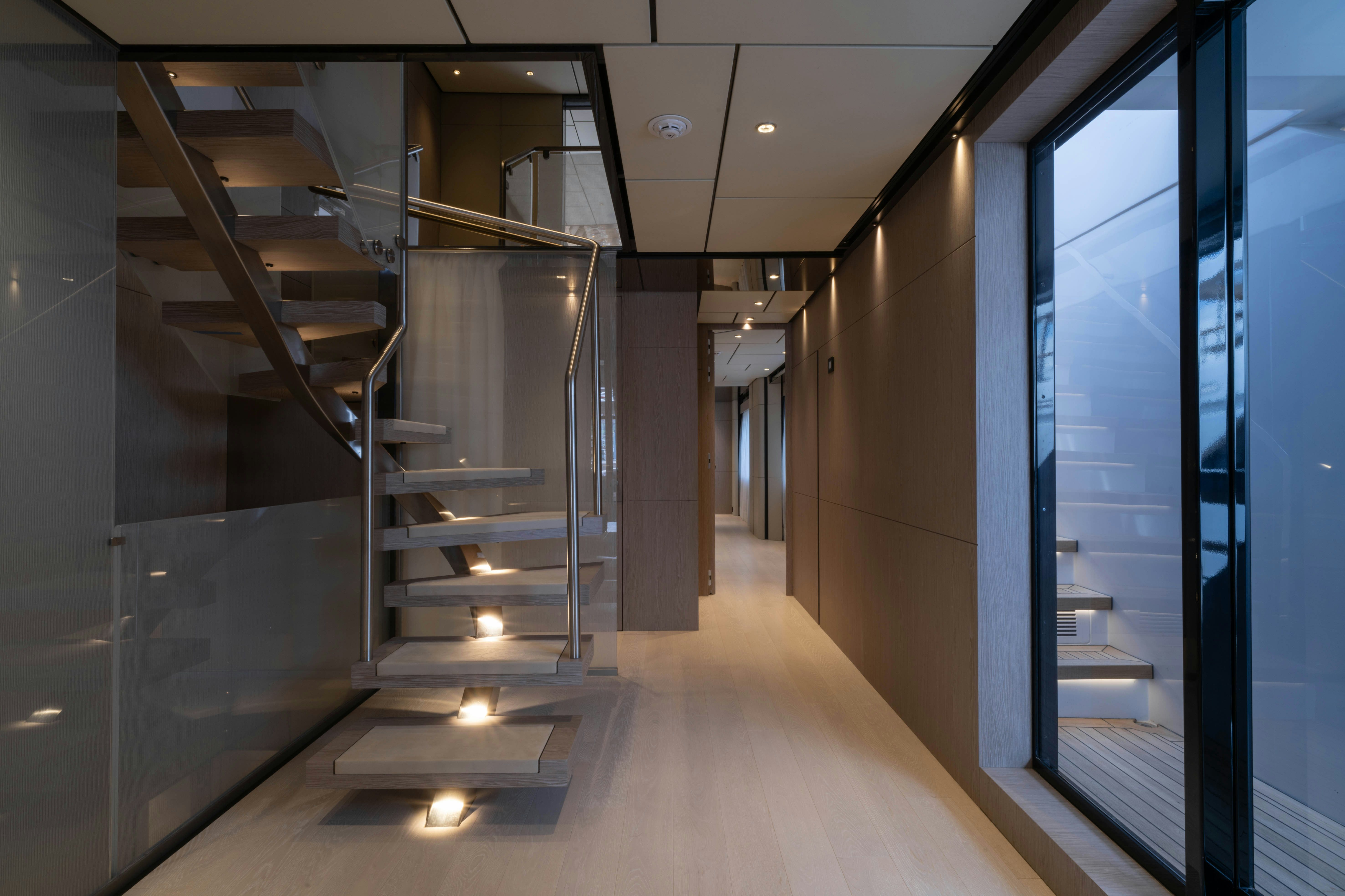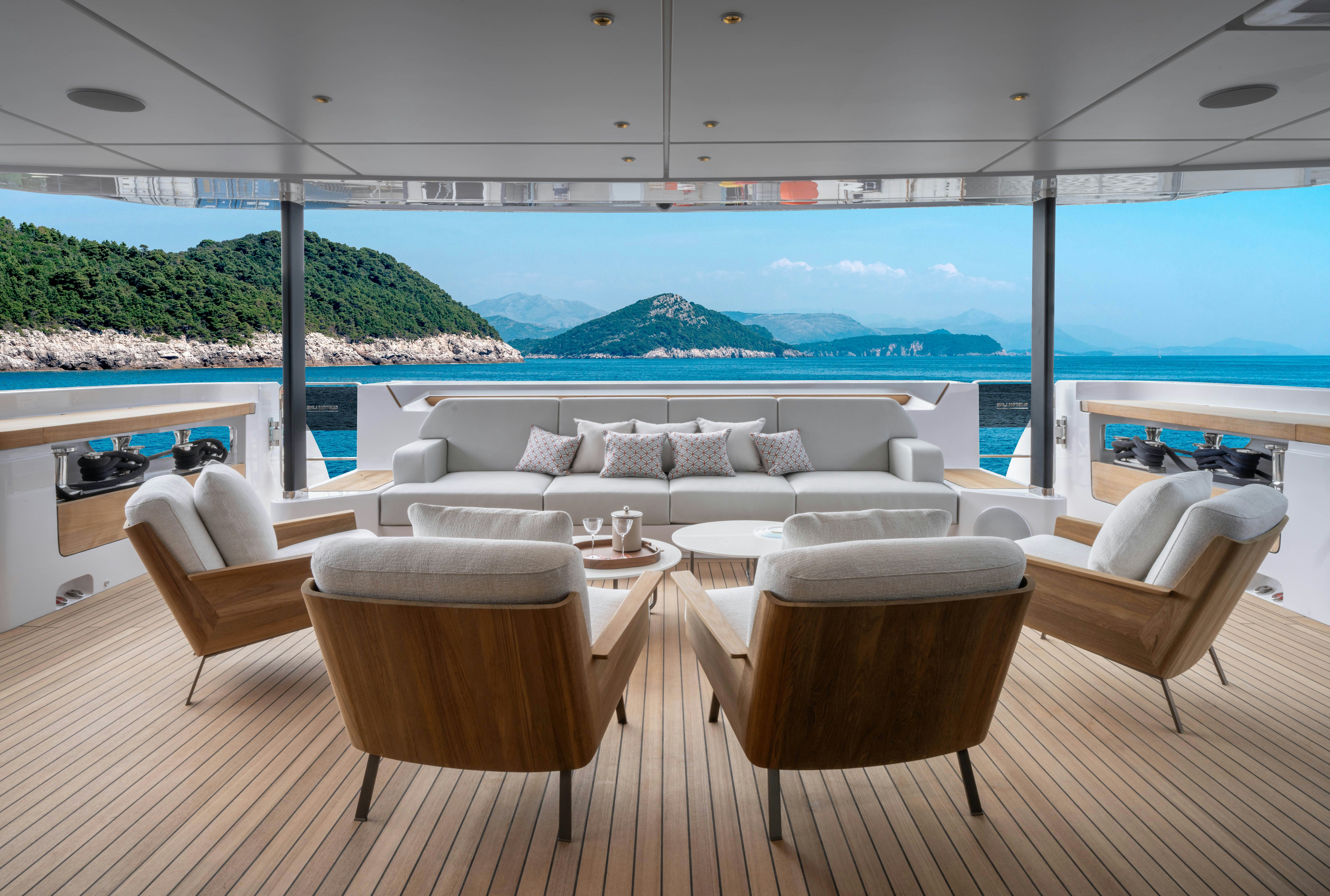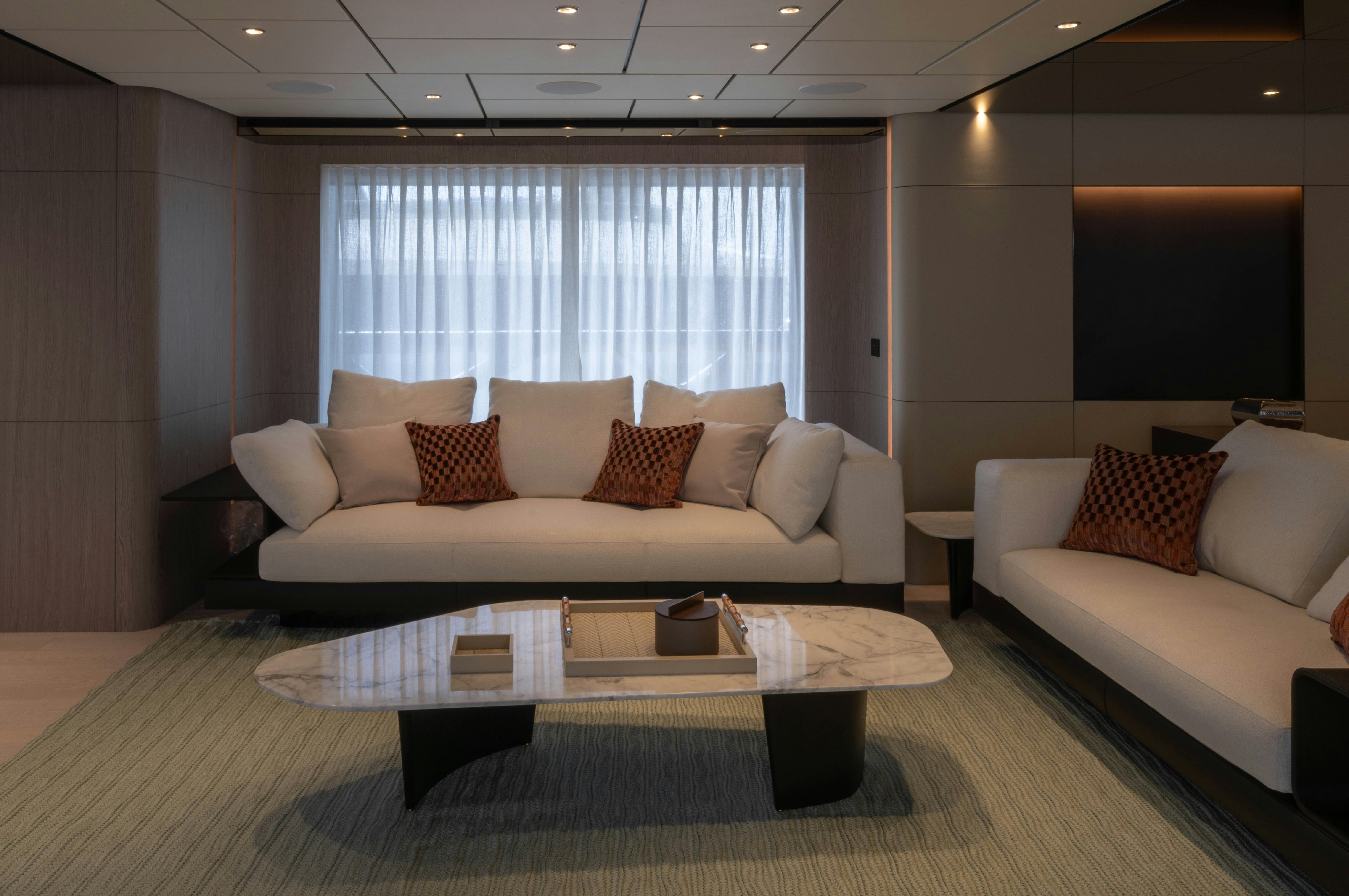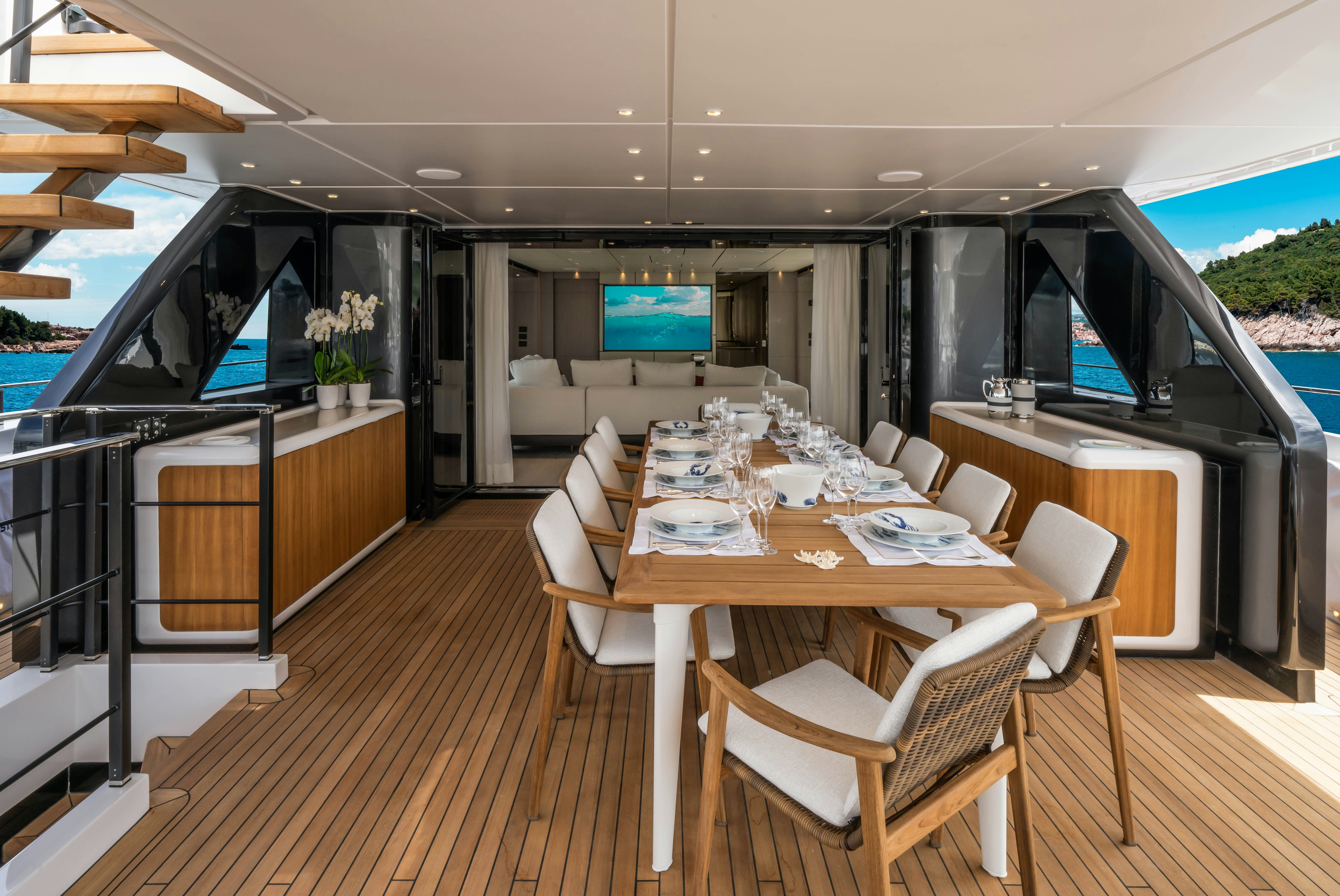 Guests are welcomed aboard via the main deck aft lounge. Through automatic sliding glass doors, the main salon reveals a soft, contemporary design with a mix of sofas, lounge chairs, and a central coffee table, all surrounded by floor-to-ceiling windows. A formal dining area for 10 sits just forward, offering a warm, convivial setting for evening meals or celebratory occasions.