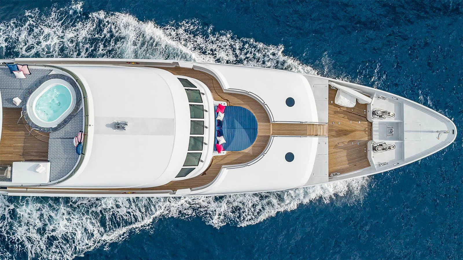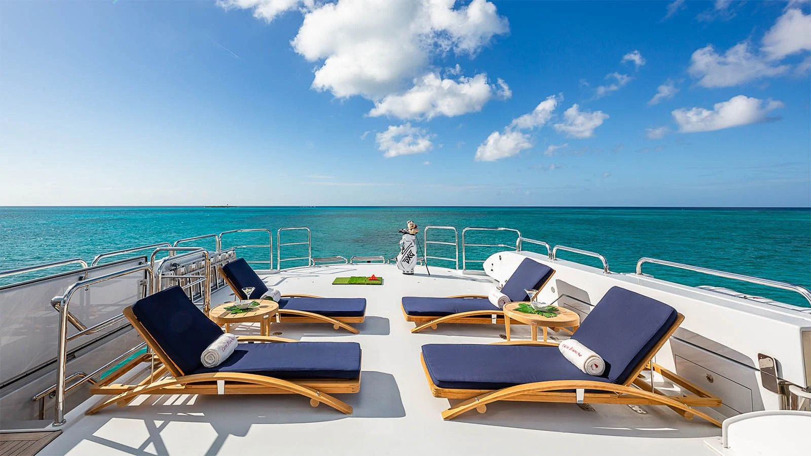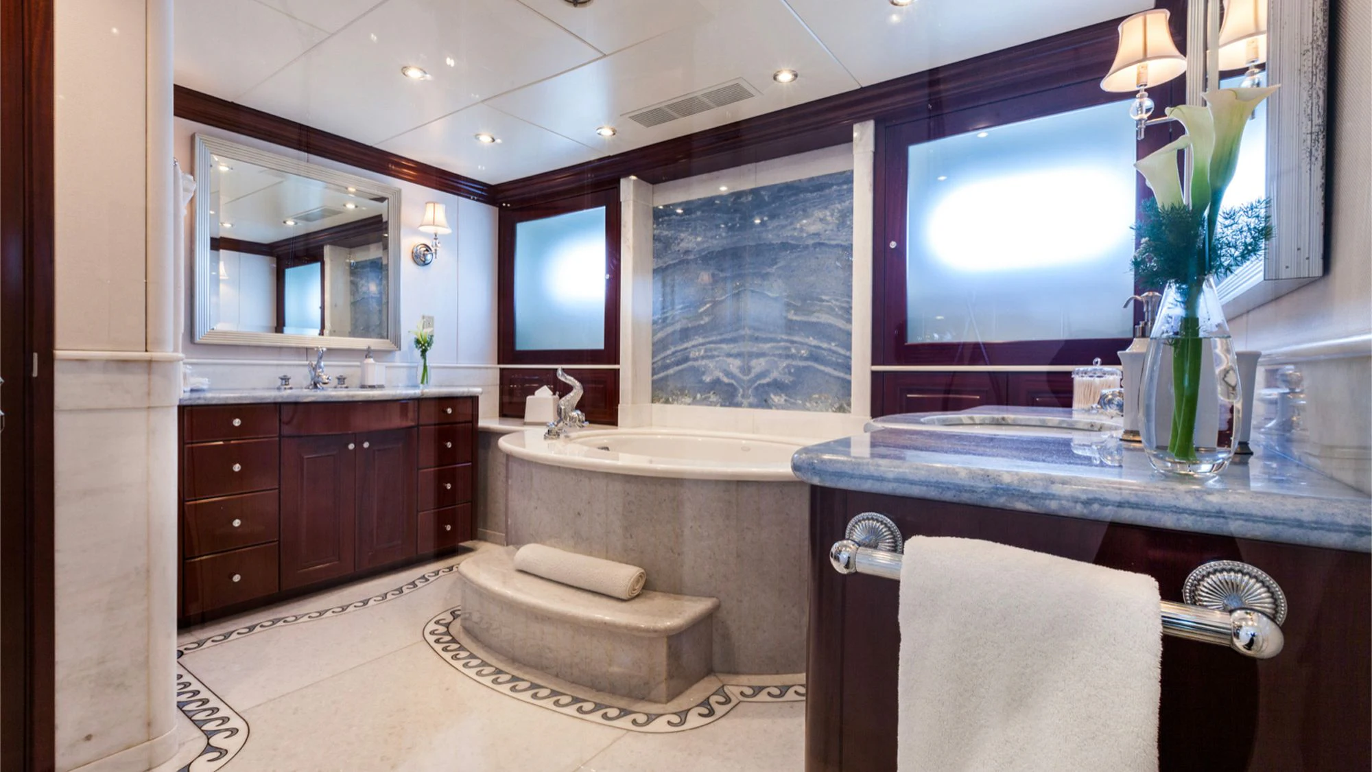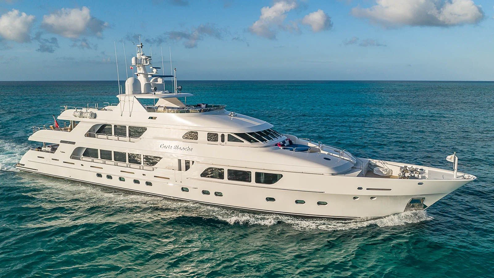 CARTE BLANCHE welcomes 12 guests and has an experienced crew to ensure that every guest has the best holiday imaginable. The superyacht features six beautifully appointed staterooms, including an on-deck master suite. The master is a retreat featuring large windows, a plush king bed, private office, two large walk-in closets and his-and-hers en-suite baths with a solid marble Jacuzzi tub on her side and a shower on his. CARTE BLANCHE’s lower deck VIP is as impressive as the master with its full-beam width and marble tub and shower. The additional staterooms aboard include two double-bed stateroom and two twin staterooms with Pullmans — each stateroom is complete with an en-suite bathroom.