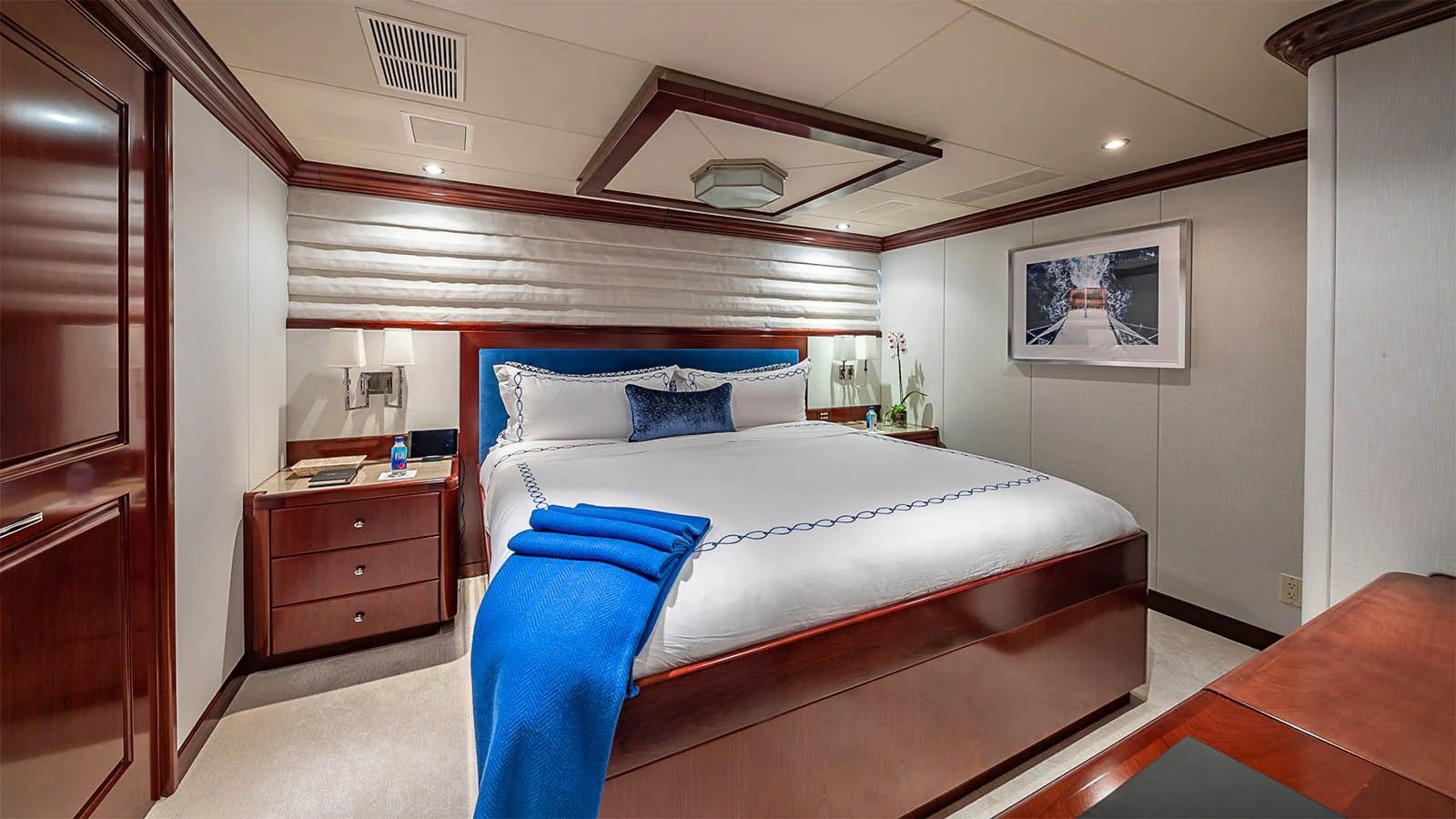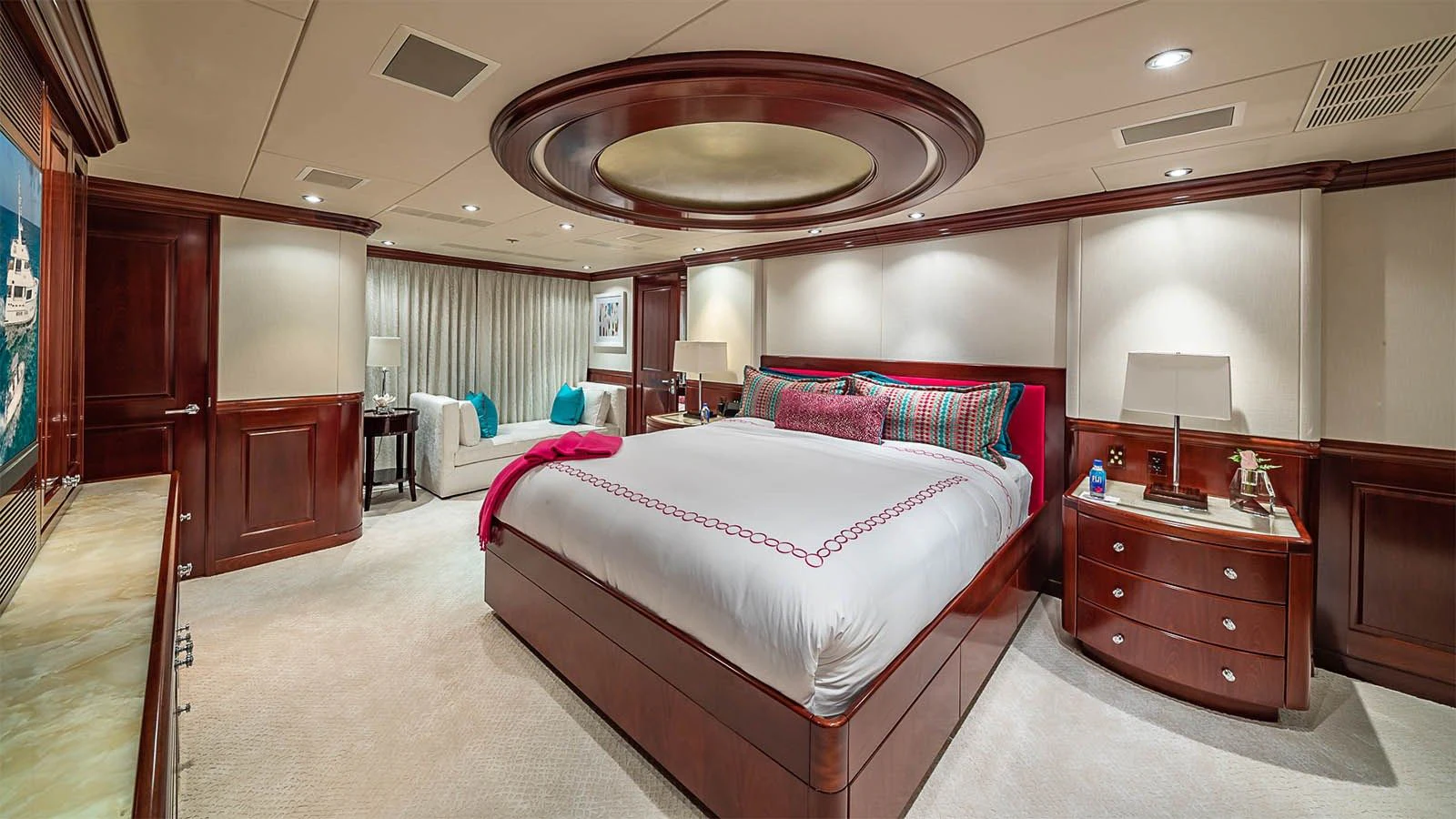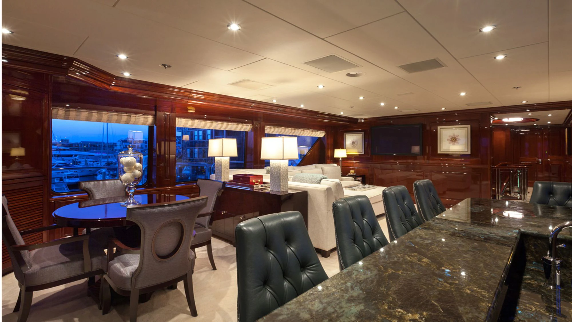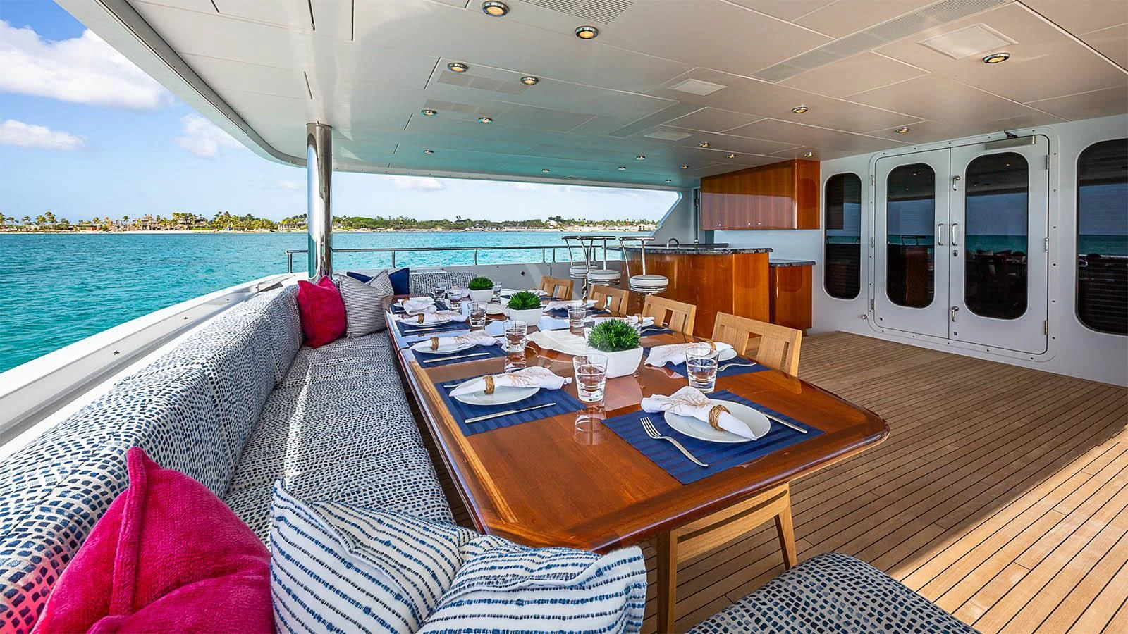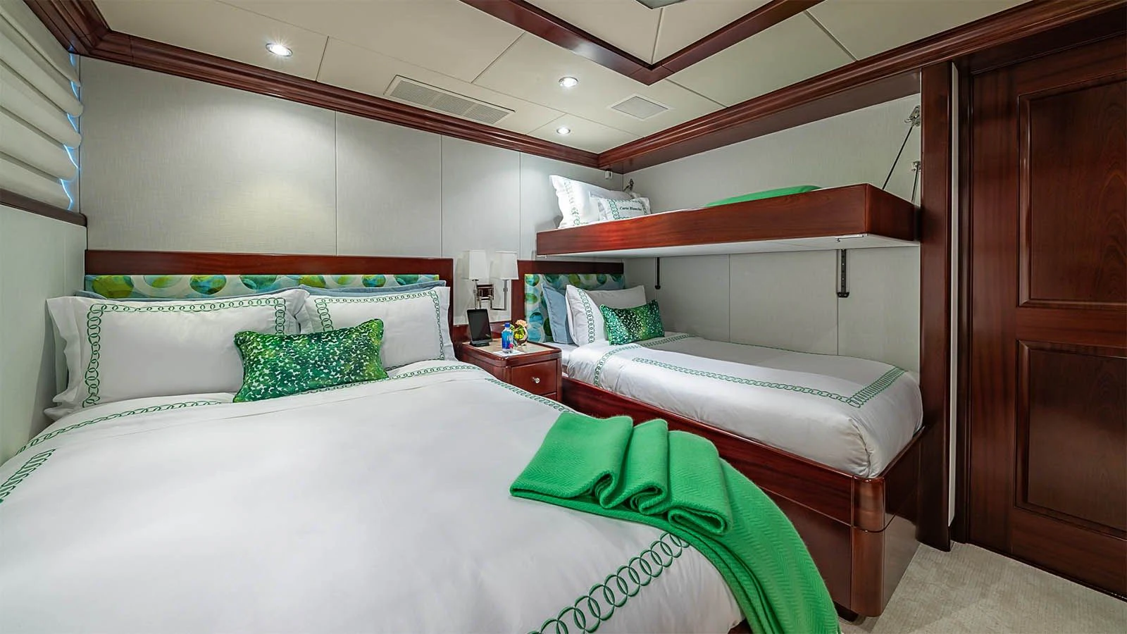 CARTE BLANCHE welcomes 12 guests and has an experienced crew to ensure that every guest has the best holiday imaginable. The superyacht features six beautifully appointed staterooms, including an on-deck master suite. The master is a retreat featuring large windows, a plush king bed, private office, two large walk-in closets and his-and-hers en-suite baths with a solid marble Jacuzzi tub on her side and a shower on his. CARTE BLANCHE’s lower deck VIP is as impressive as the master with its full-beam width and marble tub and shower. The additional staterooms aboard include two double-bed stateroom and two twin staterooms with Pullmans — each stateroom is complete with an en-suite bathroom.