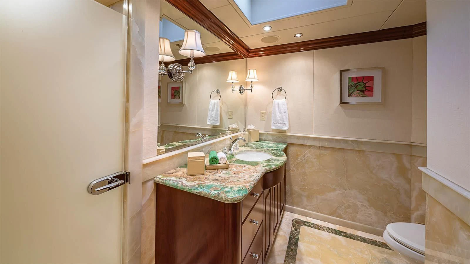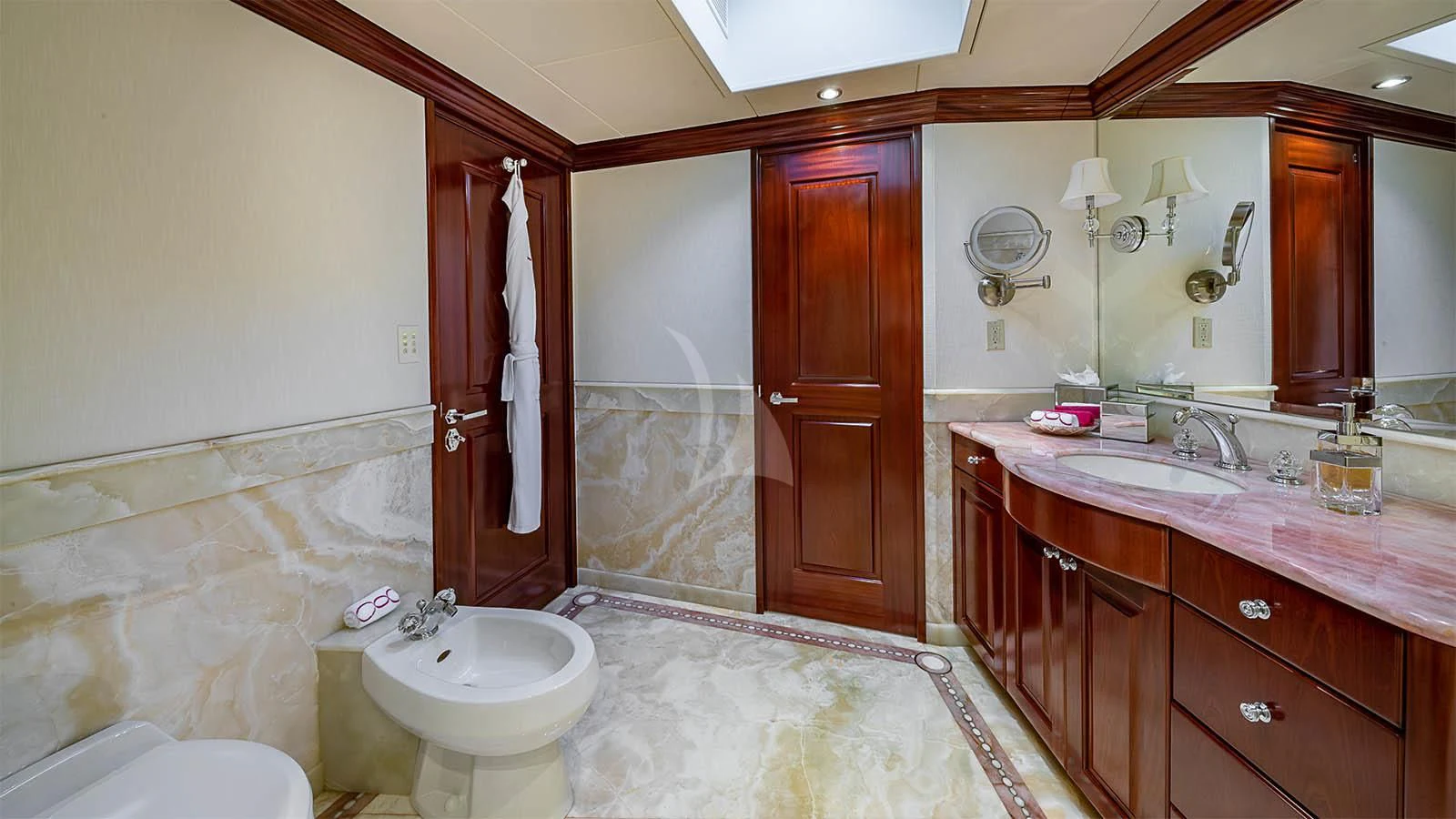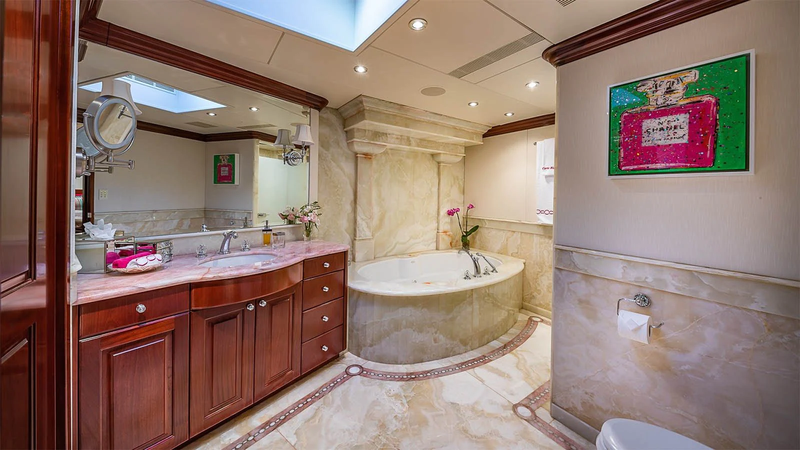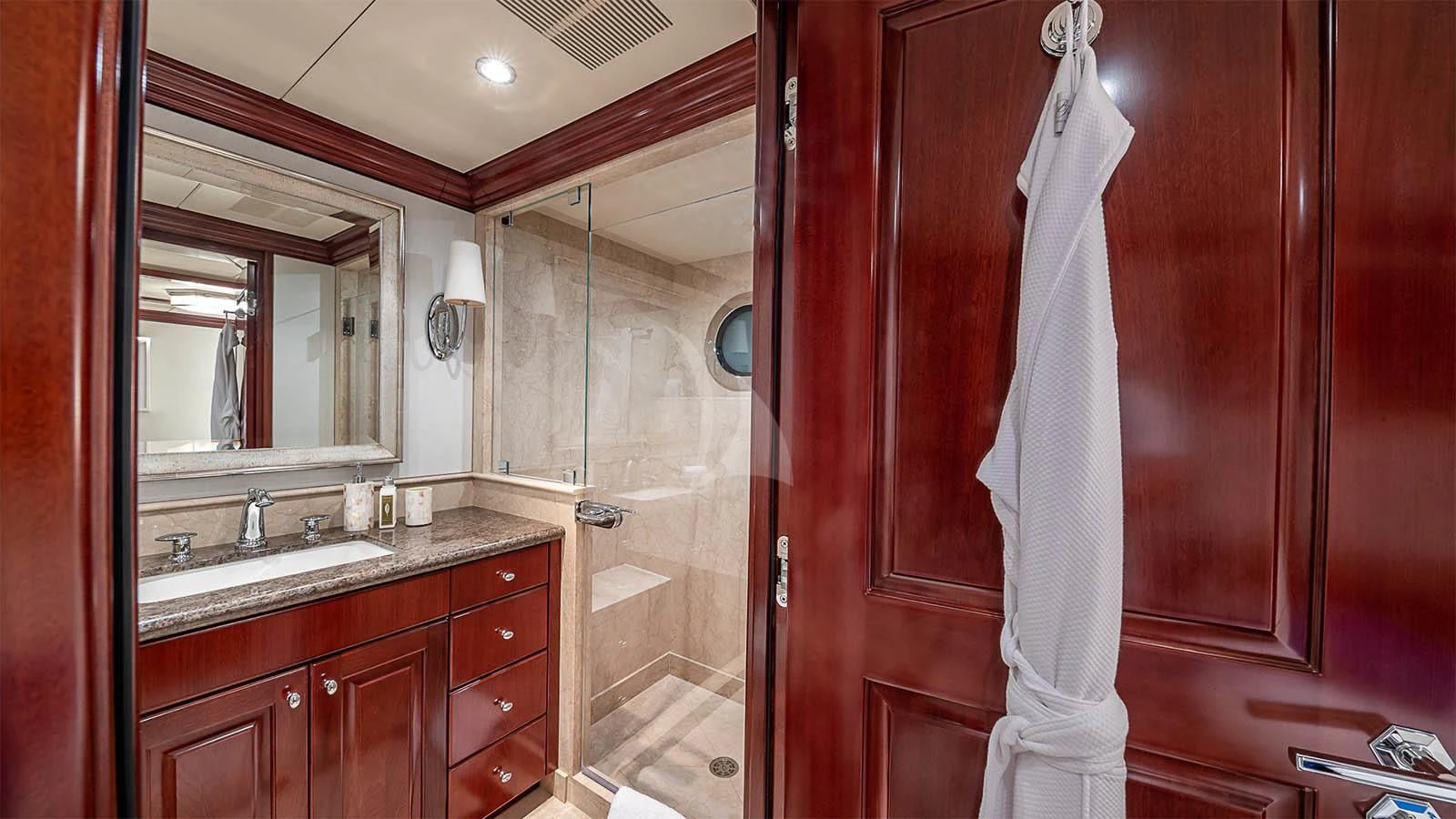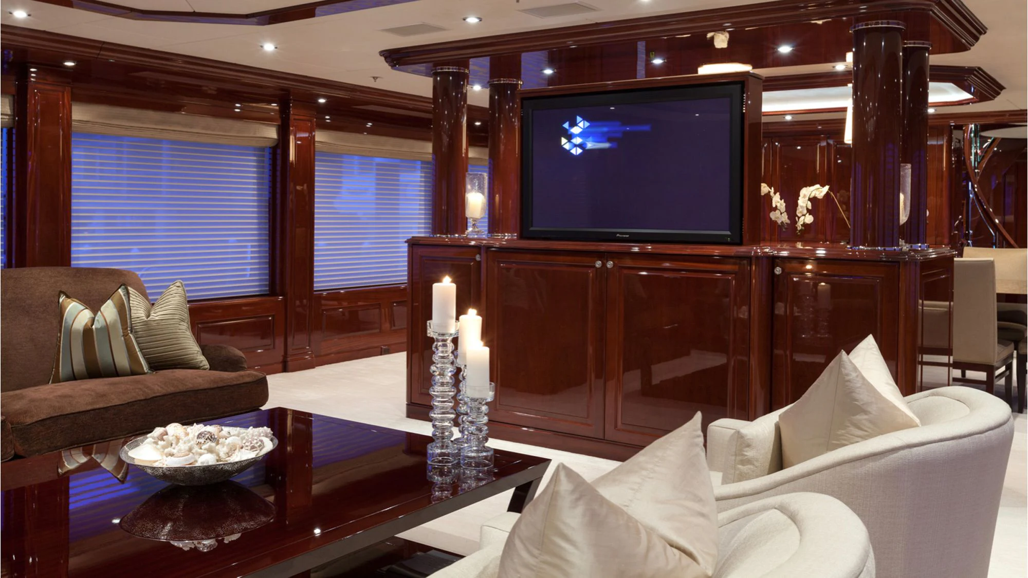 CARTE BLANCHE welcomes 12 guests and has an experienced crew to ensure that every guest has the best holiday imaginable. The superyacht features six beautifully appointed staterooms, including an on-deck master suite. The master is a retreat featuring large windows, a plush king bed, private office, two large walk-in closets and his-and-hers en-suite baths with a solid marble Jacuzzi tub on her side and a shower on his. CARTE BLANCHE’s lower deck VIP is as impressive as the master with its full-beam width and marble tub and shower. The additional staterooms aboard include two double-bed stateroom and two twin staterooms with Pullmans — each stateroom is complete with an en-suite bathroom.