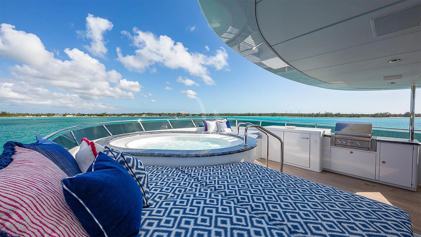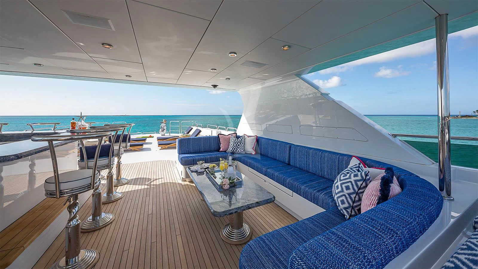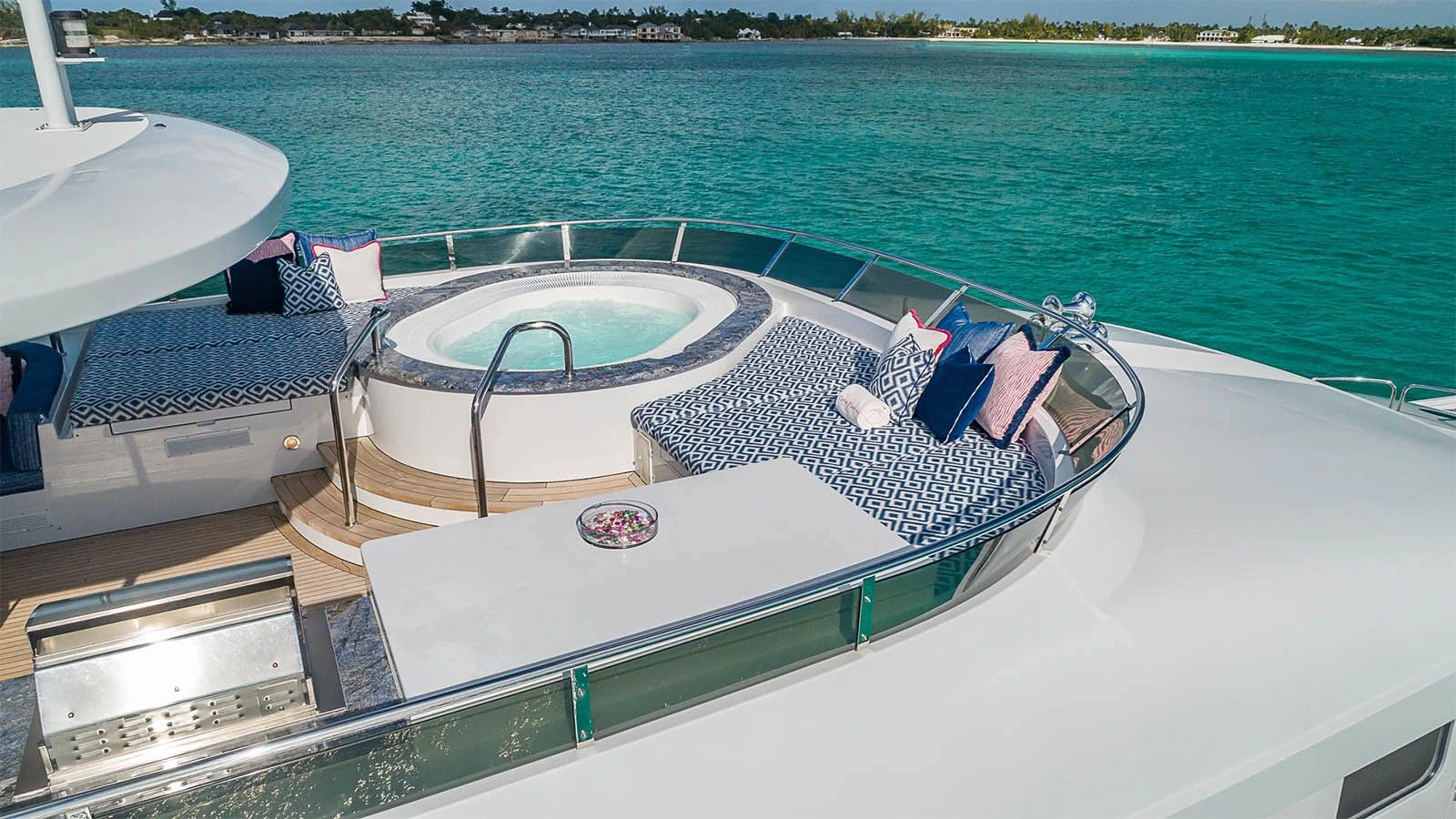 The luxury superyacht showcases outdoor living spaces that guests are sure to fall in love with. CARTE BLANCHE’s sundeck offers guests a variety of options for guest enjoyment. The perfectly poised Jacuzzi surrounded by sunpads forward provides some of the best views aboard with unobstructed endless views of the destination. In the center of the sundeck are a shaded full-service bar and U-shaped dinette. Aft is chaise loungers for sunbathing. Additional alfresco dining is found on the skylounge and main deck.