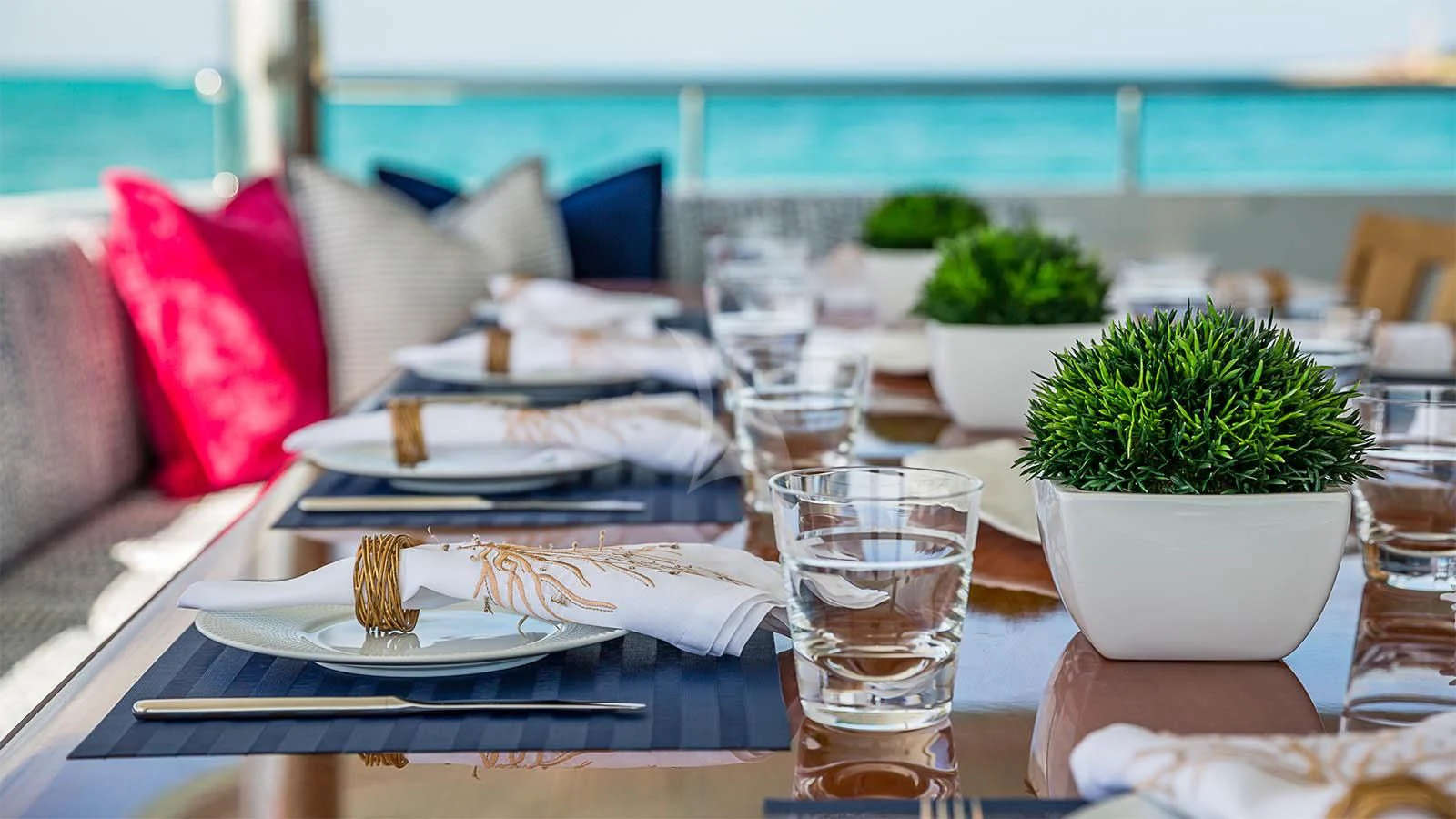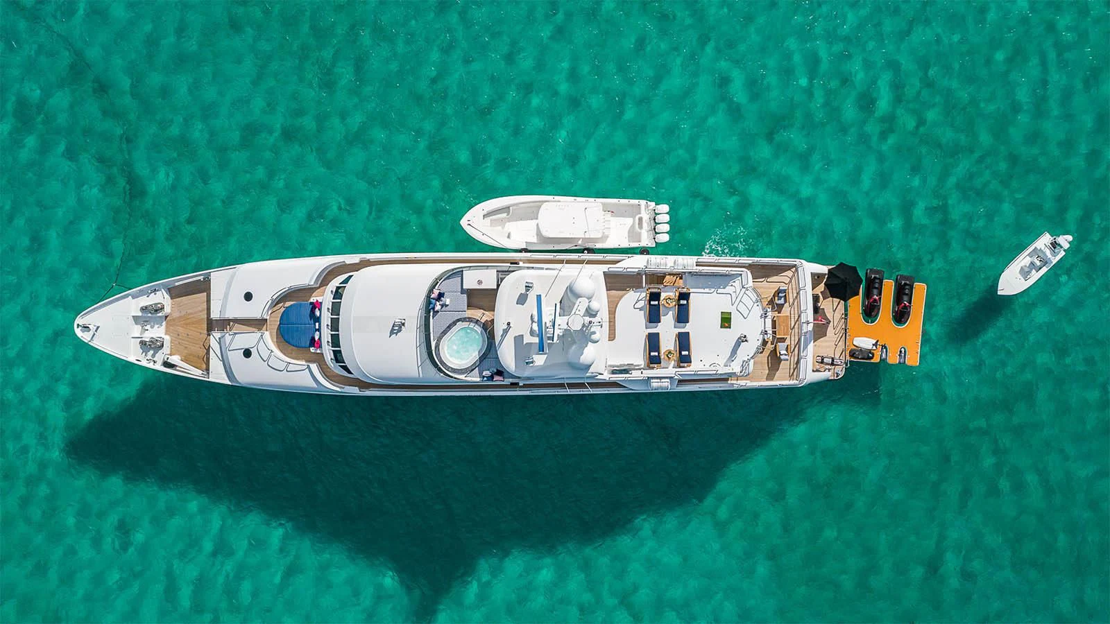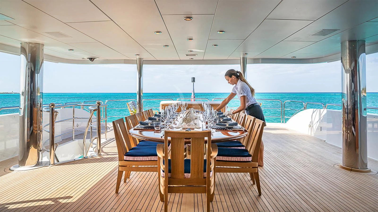The luxury superyacht showcases outdoor living spaces that guests are sure to fall in love with. CARTE BLANCHE’s sundeck offers guests a variety of options for guest enjoyment. The perfectly poised Jacuzzi surrounded by sunpads forward provides some of the best views aboard with unobstructed endless views of the destination. In the center of the sundeck are a shaded full-service bar and U-shaped dinette. Aft is chaise loungers for sunbathing. Additional alfresco dining is found on the skylounge and main deck.