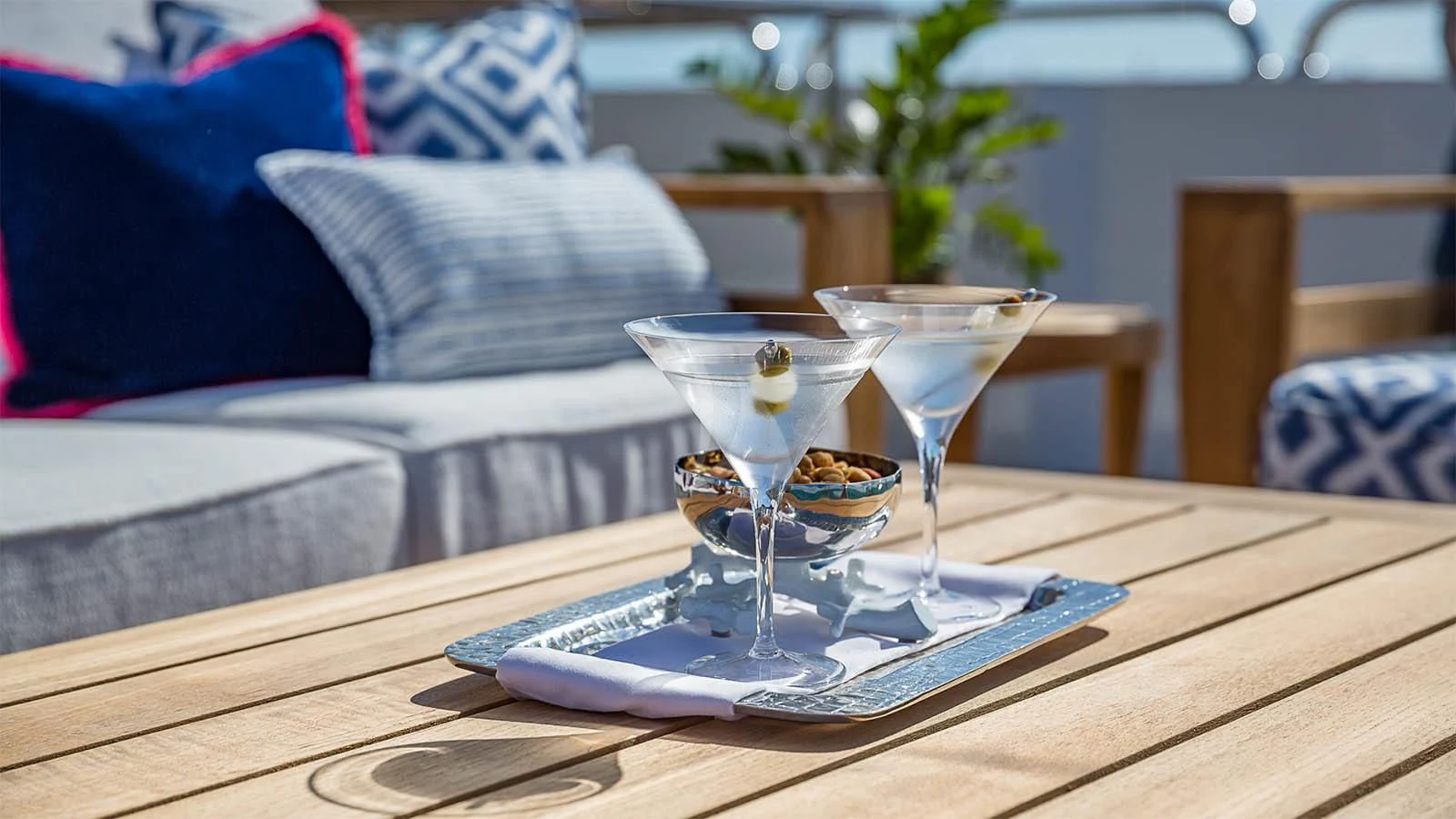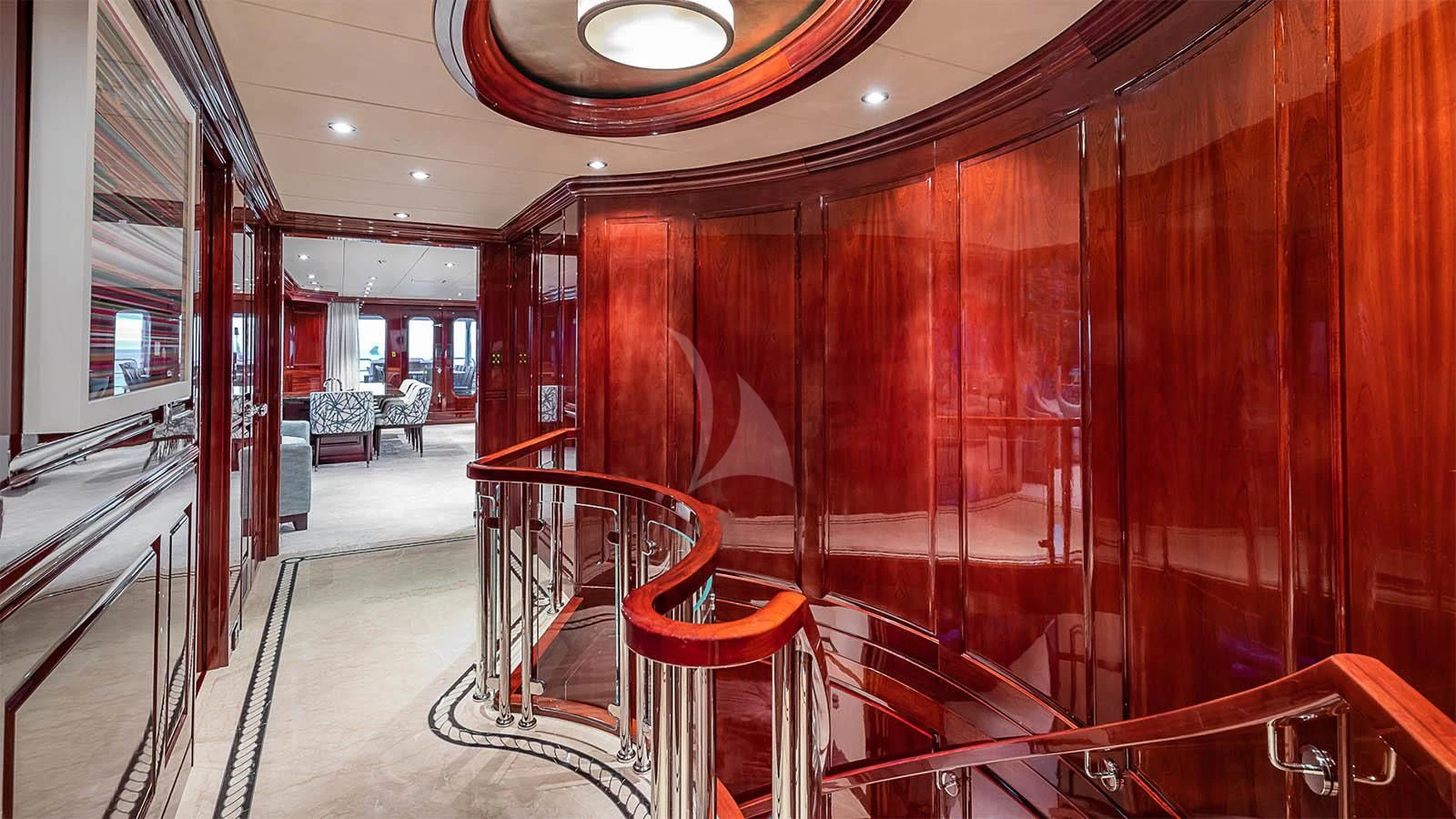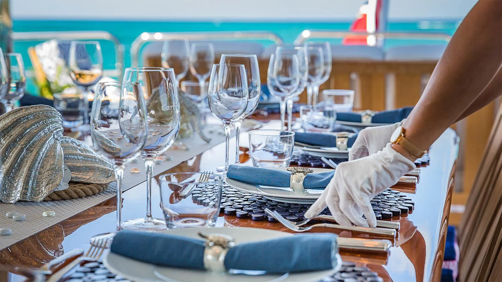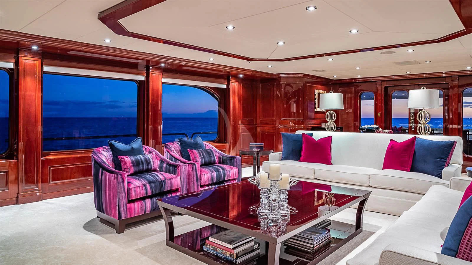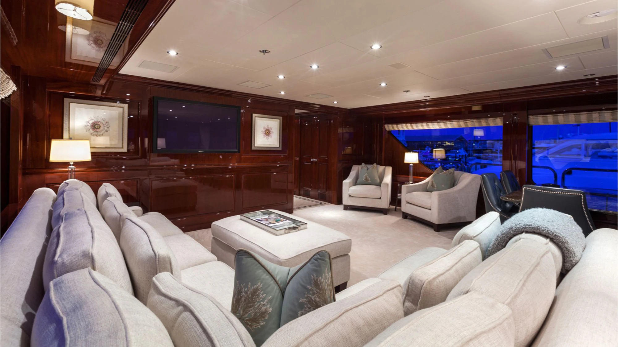 Designed by Carol Williamson & Associates, CARTE BLANCHE showcases a modern and sophisticated interior with beautiful mahogany wood throughout. Her living spaces are well-appointed for relaxing and socializing with ample seating. The yacht features near floor-to-ceiling windows in the main salon, filling the space with an abundance of natural light and impressive views. Forward of the main salon is the yacht’s formal dining where the chef will tantalize palettes with bespoke menus. In the skylounge, the superyacht features a game table where charter guests can play a card or board games.