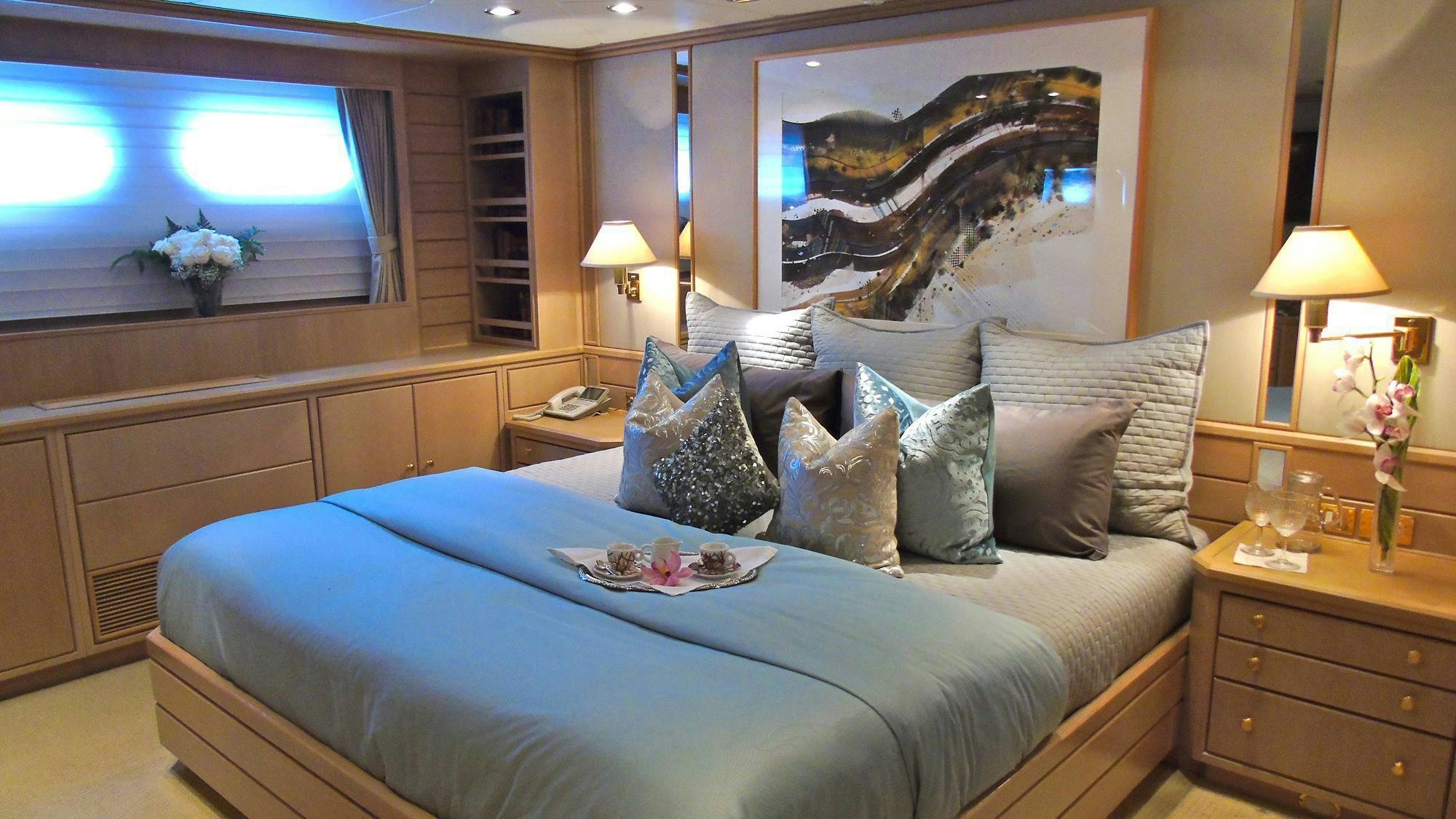 CHANTAL MA VIE has six staterooms sleeping 12 guests. Her luxurious master stateroom is located on the main deck. It boasts a king-sized bed, a private office, full-width bathroom with Jacuzzi and generous walk-in closets. The VIP stateroom also offers a king-sized bed and Jacuzzi bath and is located forward on the lower deck.